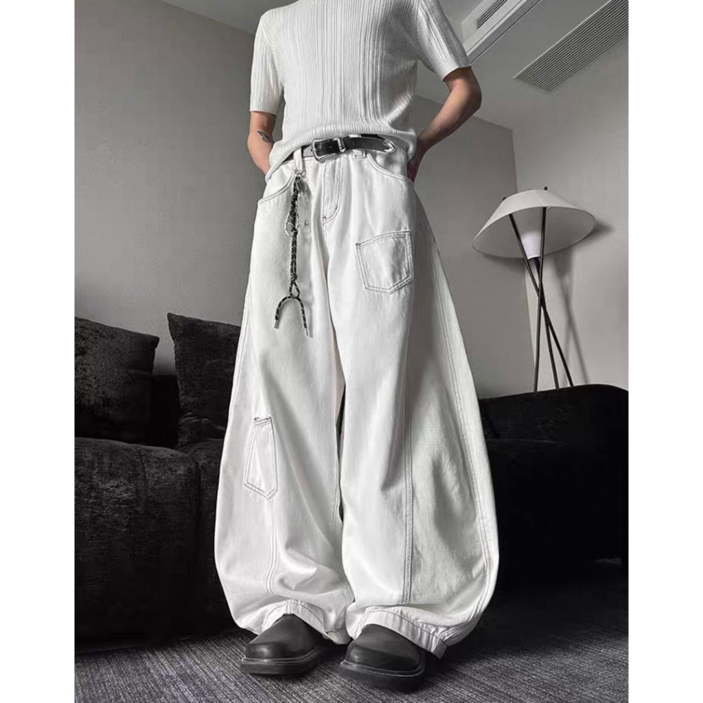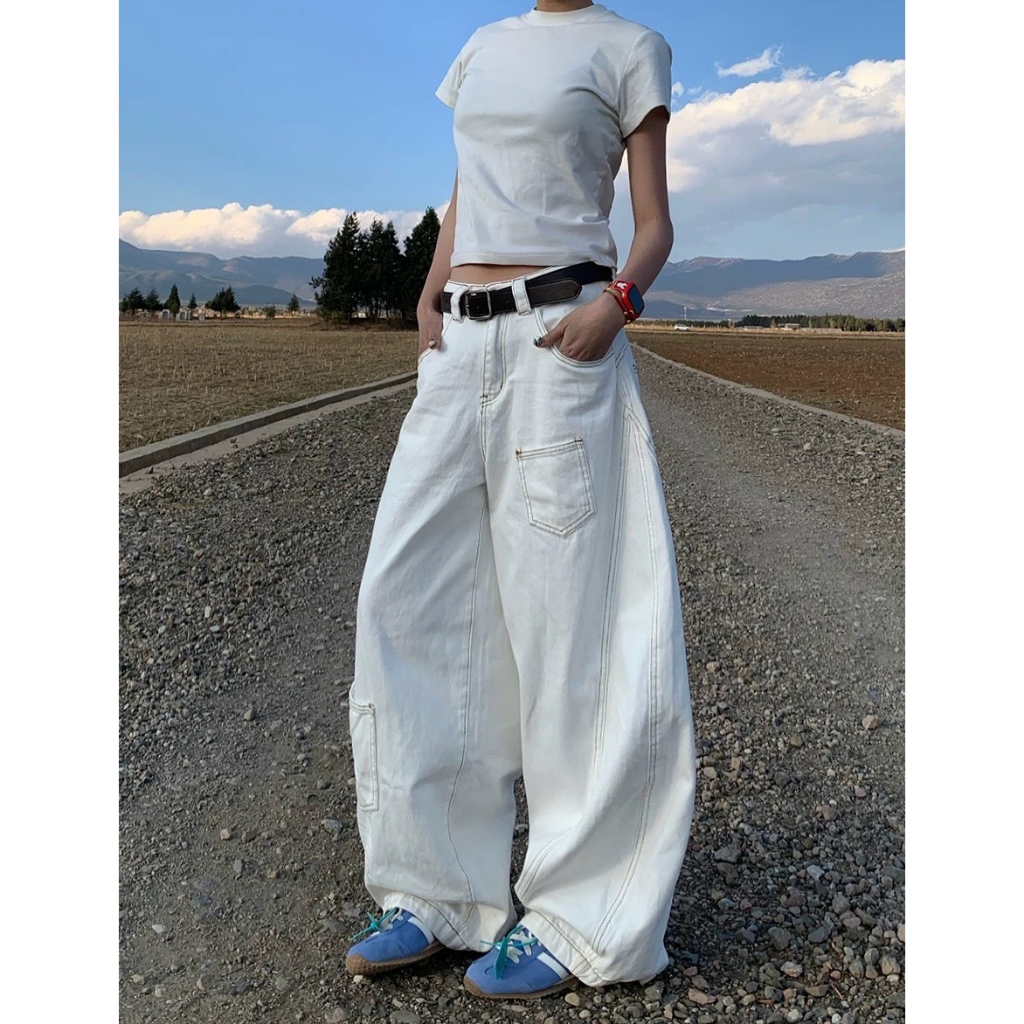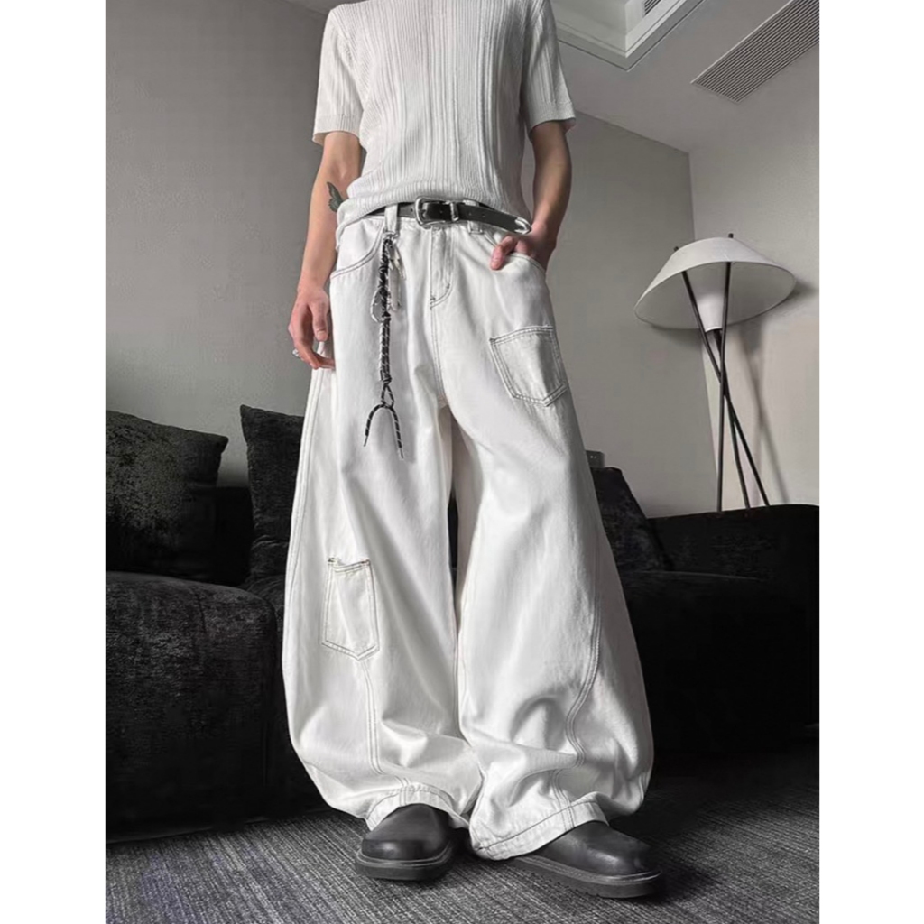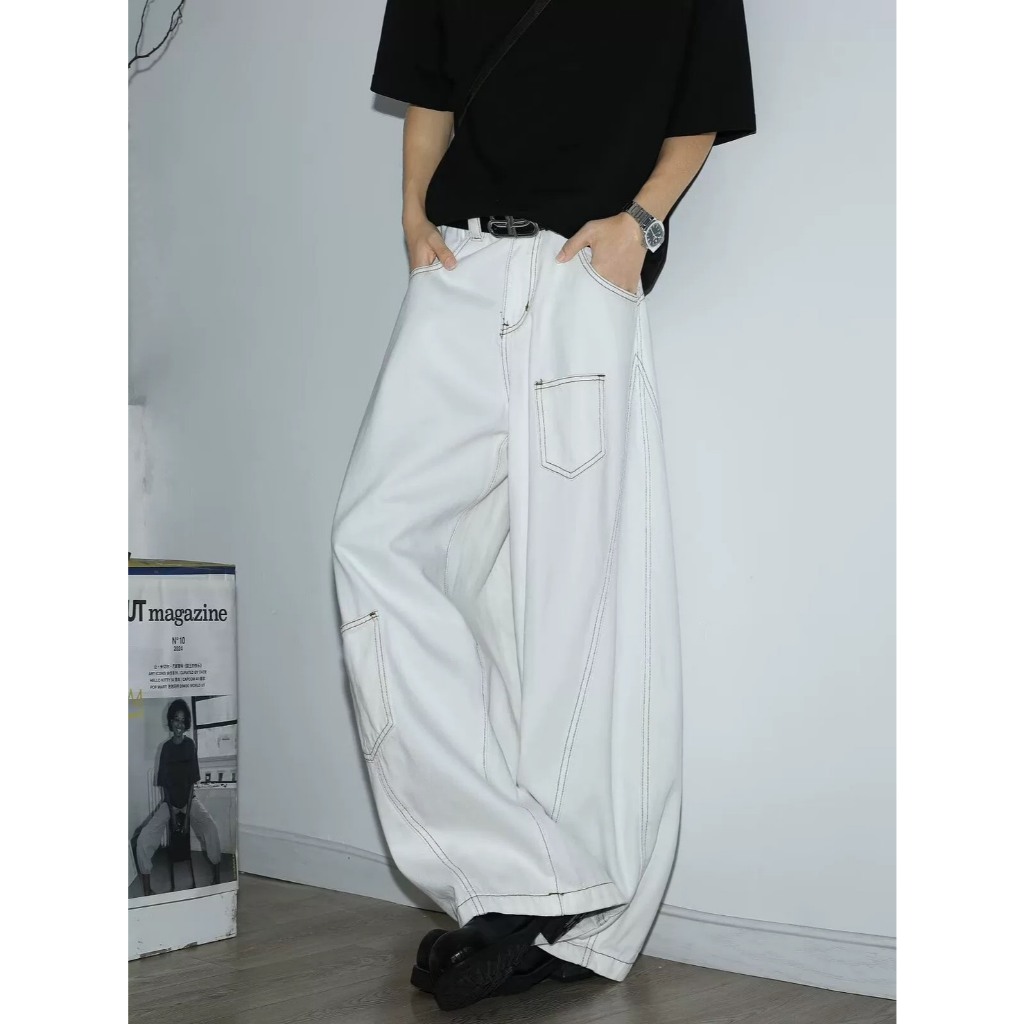 【K-2】美式復古 白色彎刀褲 明線造型 口袋拼接 彎刀褲 白色長褲 闊腿褲 寬褲 牛仔褲 長褲 Y2K【JN6050】M|L|XL|XXLK-2 Fashionboy