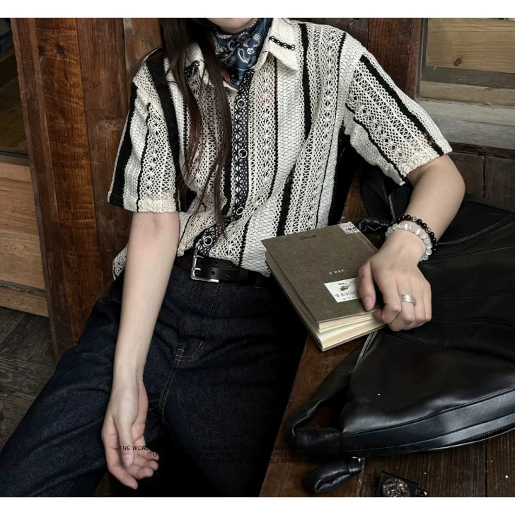 【K-2】日系復古 條紋 簍空襯衫 透視感 洞洞 短袖襯衫 Y2K襯衫 古著 襯衫 春夏 提花 圖騰 K【JA6733】