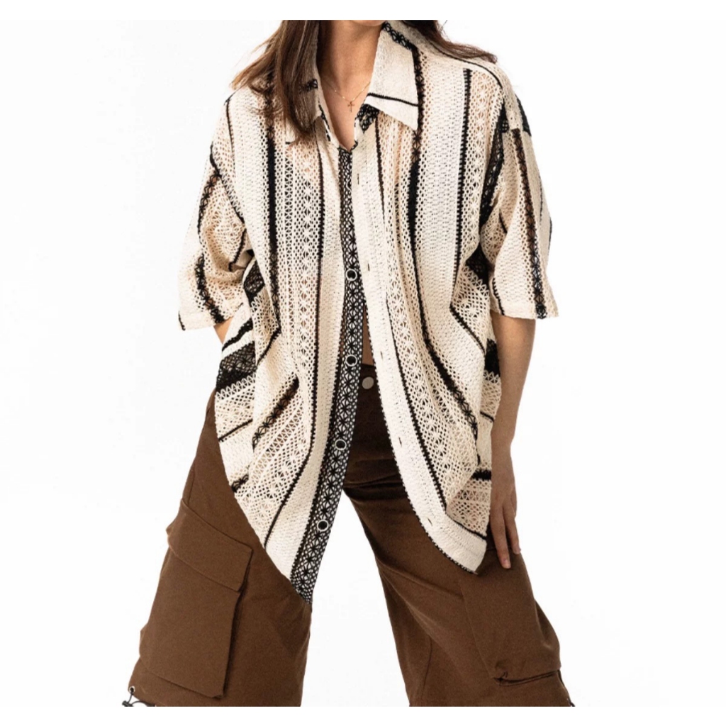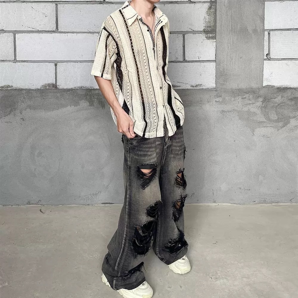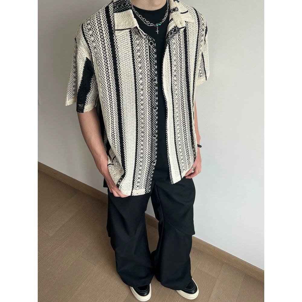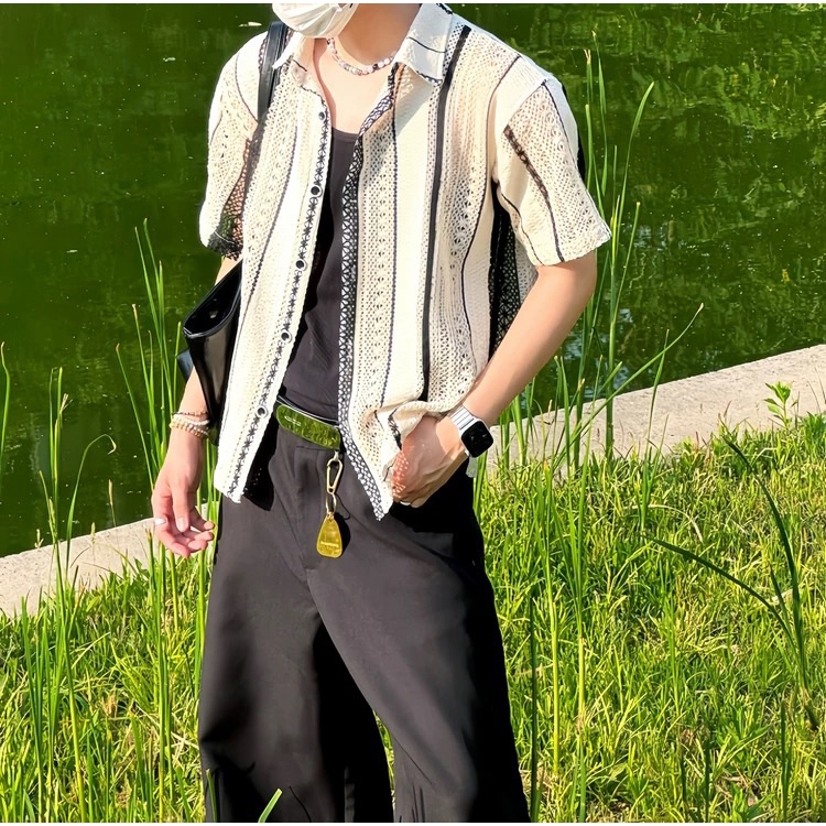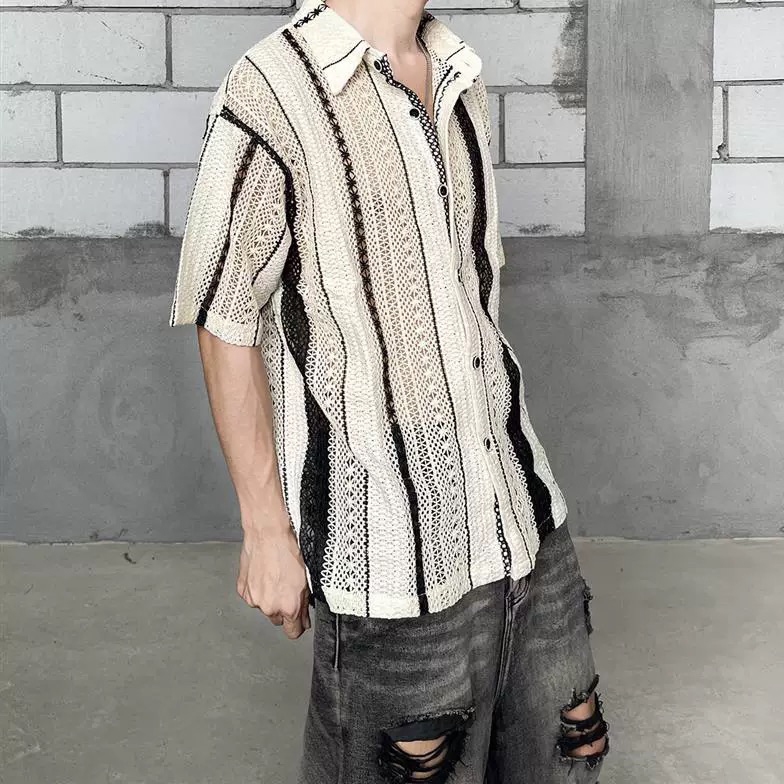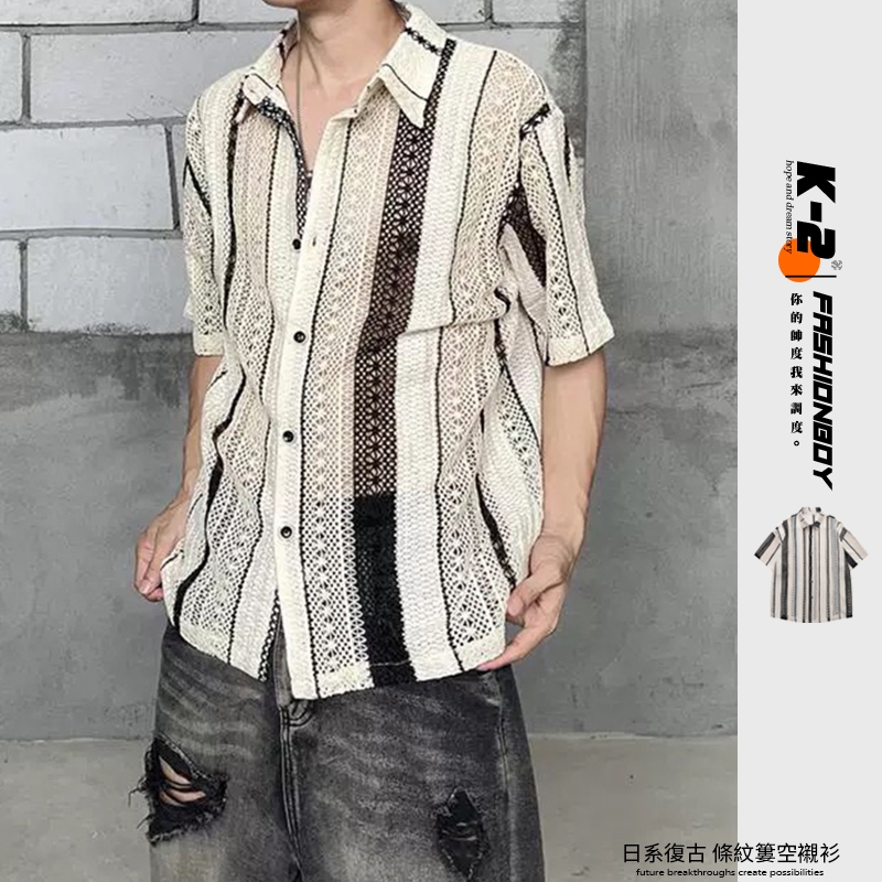 【K-2】日系復古 條紋 簍空襯衫 透視感 洞洞 短袖襯衫 Y2K襯衫 古著 襯衫 春夏 提花 圖騰 K【JA6733】M|LShirtsK-2 Fashionboy