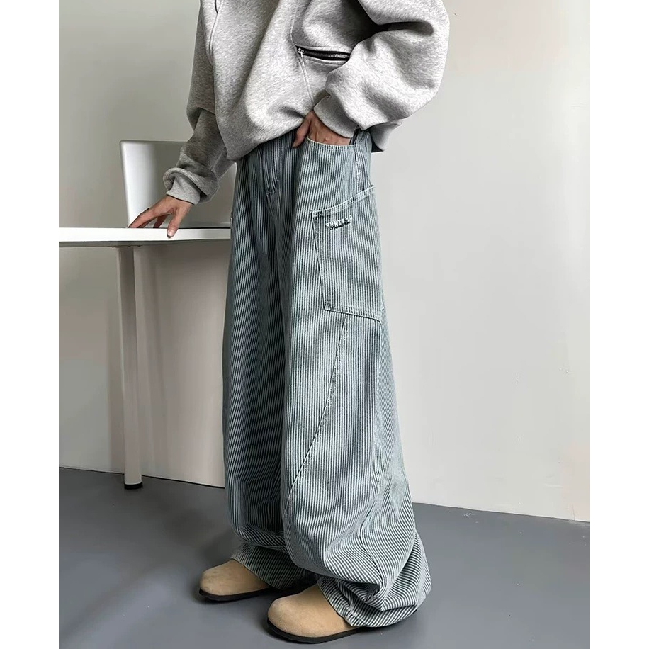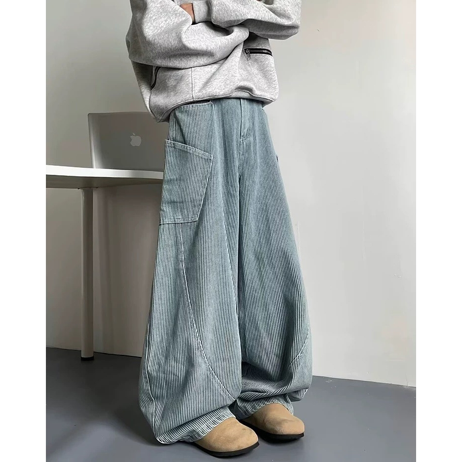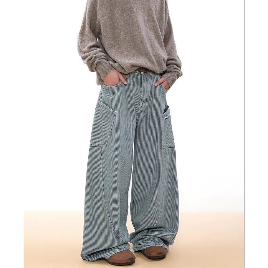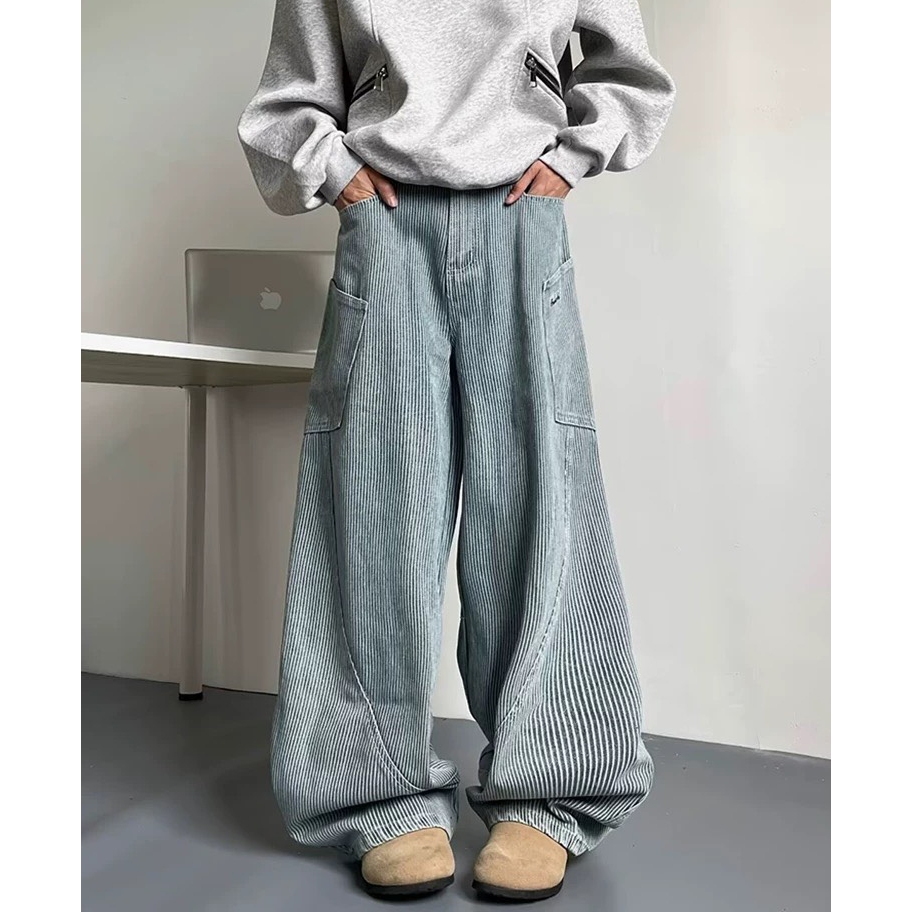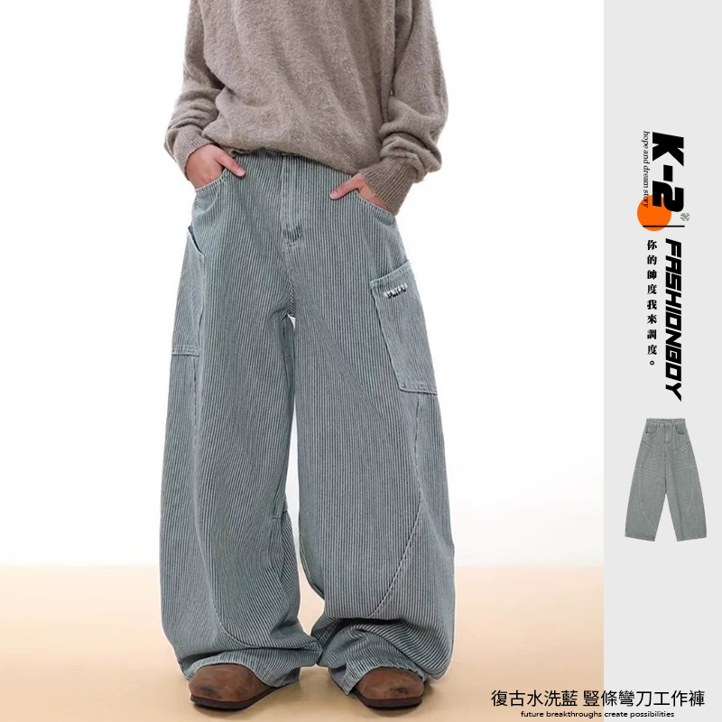 【K-2】美式復古 水洗藍 豎條 條紋 彎刀褲 工作褲 特殊設計 寬褲 闊腿褲 長褲 坑條 條紋彎刀褲【JNZ120】M|L|XL|XXLCargoK-2 Fashionboy