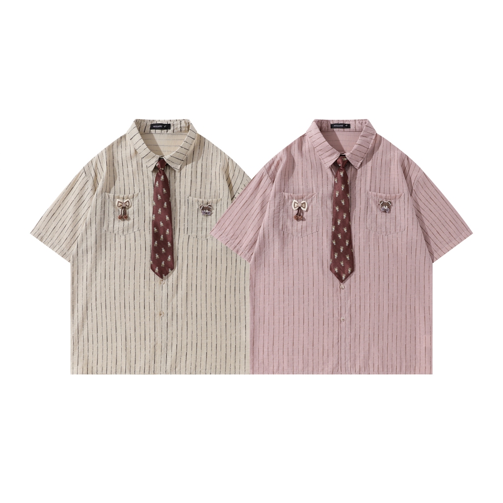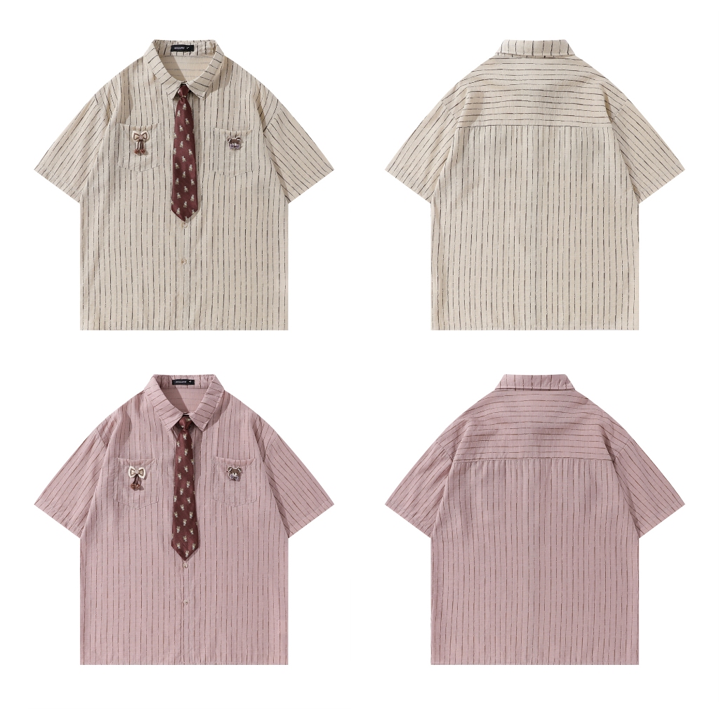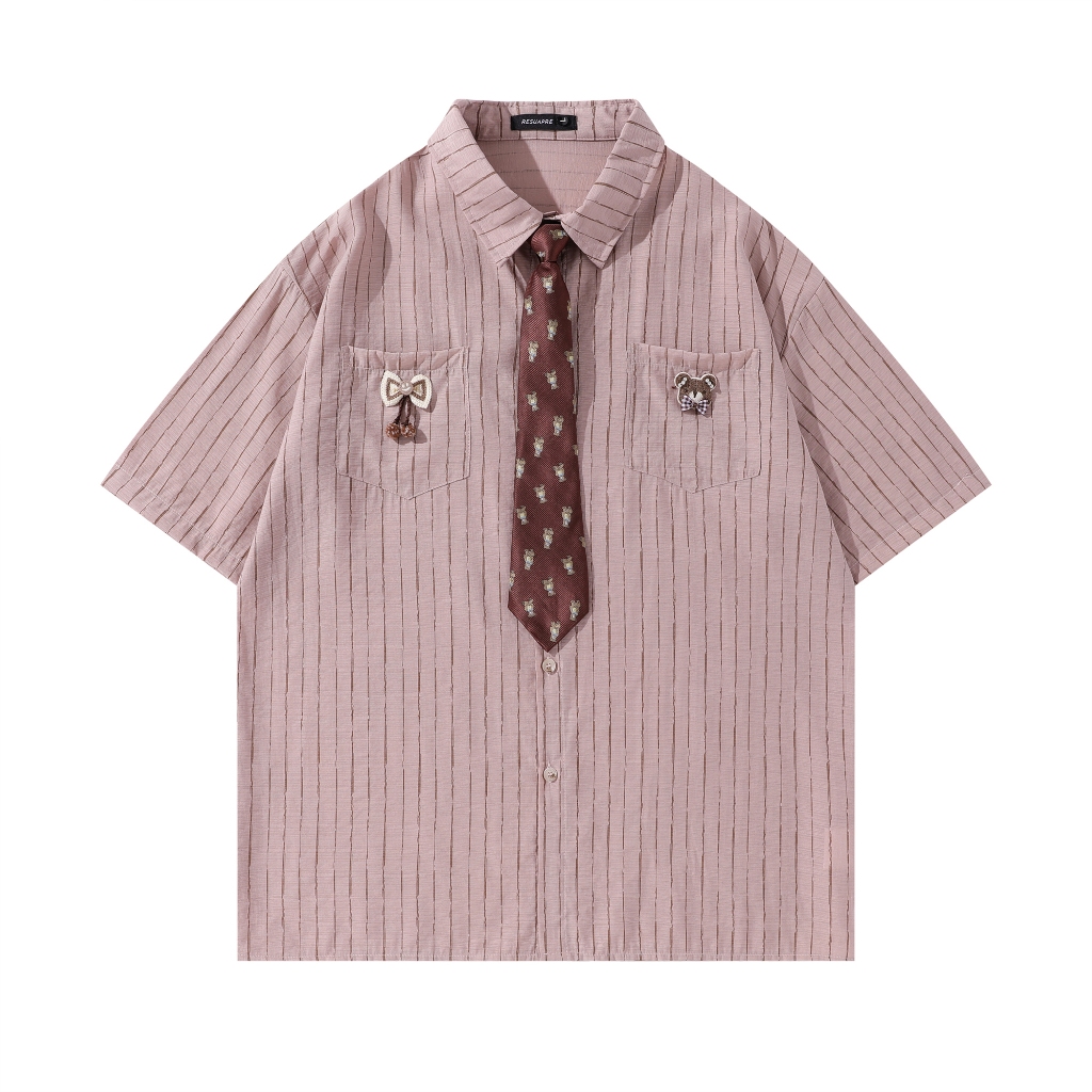 【K-2】日系復古 條紋襯衫 (附領帶) 熊熊刺繡 復古條紋 短袖襯衫 學院風 日系 襯衫 古著 情侶 K2【J212】杏色,M|杏色,L|杏色,XL|粉色,M|粉色,L|粉色,XLShirtsK-2 Fashionboy
