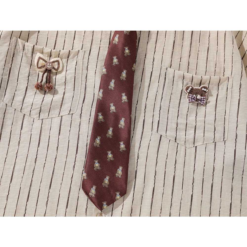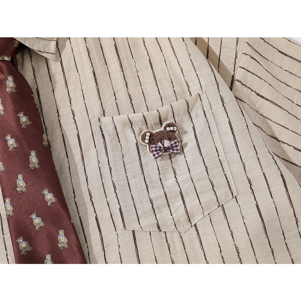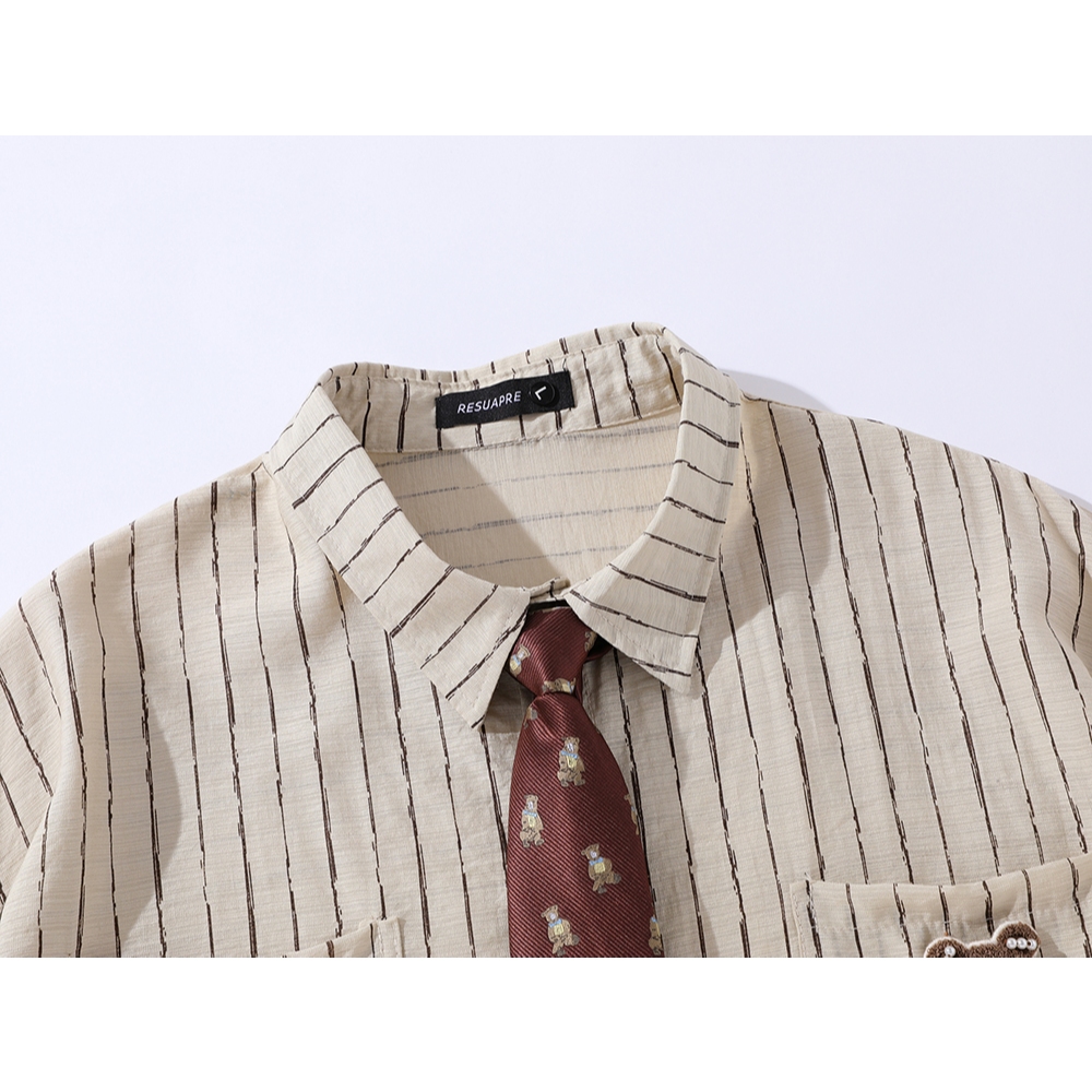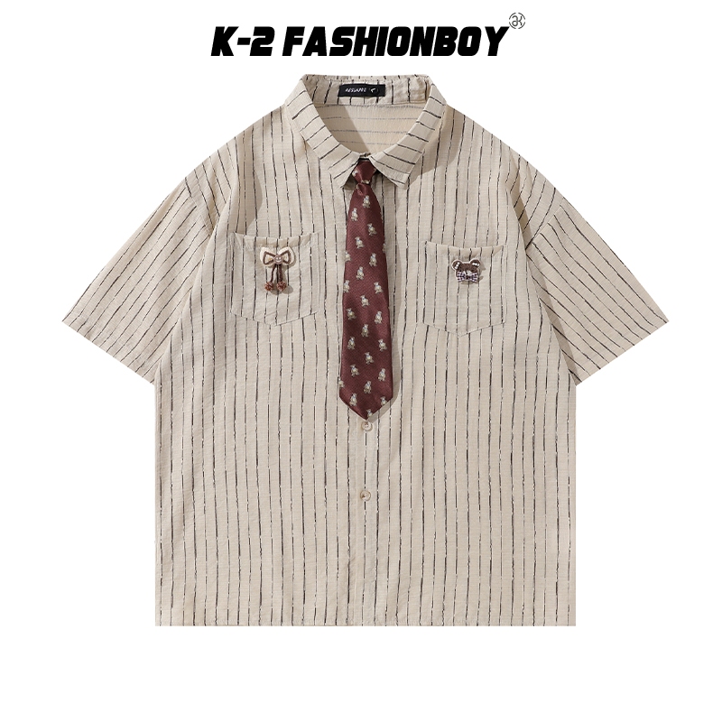 【K-2】日系復古 條紋襯衫 (附領帶) 熊熊刺繡 復古條紋 短袖襯衫 學院風 日系 襯衫 古著 情侶 K2【J212】杏色,M|杏色,L|杏色,XL|粉色,M|粉色,L|粉色,XLShirtsK-2 Fashionboy