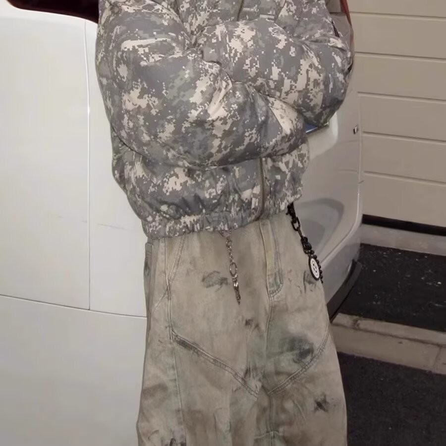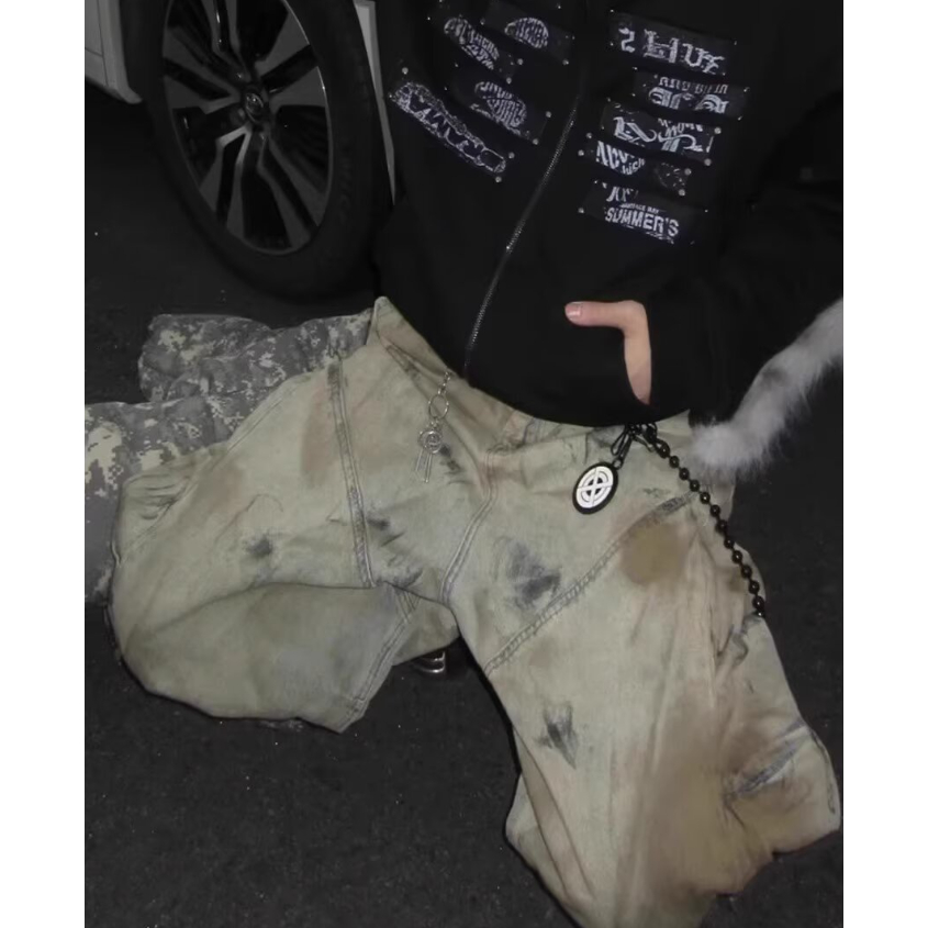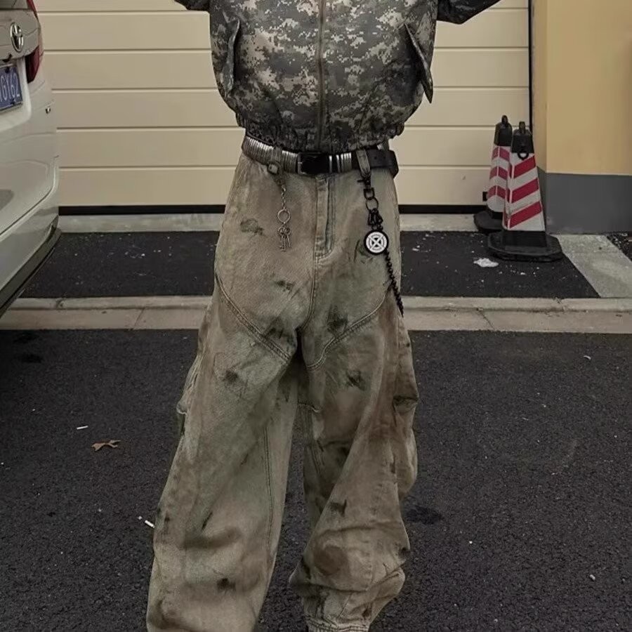 • 【HOT 本舖】男装 美式復古廢土風做舊低襠設計感拼接彎刀牛仔褲男潮牌寬鬆闊腿長褲