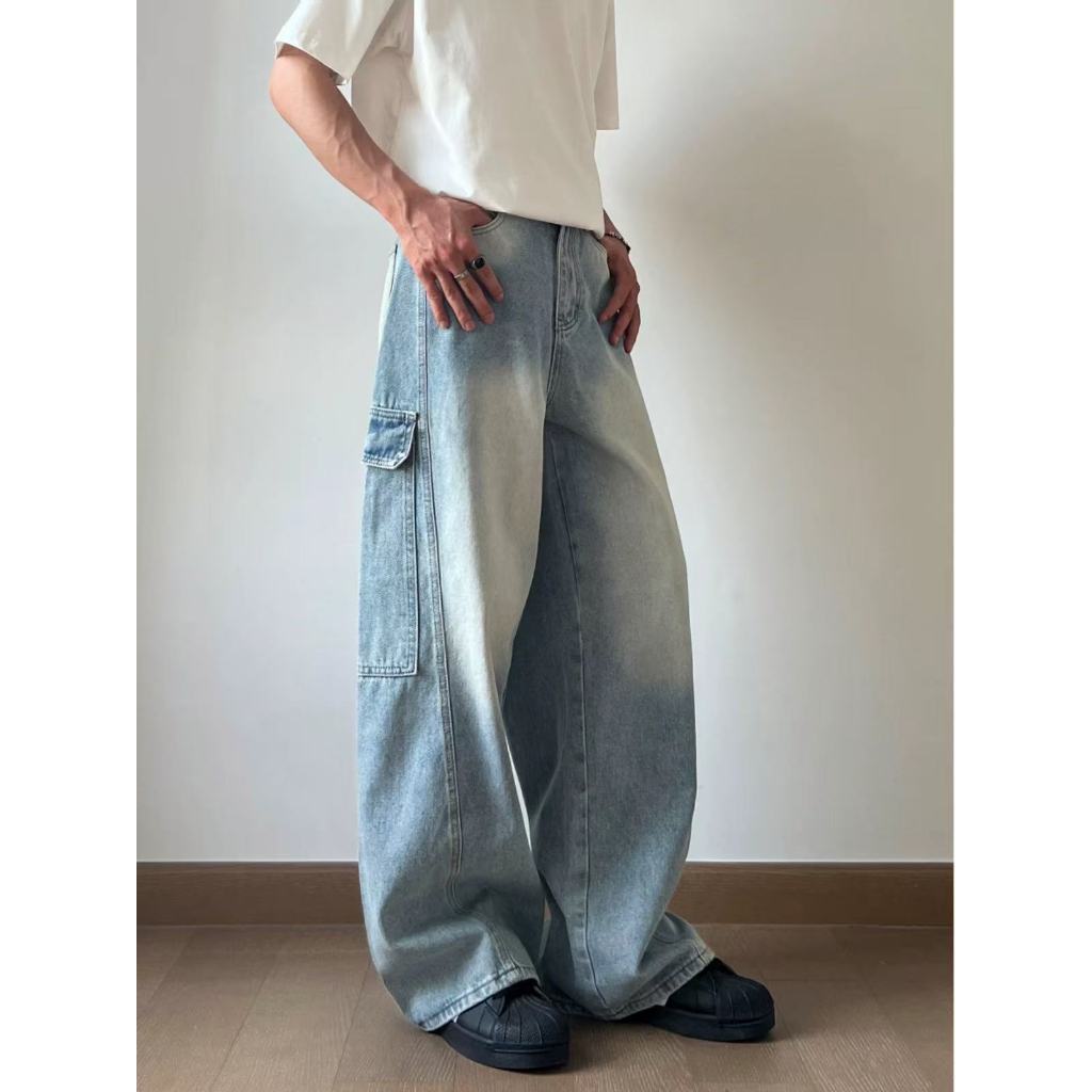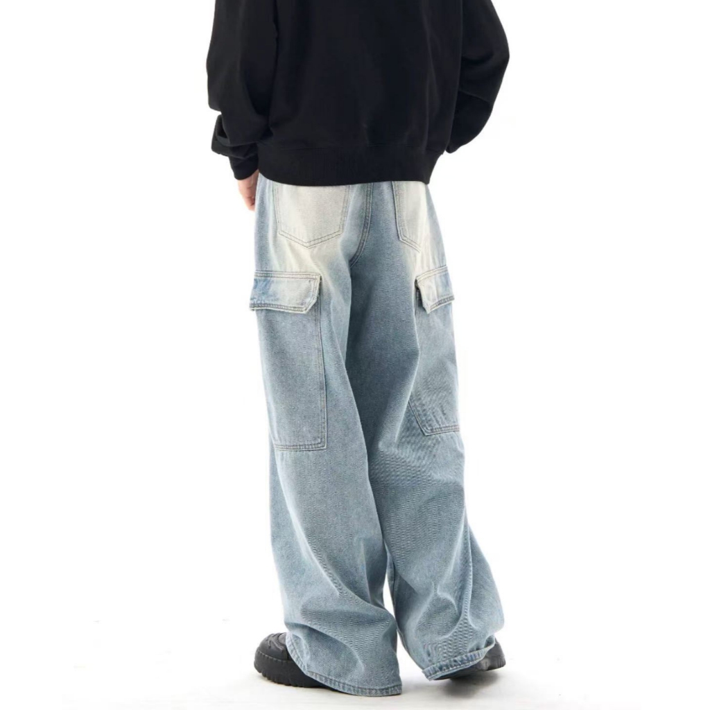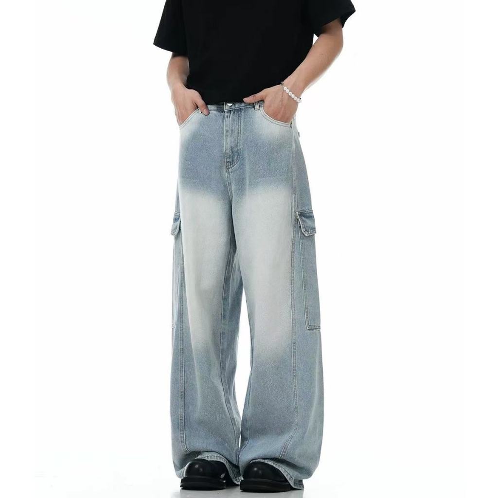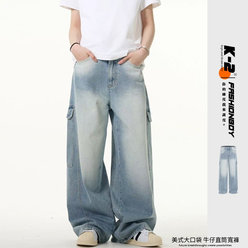 【K-2】美式大口袋 牛仔直筒寬褲 淺藍刷色 復古 刷白 牛仔褲 休閒長褲 直筒褲 寬褲 工作褲 大口袋【JK7065】M|L|XL|XXLK-2 Fashionboy