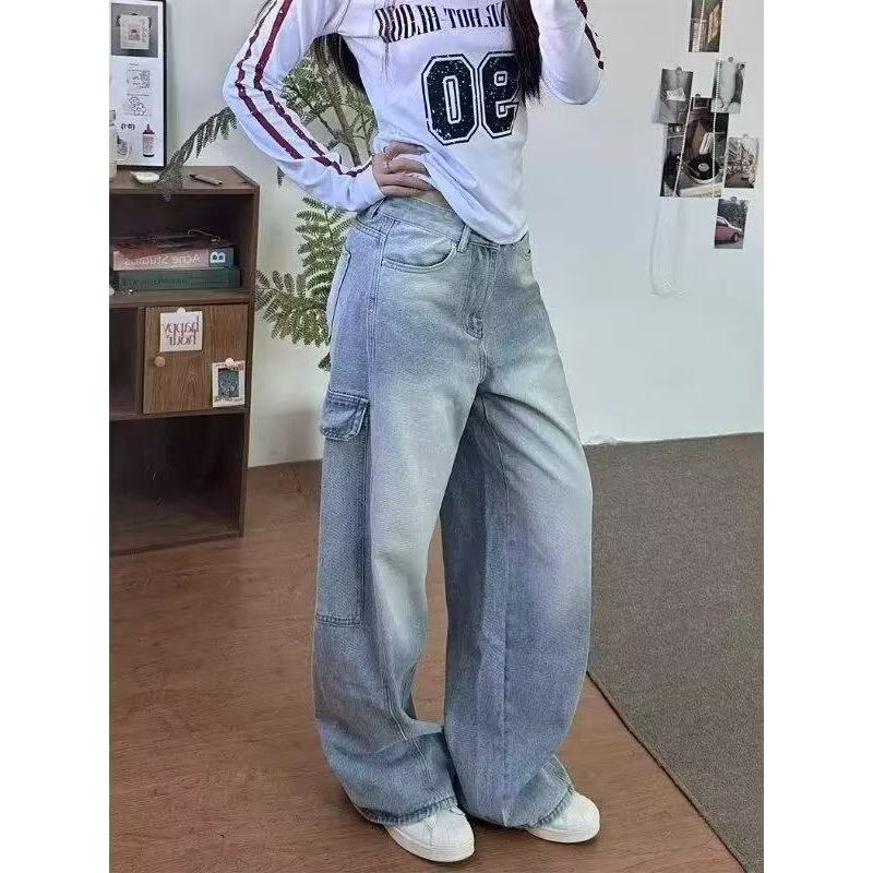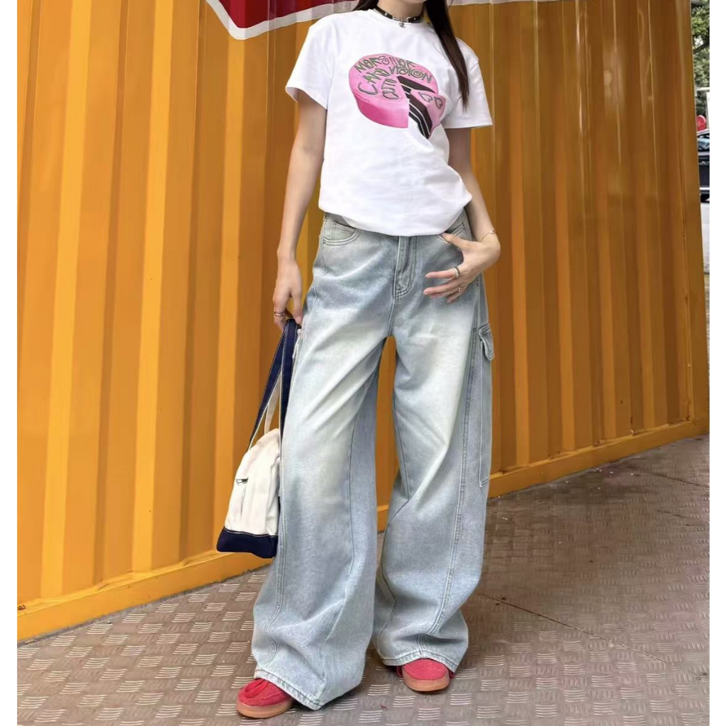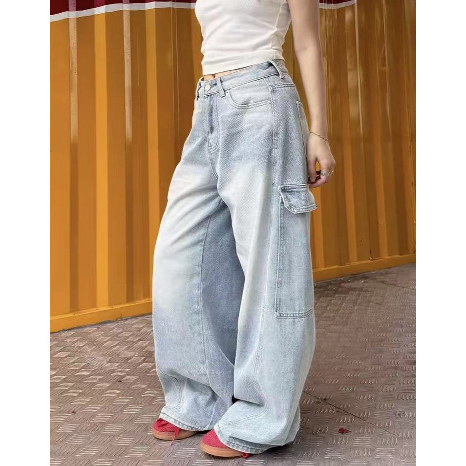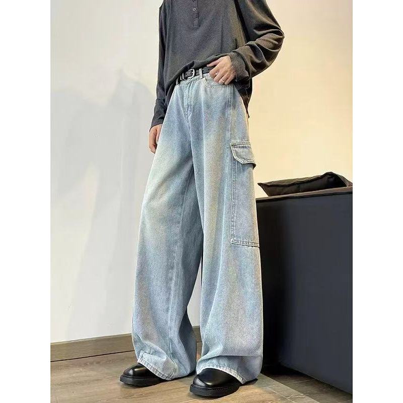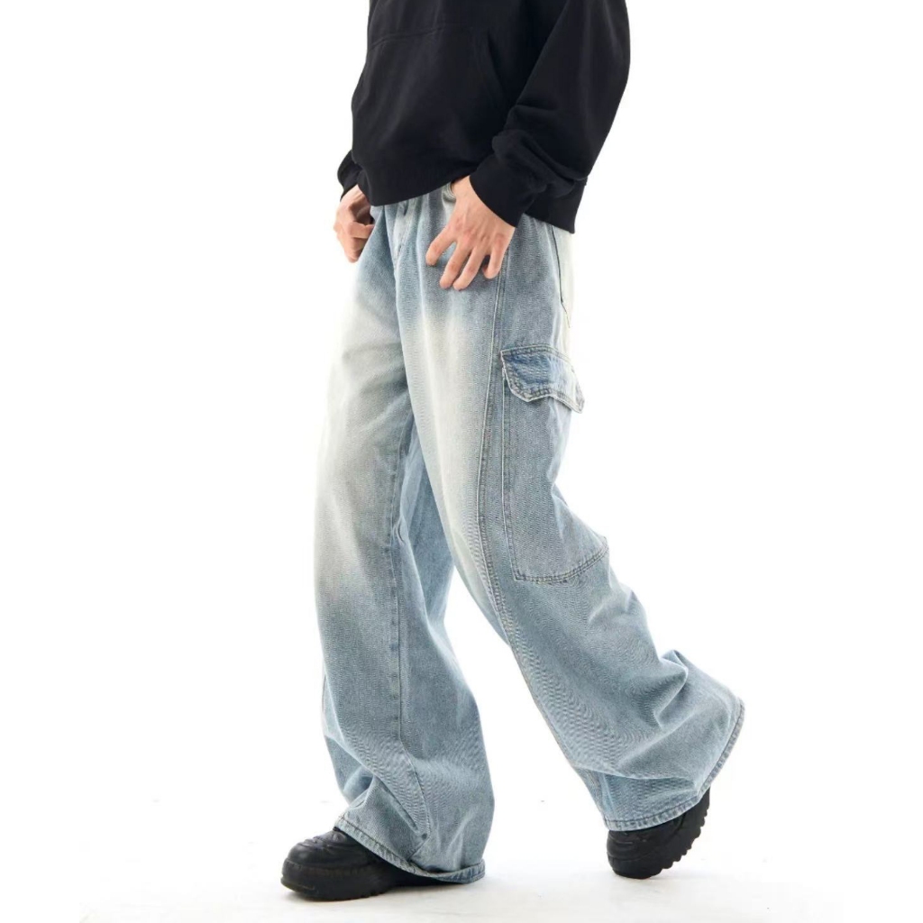 【K-2】美式大口袋 牛仔直筒寬褲 淺藍刷色 復古 刷白 牛仔褲 休閒長褲 直筒褲 寬褲 工作褲 大口袋【JK7065】M|L|XL|XXLK-2 Fashionboy