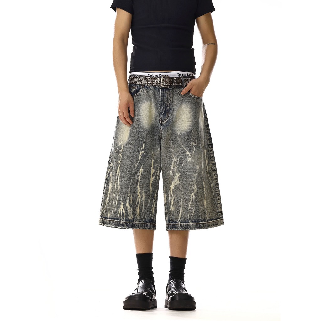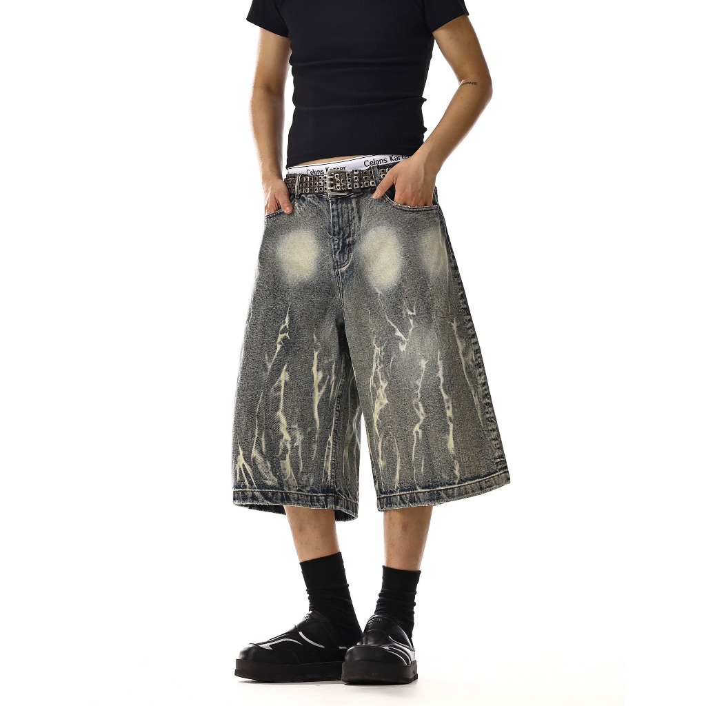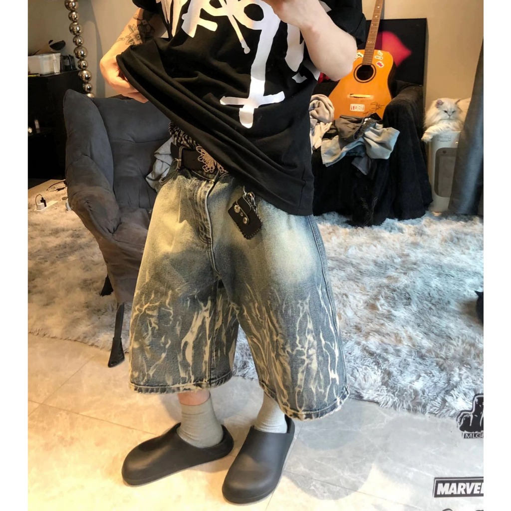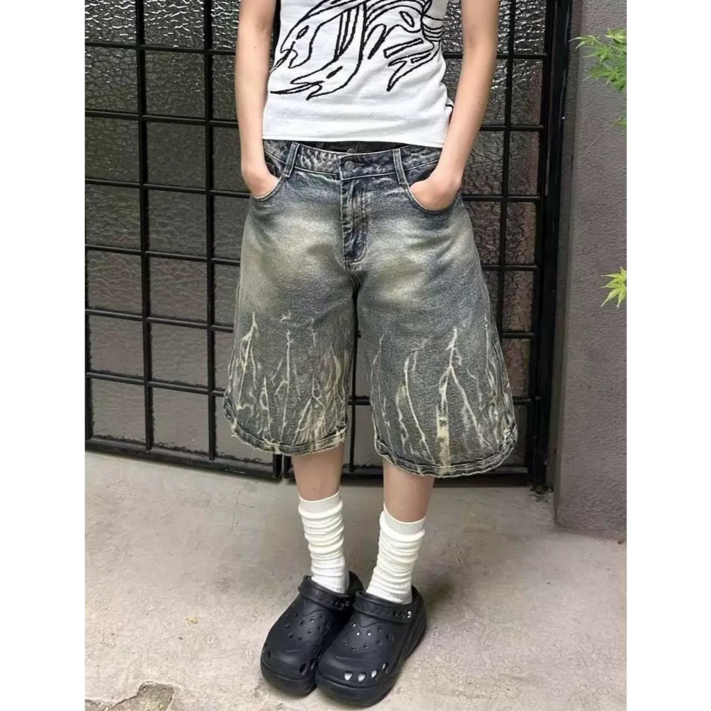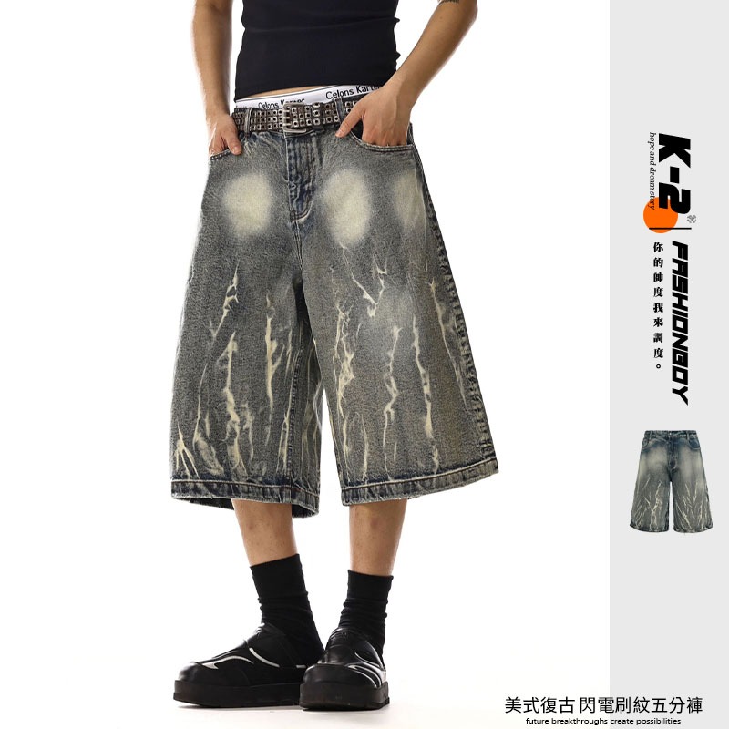 【K-2】美式復古 閃電紋路 水洗 刷紋 五分褲 水洗短褲 閃電 牛仔短褲 復古短褲 短褲 Y2K K2【JN749】M|L|XL|XXLK-2 Fashionboy
