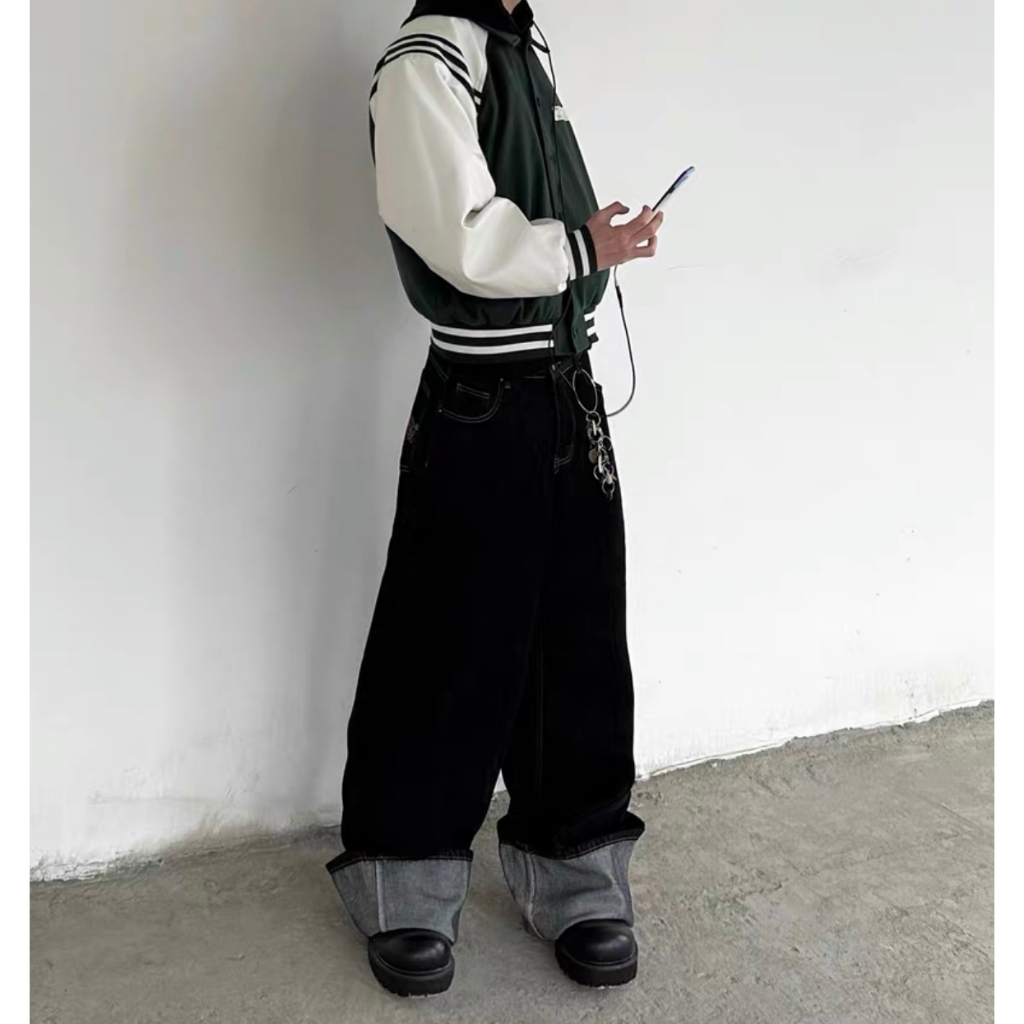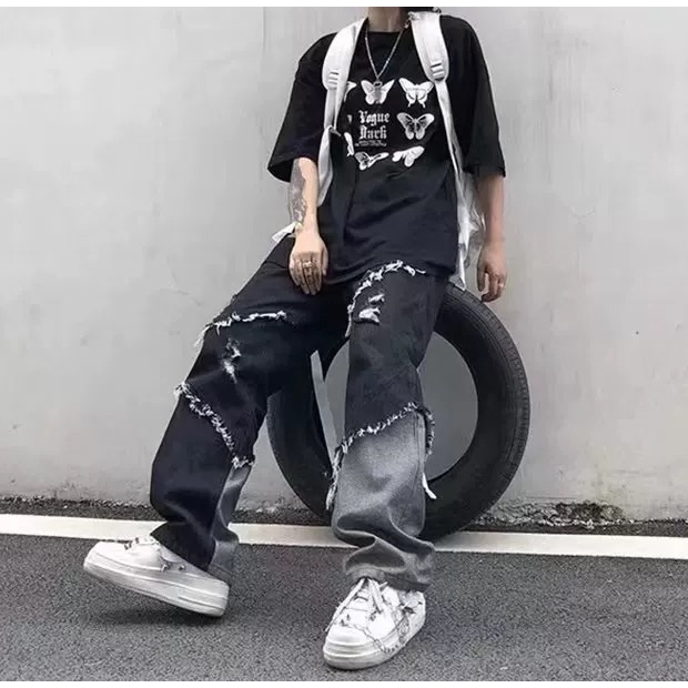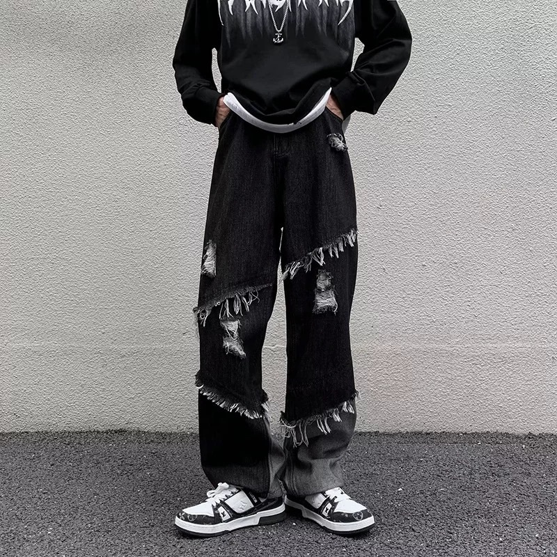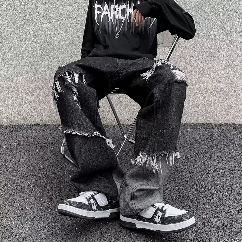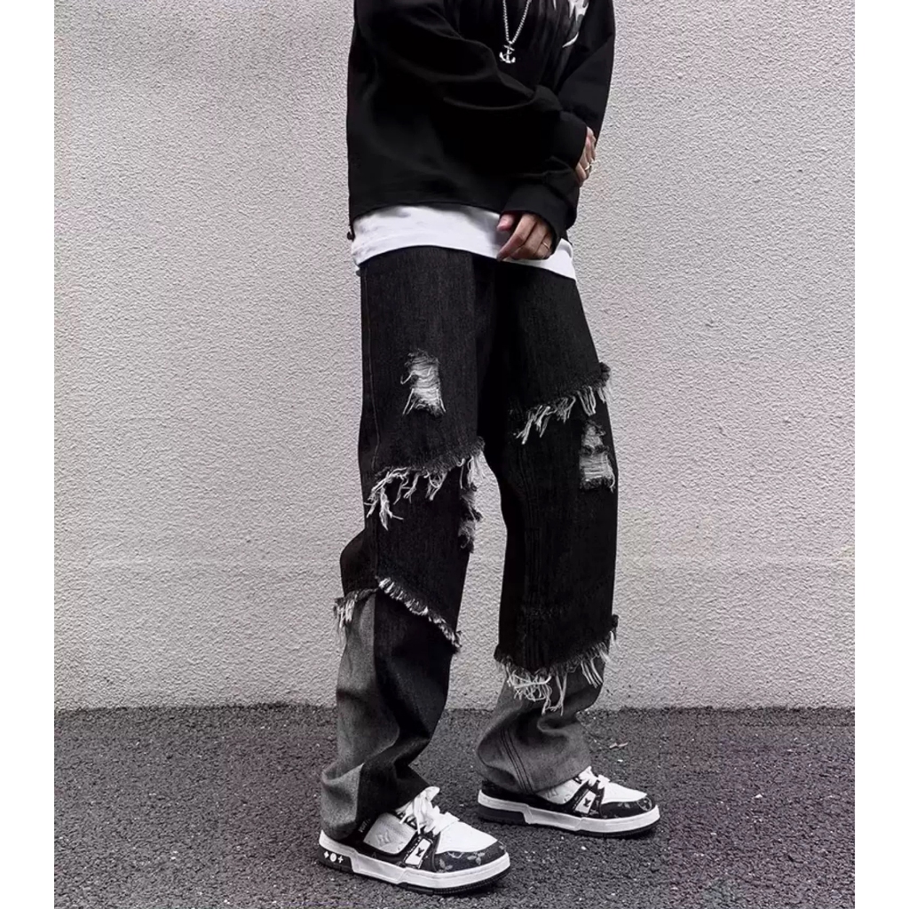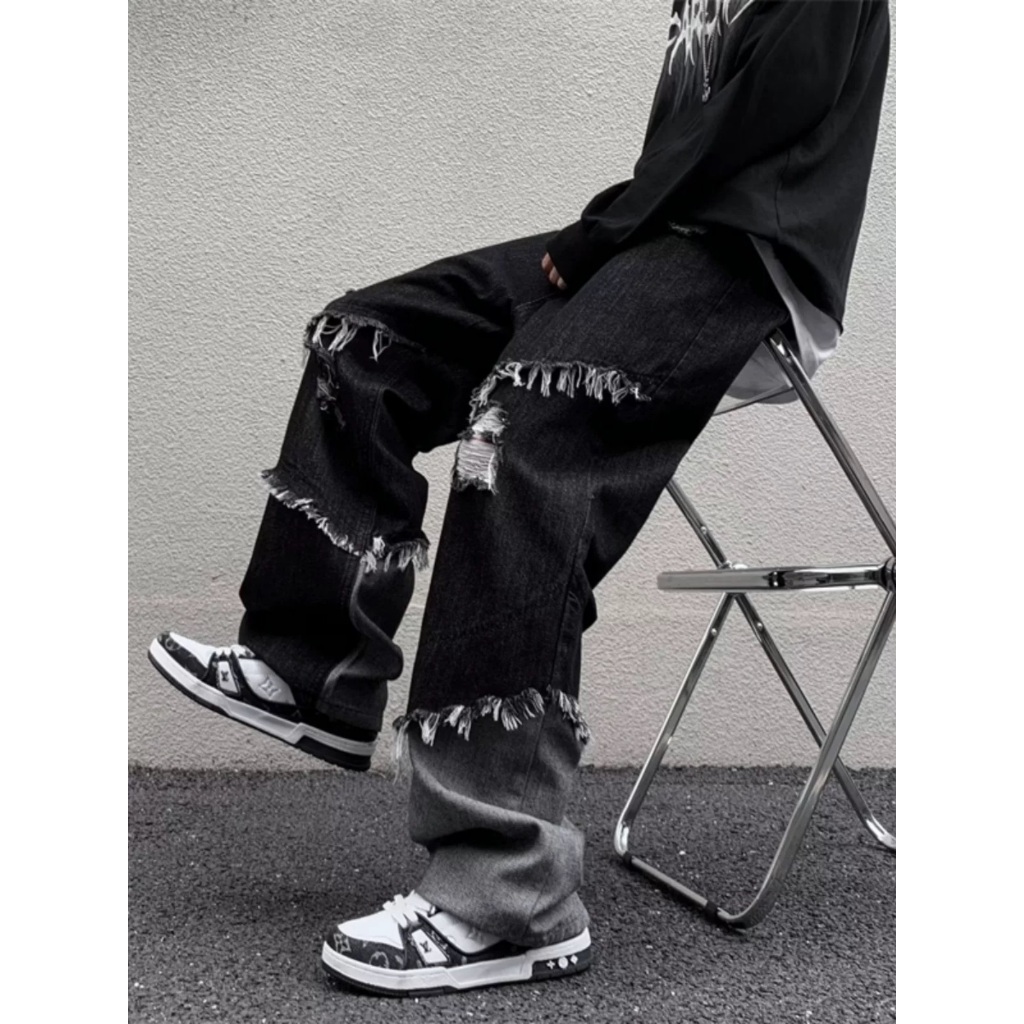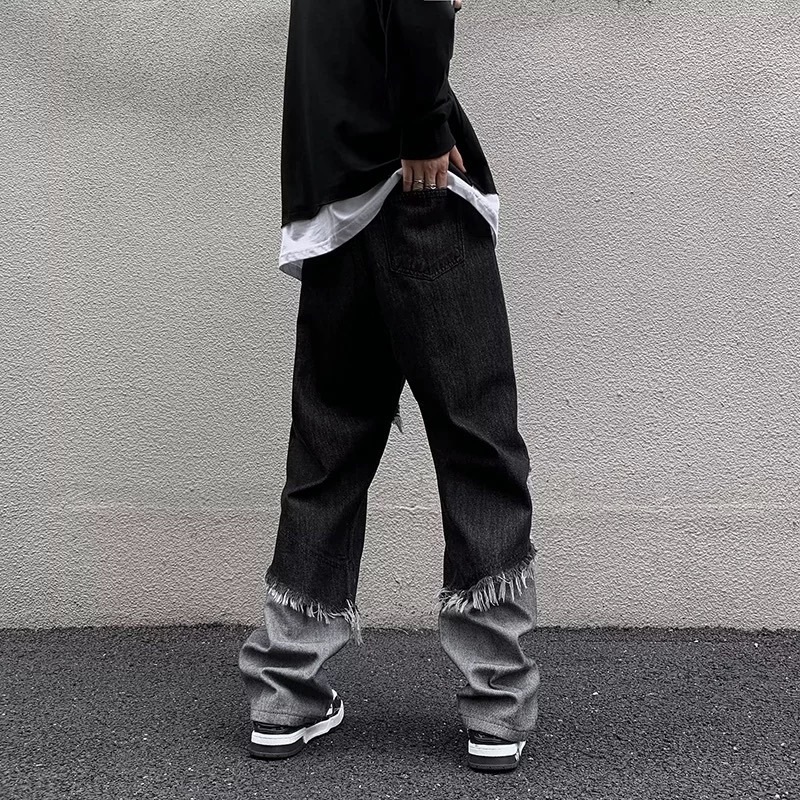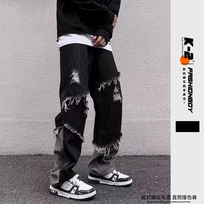 【K-2】美式復古 毛邊環繞 不修編拼接 黑灰撞色 直筒褲 牛仔直筒褲 破褲 高階帝 造型長褲 牛仔褲 精神【J23】M|L|XL|XXLK-2 Fashionboy