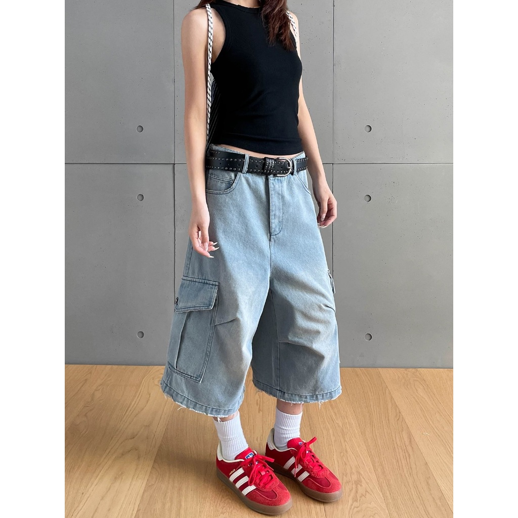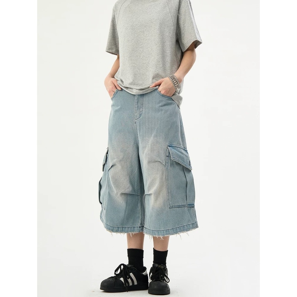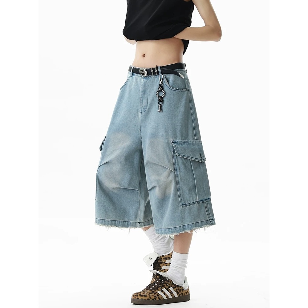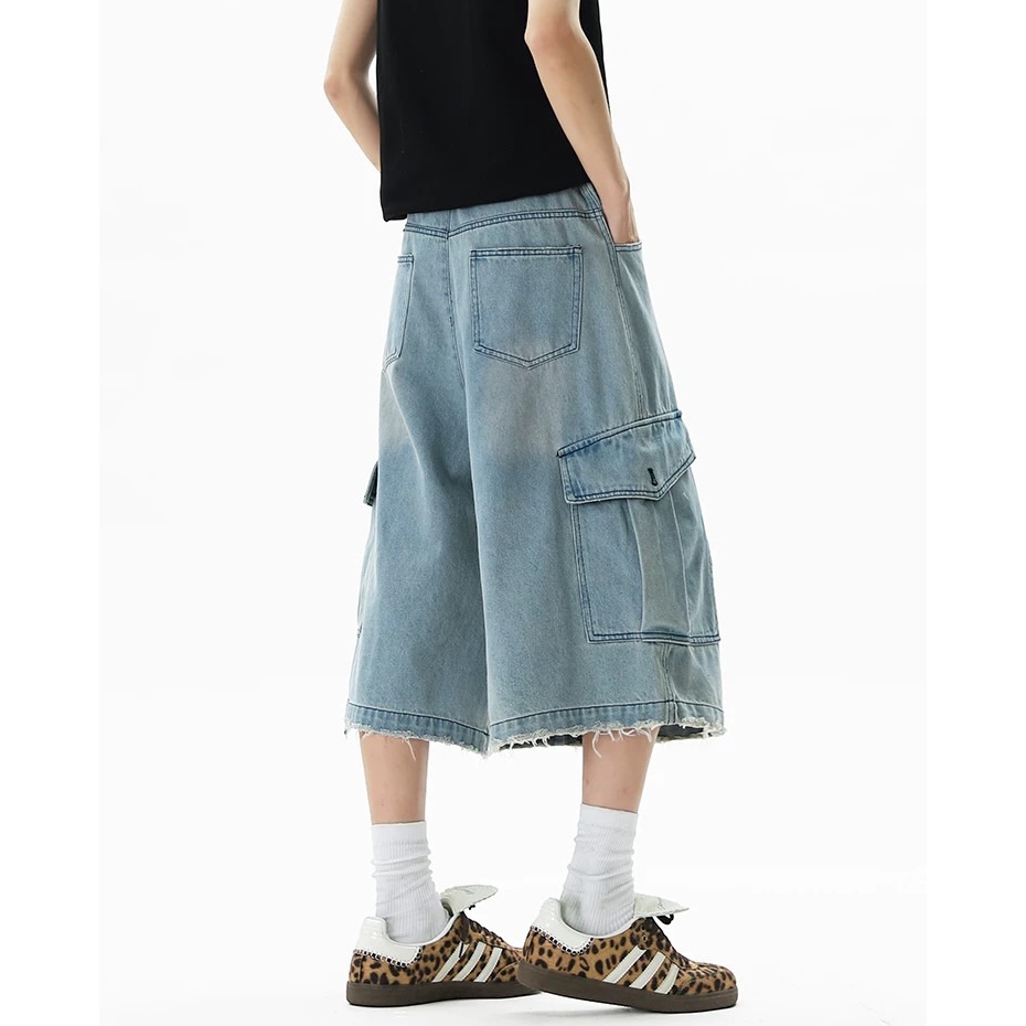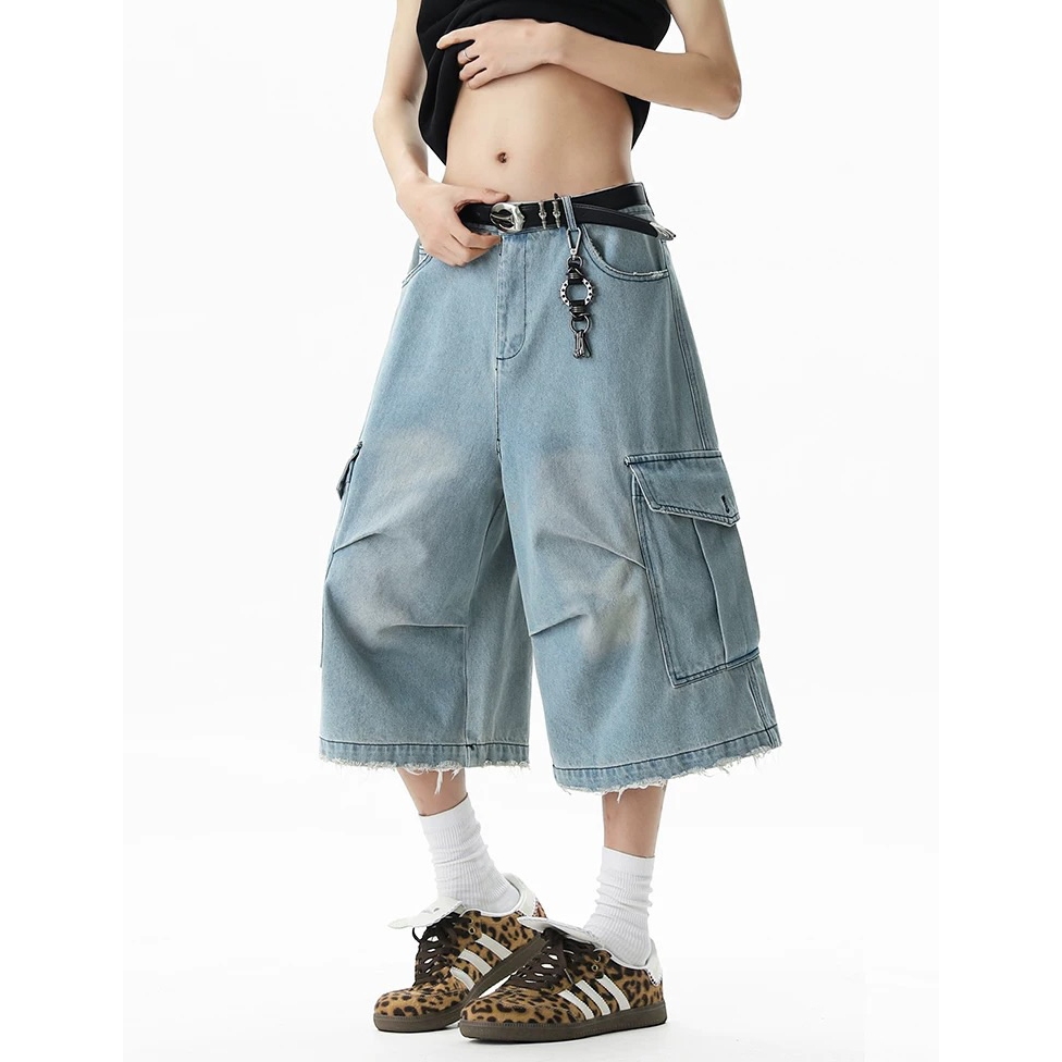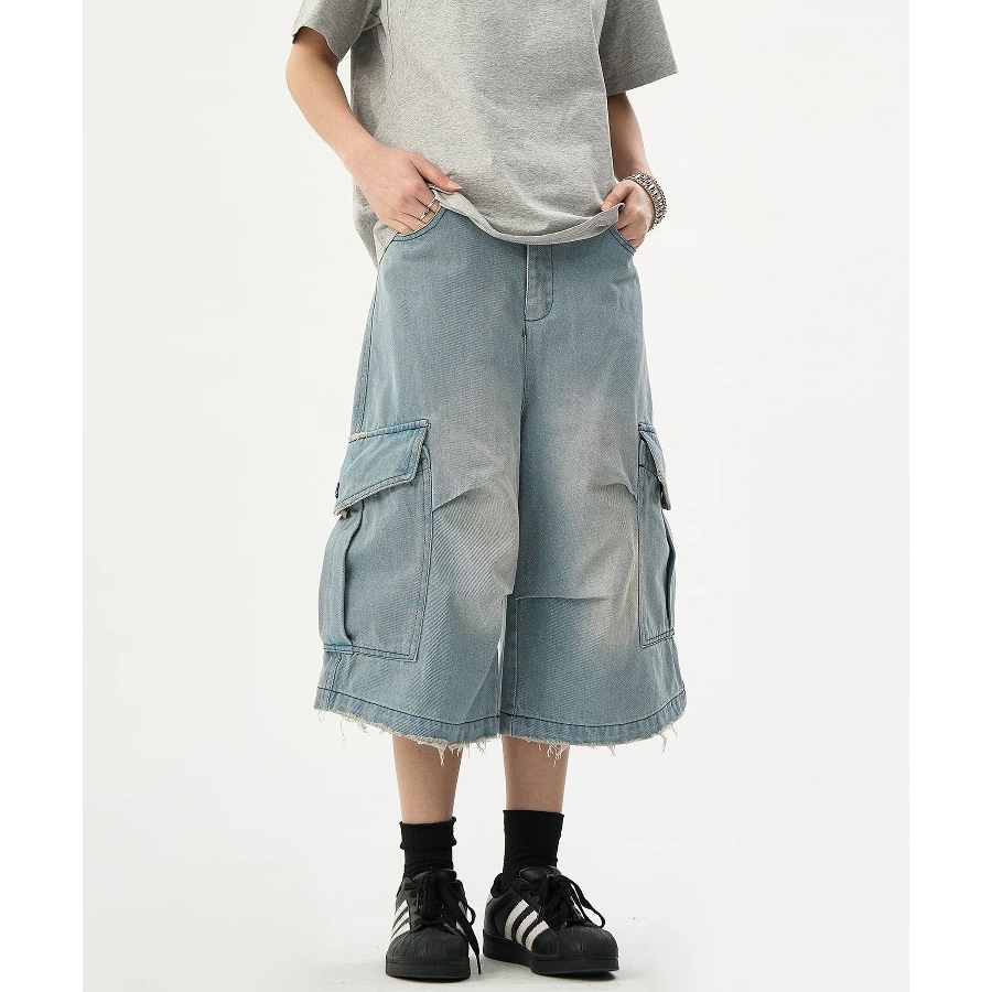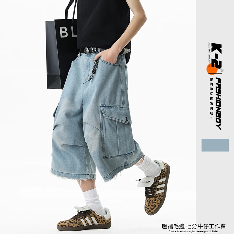 【K-2】美式復古 立體壓褶 毛邊 大口袋 牛仔七分褲 工裝短褲 七分褲 牛仔短褲 短褲 工作褲 Y2K【J7625】M|L|XL|XXLK-2 Fashionboy