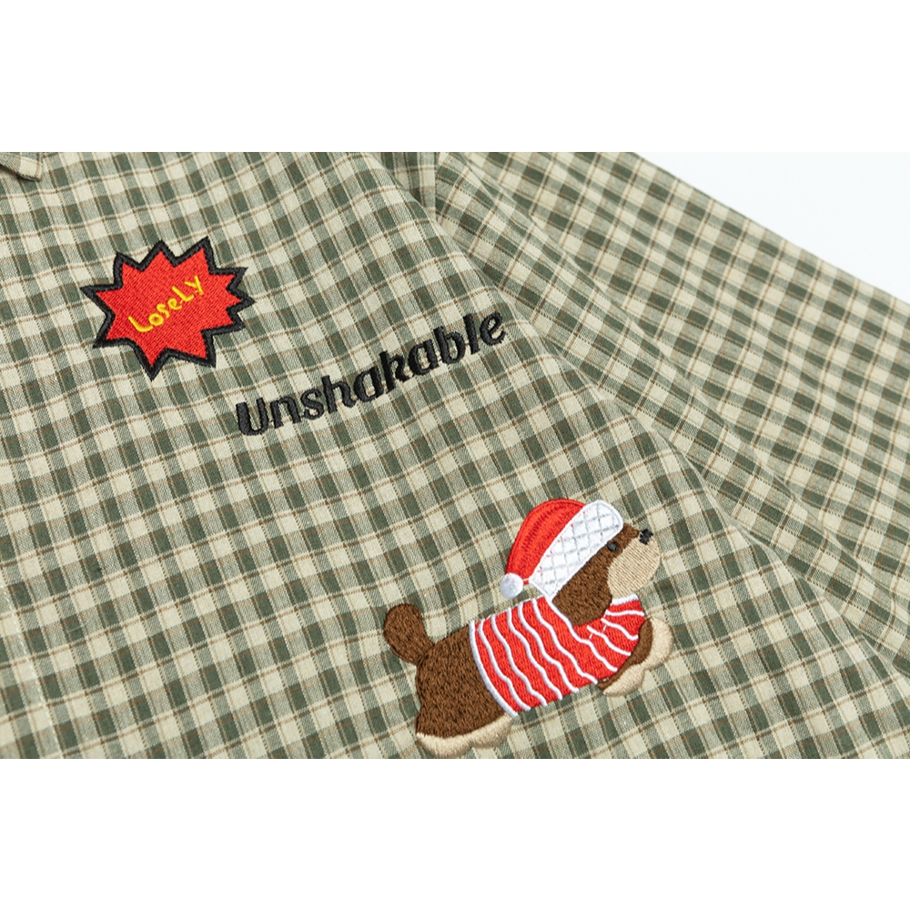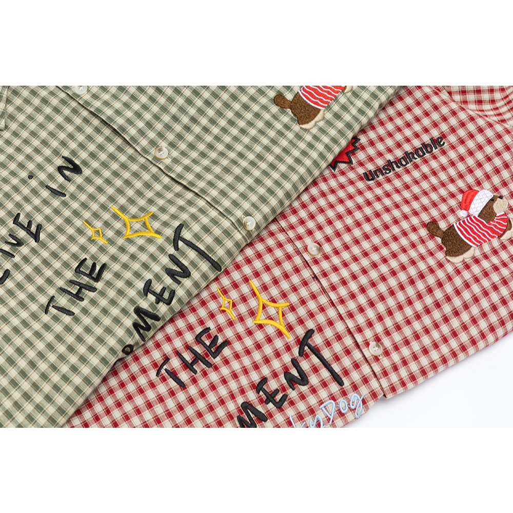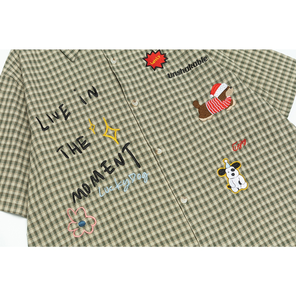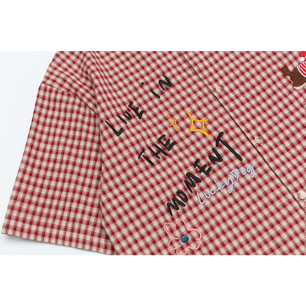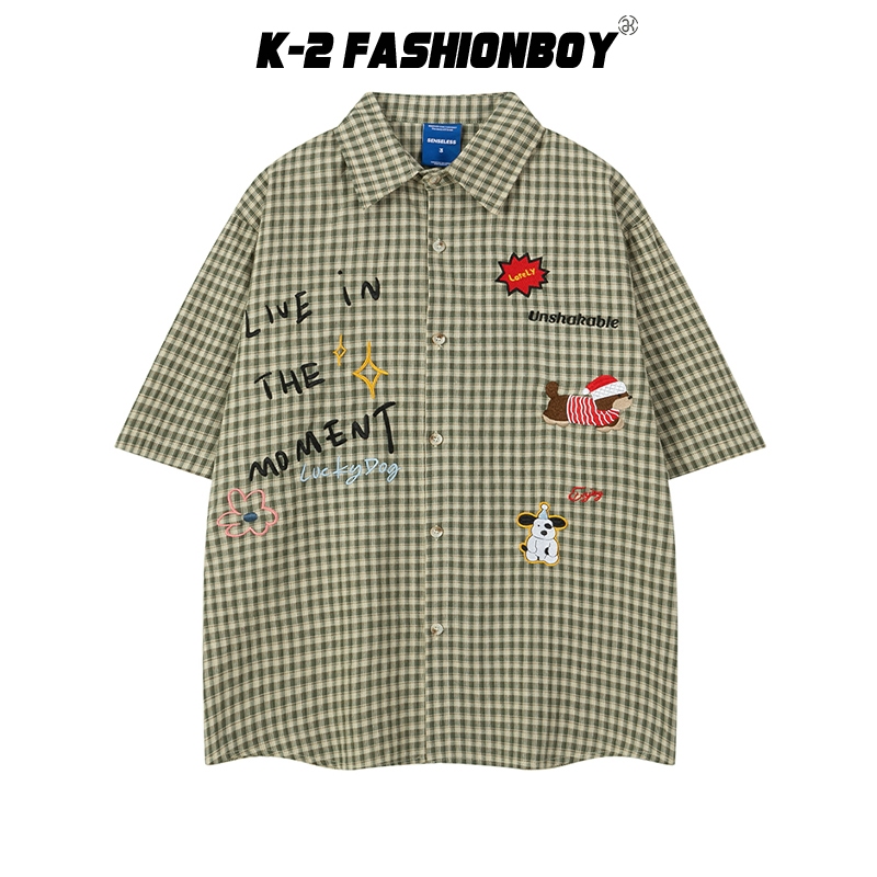 【K-2】live in the moment 活在此刻 珍惜當下 格子 短袖襯衫 復古 可愛 小狗【JU105】黃綠色,M|黃綠色,L|黃綠色,XL|紅色,M|紅色,L|紅色,XLShirtsK-2 Fashionboy