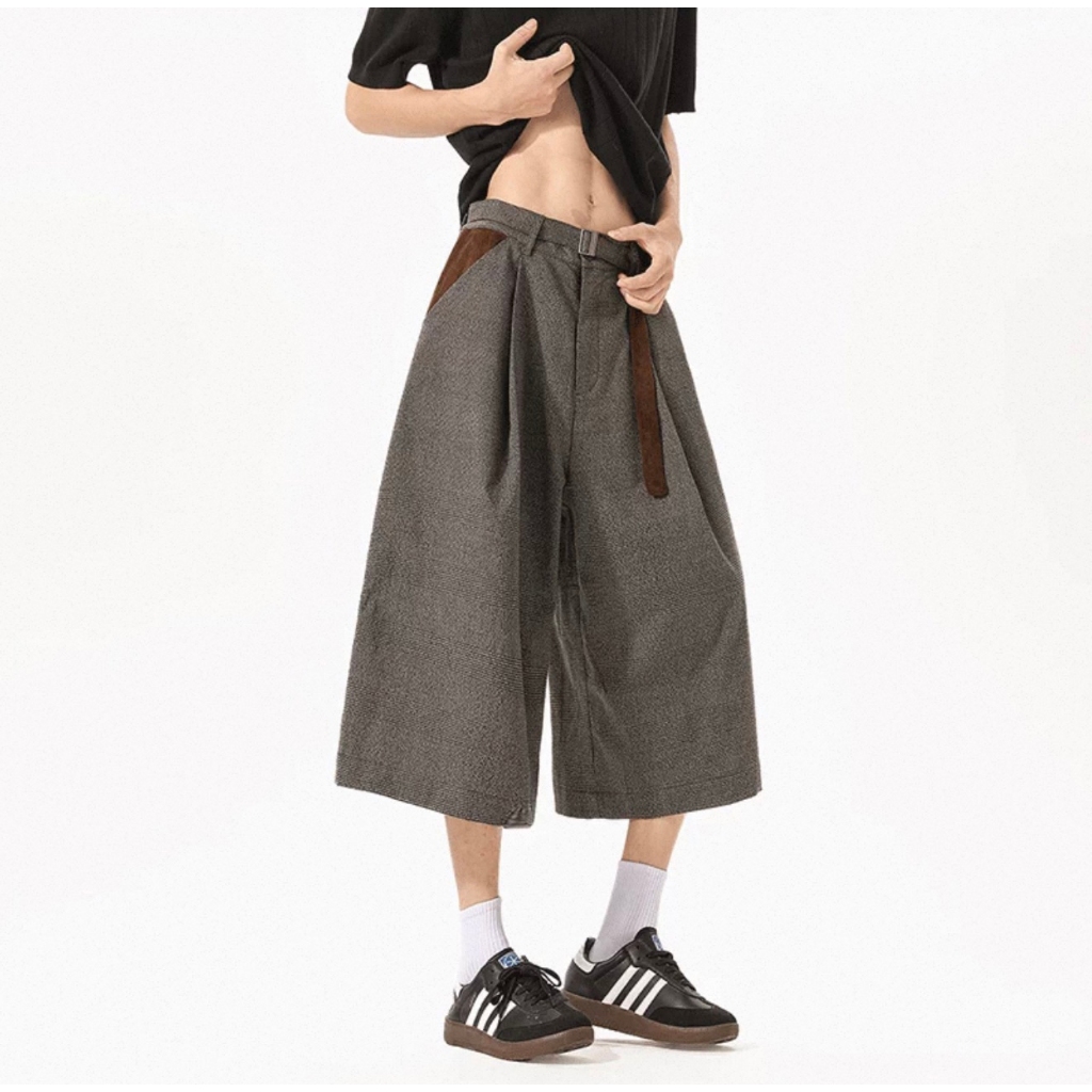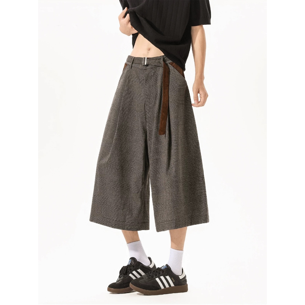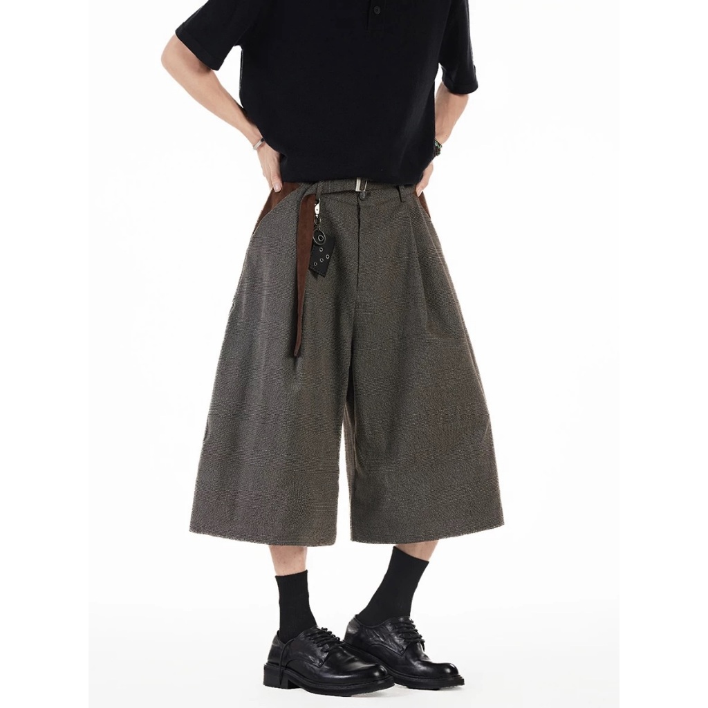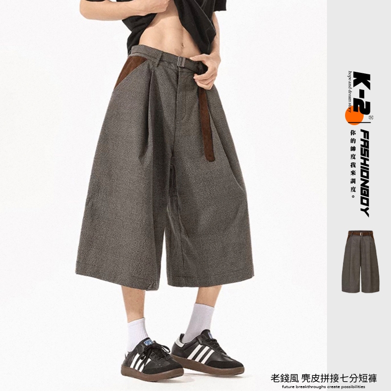 【K-2】美式復古 慵懶老錢風 千鳥格 七分短褲 麂皮拼接 七分褲 休閒短褲 老錢風 麂皮 短褲 復古短褲【JFK03】M|L|XL|XXLK-2 Fashionboy