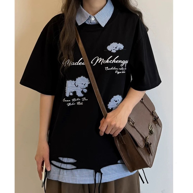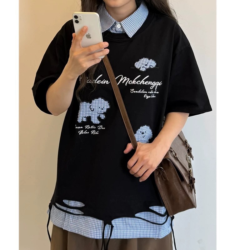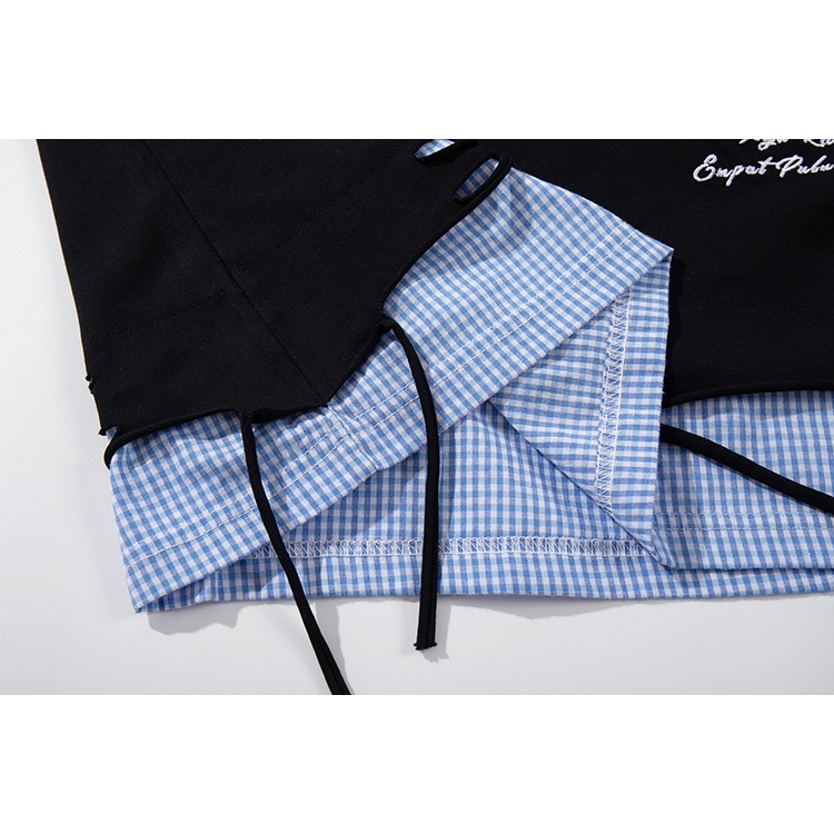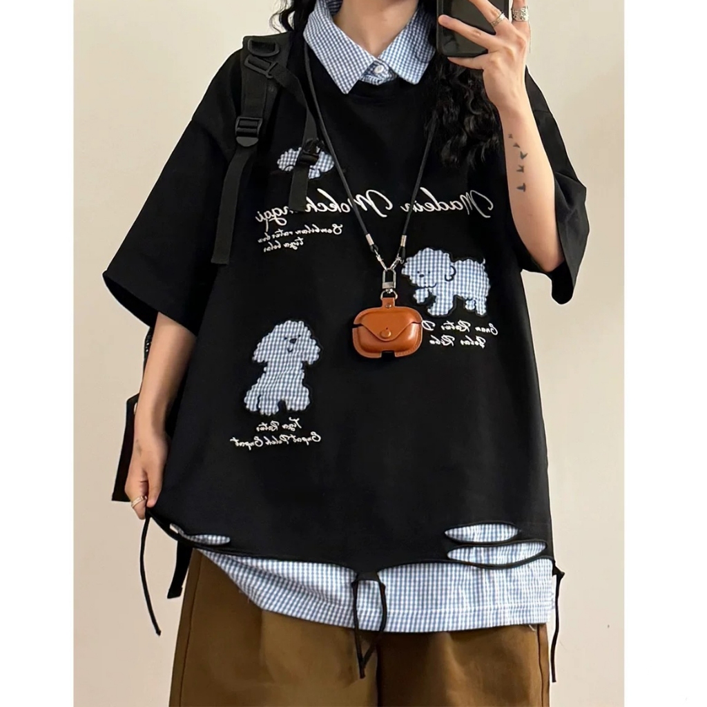 【K-2】假兩件格紋短T 可愛小狗 貴賓 小格子 刺繡 草寫英文 格紋 短袖 破壞下擺 破T 假兩件【JJJ2505】