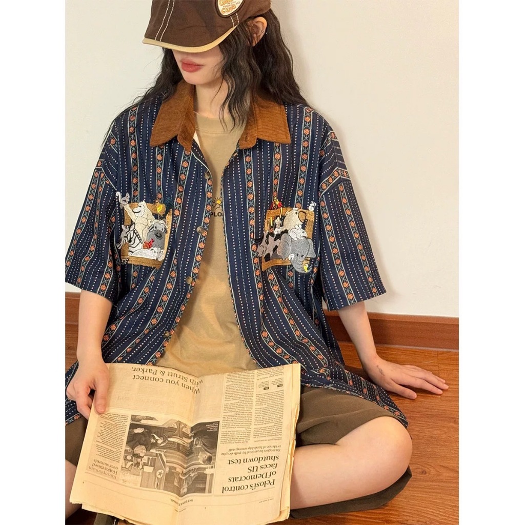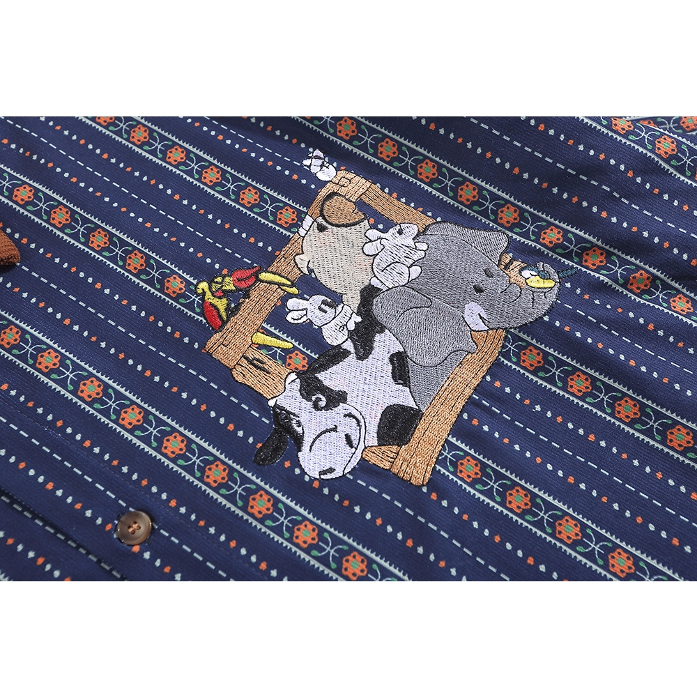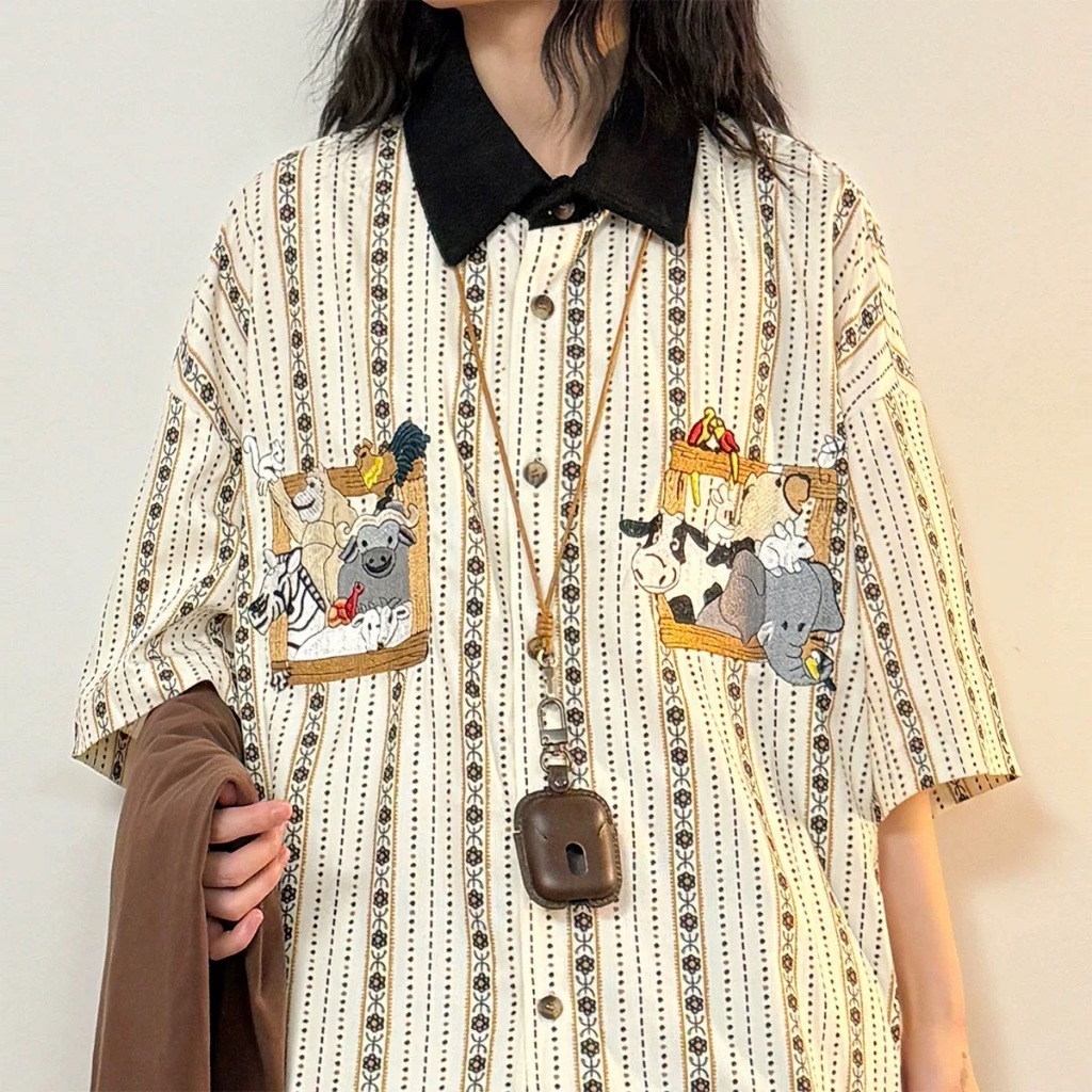 【K-2】若亞方舟 動物集合 大象 斑馬 猩猩 條紋 刺繡圖案 短袖襯衫 穿搭 可愛 男女不拘 古著【H832】藍,XL|白杏,M|白杏,L|白杏,XL|藍,M|藍,LShirtsK-2 Fashionboy