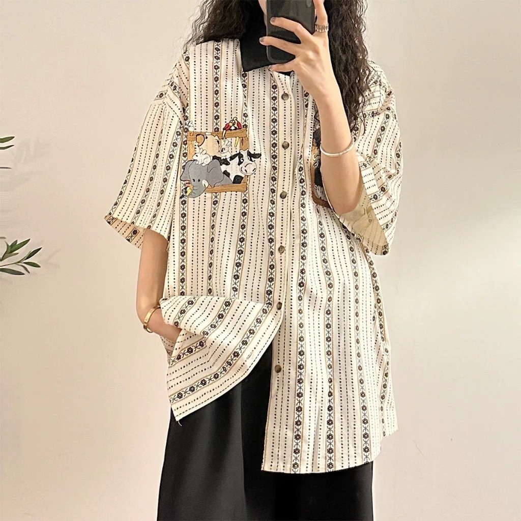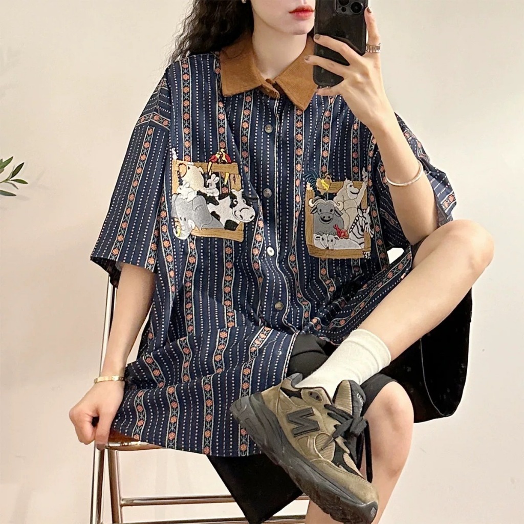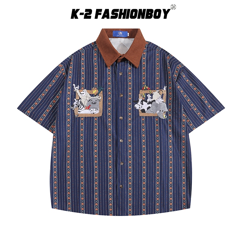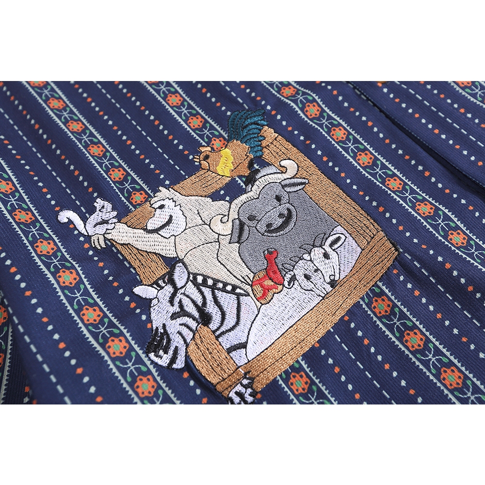 【K-2】若亞方舟 動物集合 大象 斑馬 猩猩 條紋 刺繡圖案 短袖襯衫 穿搭 可愛 男女不拘 古著【H832】藍,XL|白杏,M|白杏,L|白杏,XL|藍,M|藍,LShirtsK-2 Fashionboy