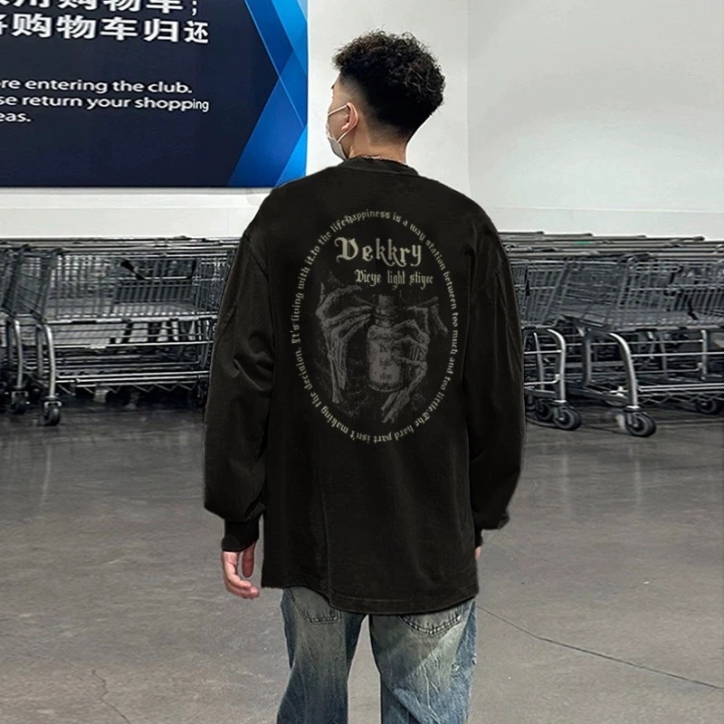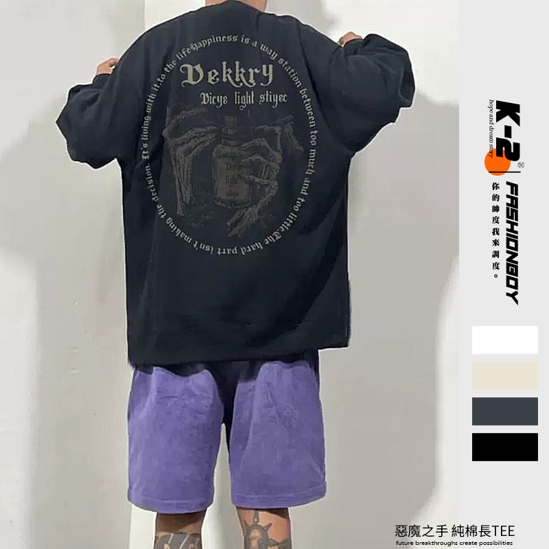 【K-2】美式復古 惡魔之手 純棉長袖 長T 暗黑風骷髏印花 高街長袖T恤 大尺碼 復古 寬鬆 純棉上衣【KCT02】白色,M|白色,L|杏色,M|杏色,L|黑色,M|黑色,L|深灰色,M|深灰色,LT-ShirtsK-2 Fashionboy