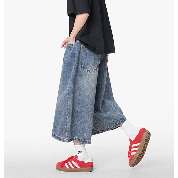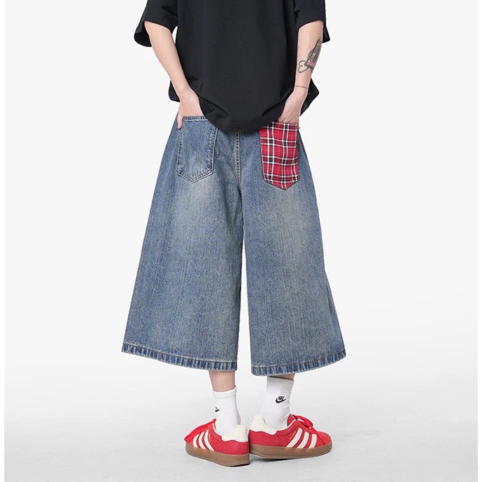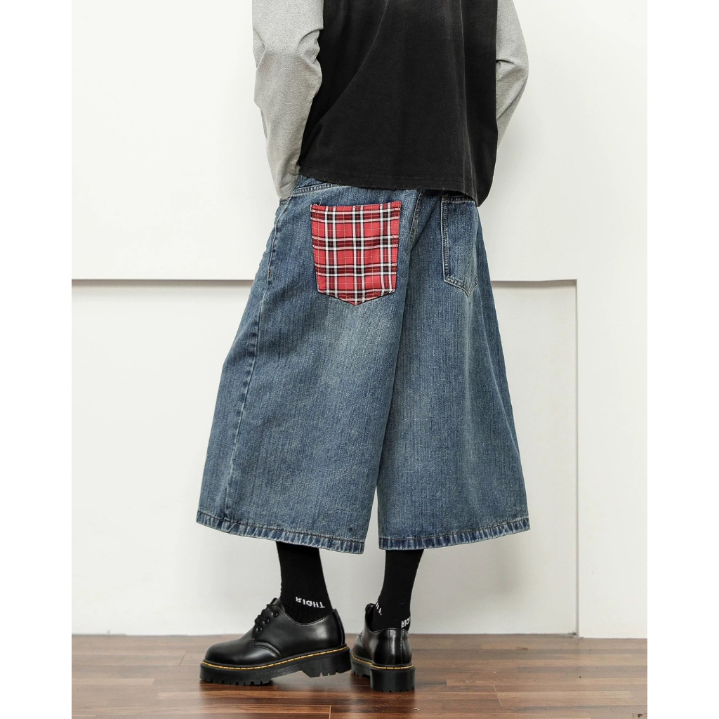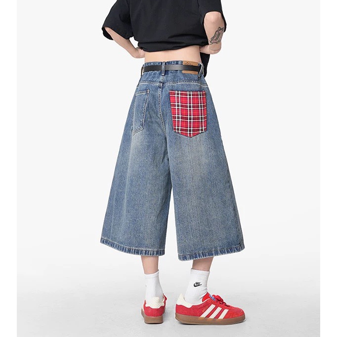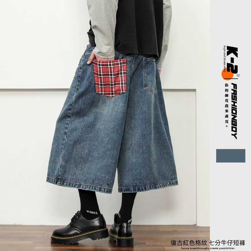 【K-2】復古紅格紋拼接 牛仔七分褲 藍色 牛仔短褲 七分褲 牛仔褲 牛仔寬短褲 短褲 褲子 七分短褲【JD901】M|L|XL|XXLK-2 Fashionboy