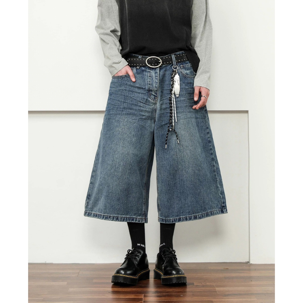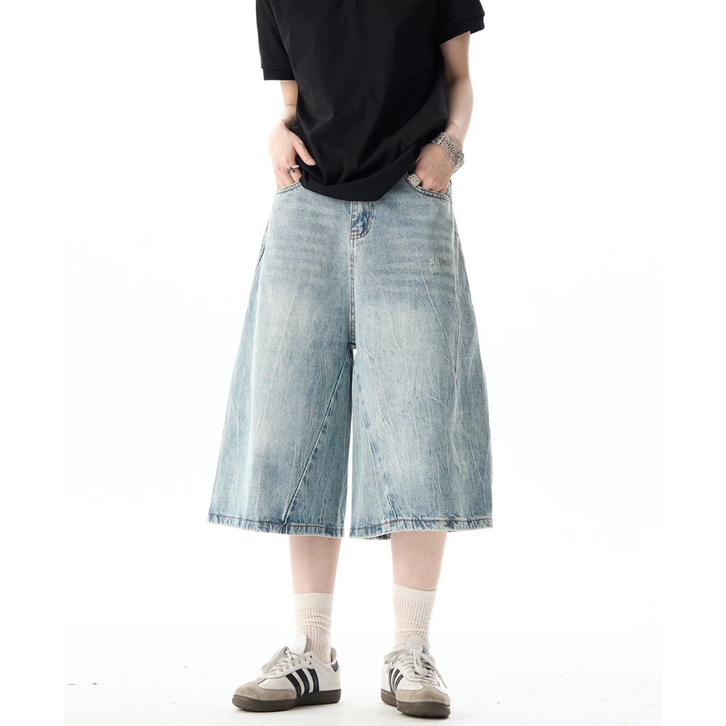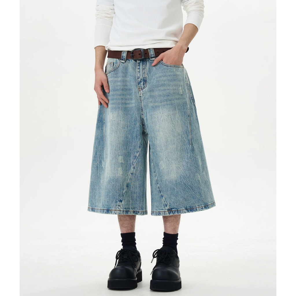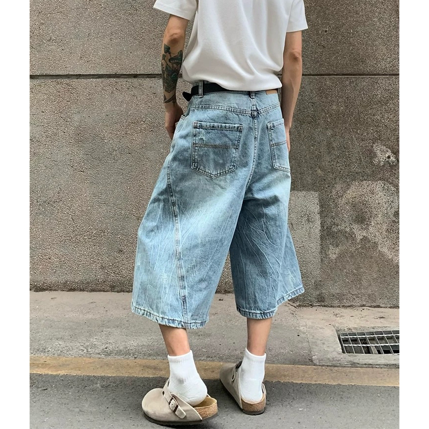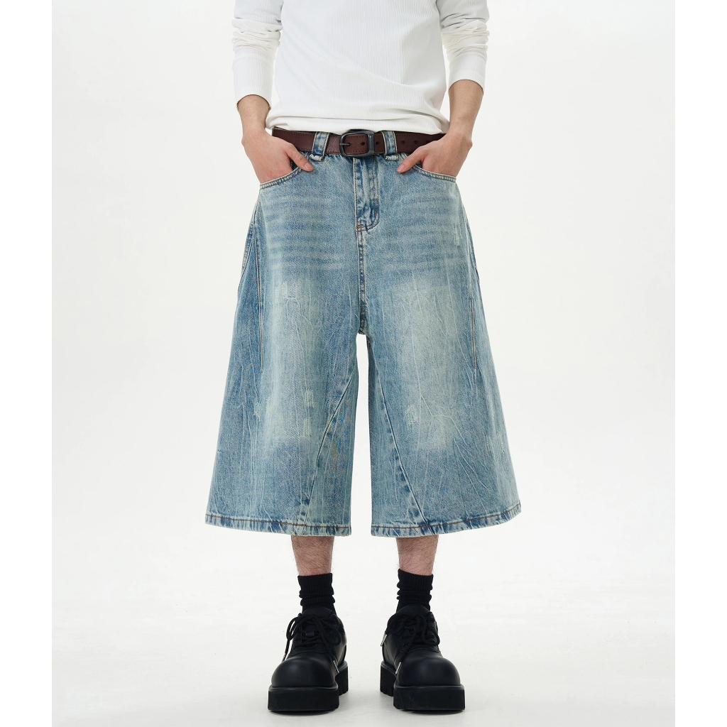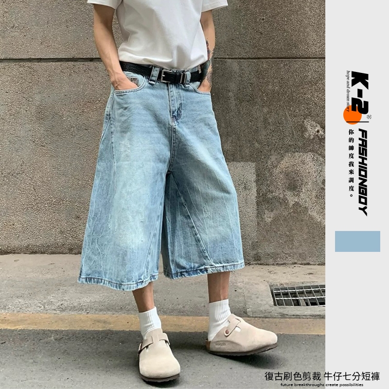 【K-2】美式復古 仿舊刷色 立體剪裁 七分牛仔褲 藍色 牛仔短褲 七分褲 短褲 褲子 Y2K 牛仔褲【J7621】M|L|XL|XXLK-2 Fashionboy