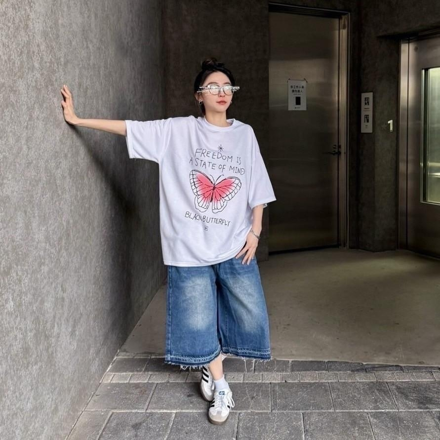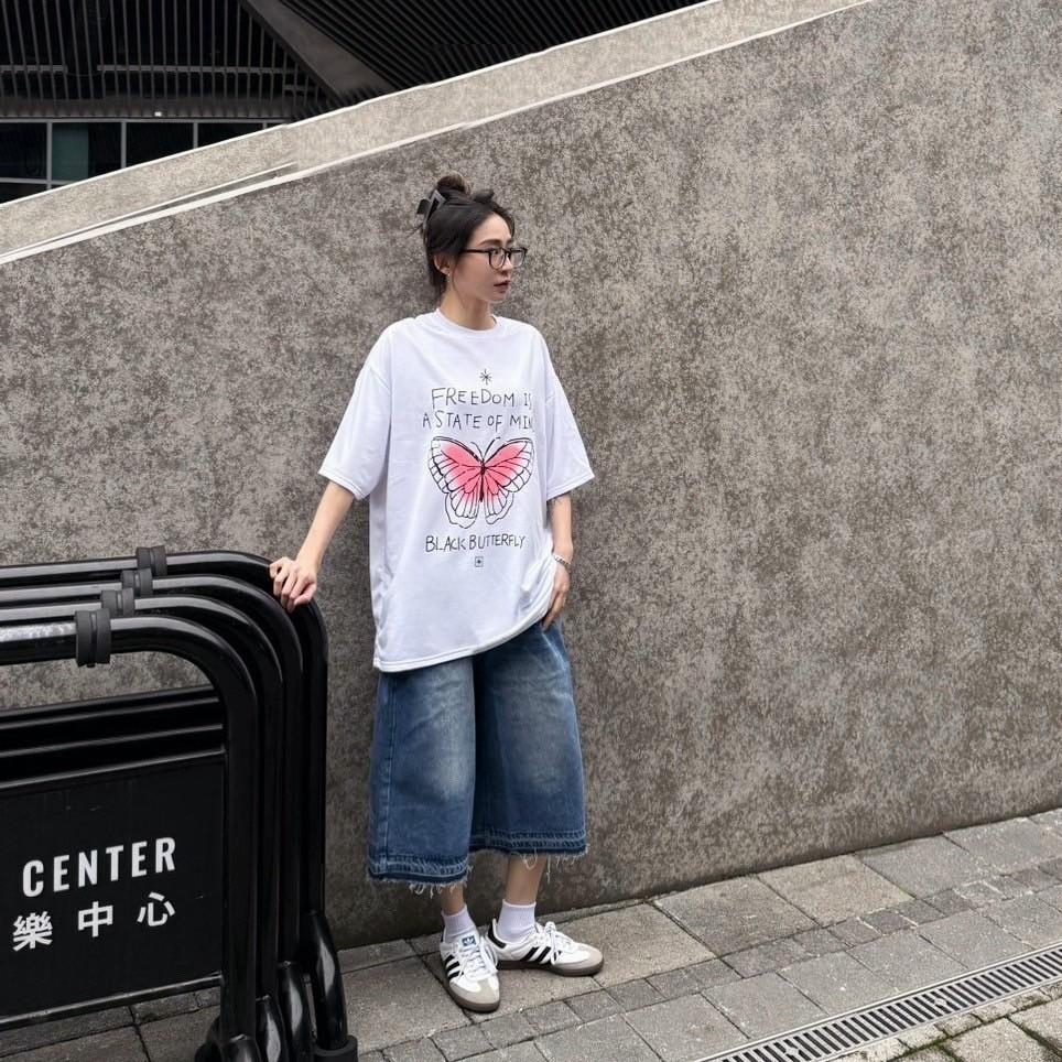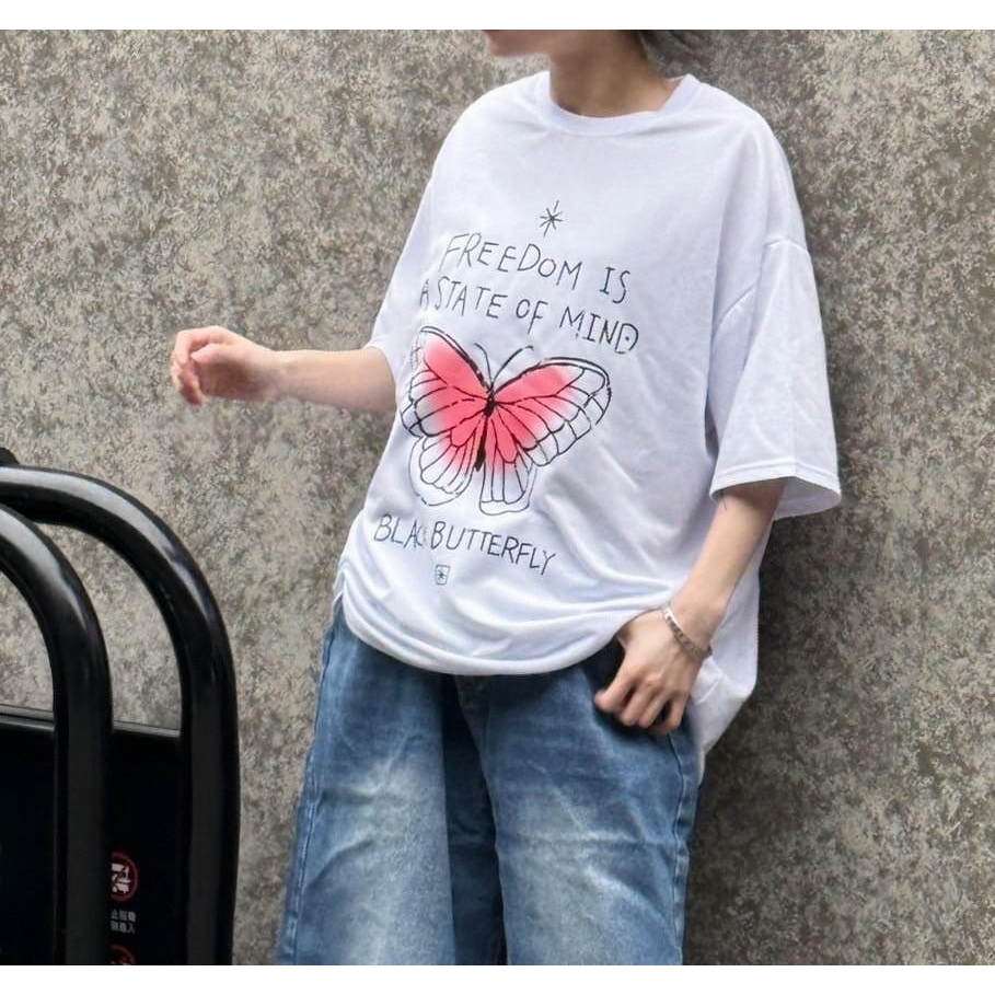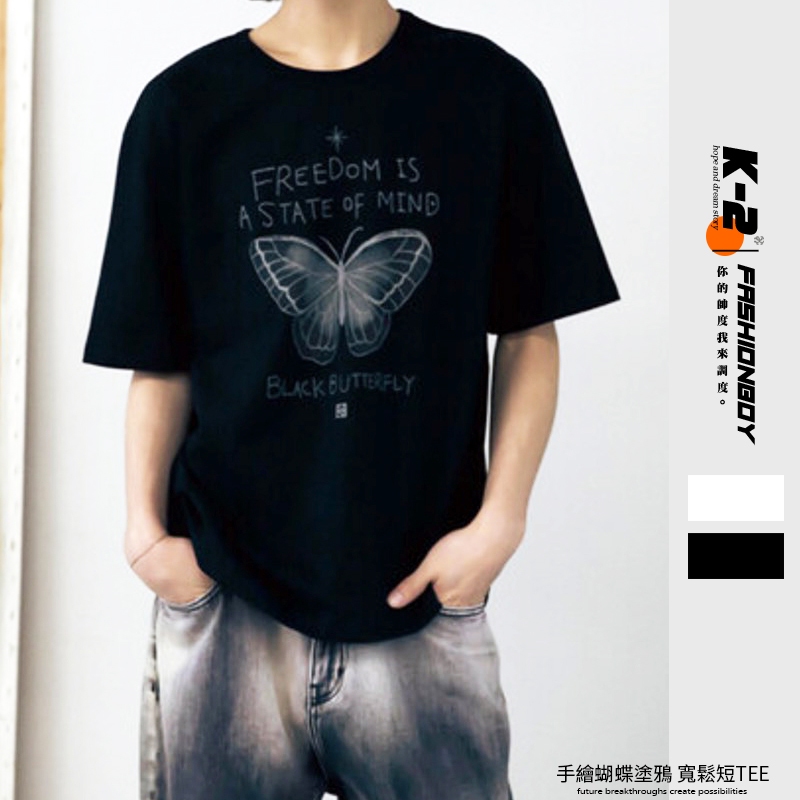 【K-2】手繪蝴蝶 塗鴉 可愛字體 美式寬鬆短T 短袖 上衣 落肩 寬鬆 短T Y2K K2 親膚 情侶【K2707】白色|黑色T-ShirtsK-2 Fashionboy