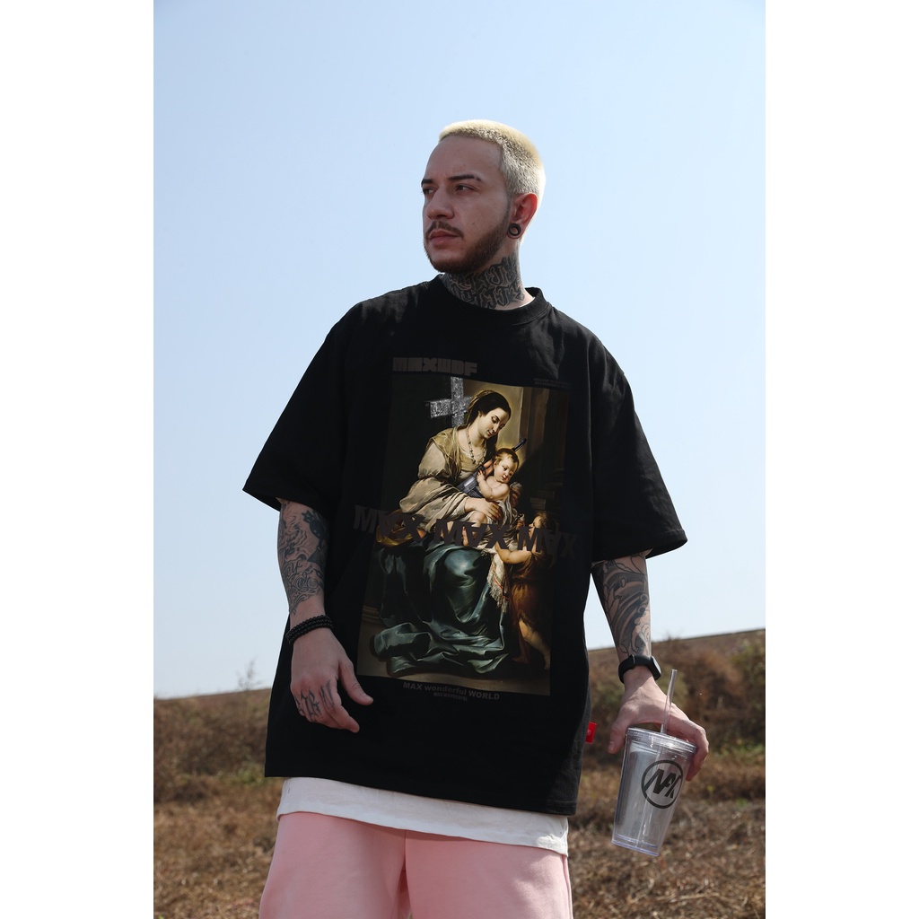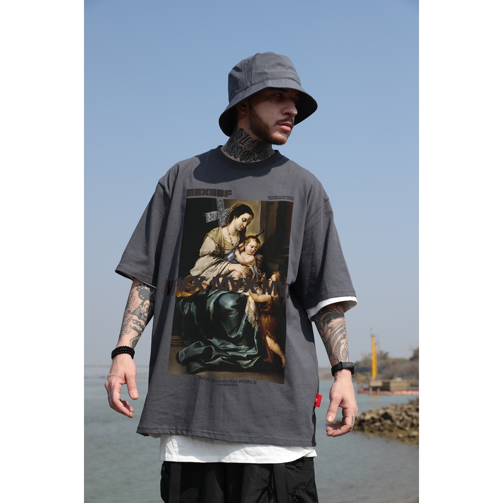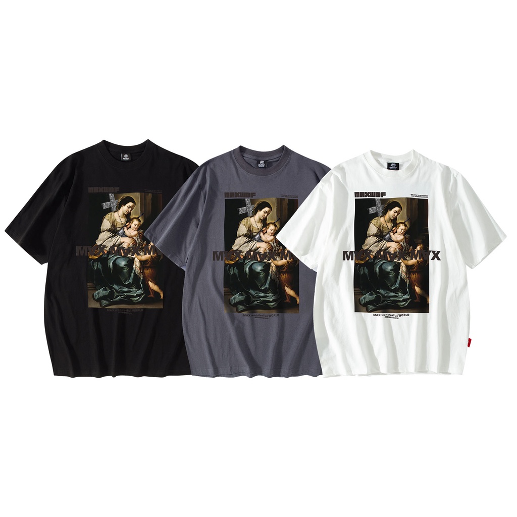 【K-2】MAXWDF 十字架 聖母 母愛 潮流 落肩短袖 油畫 擁抱的小孩 短袖上衣 情侶款 短袖【B0850】白色,L|黑色,L|黑色,XL|深灰,L|深灰,XL|深灰,XXL|白色,XXL|黑色,M|黑色,XXL|深灰,M|白色,M|白色,XLT-ShirtsK-2 Fashionboy