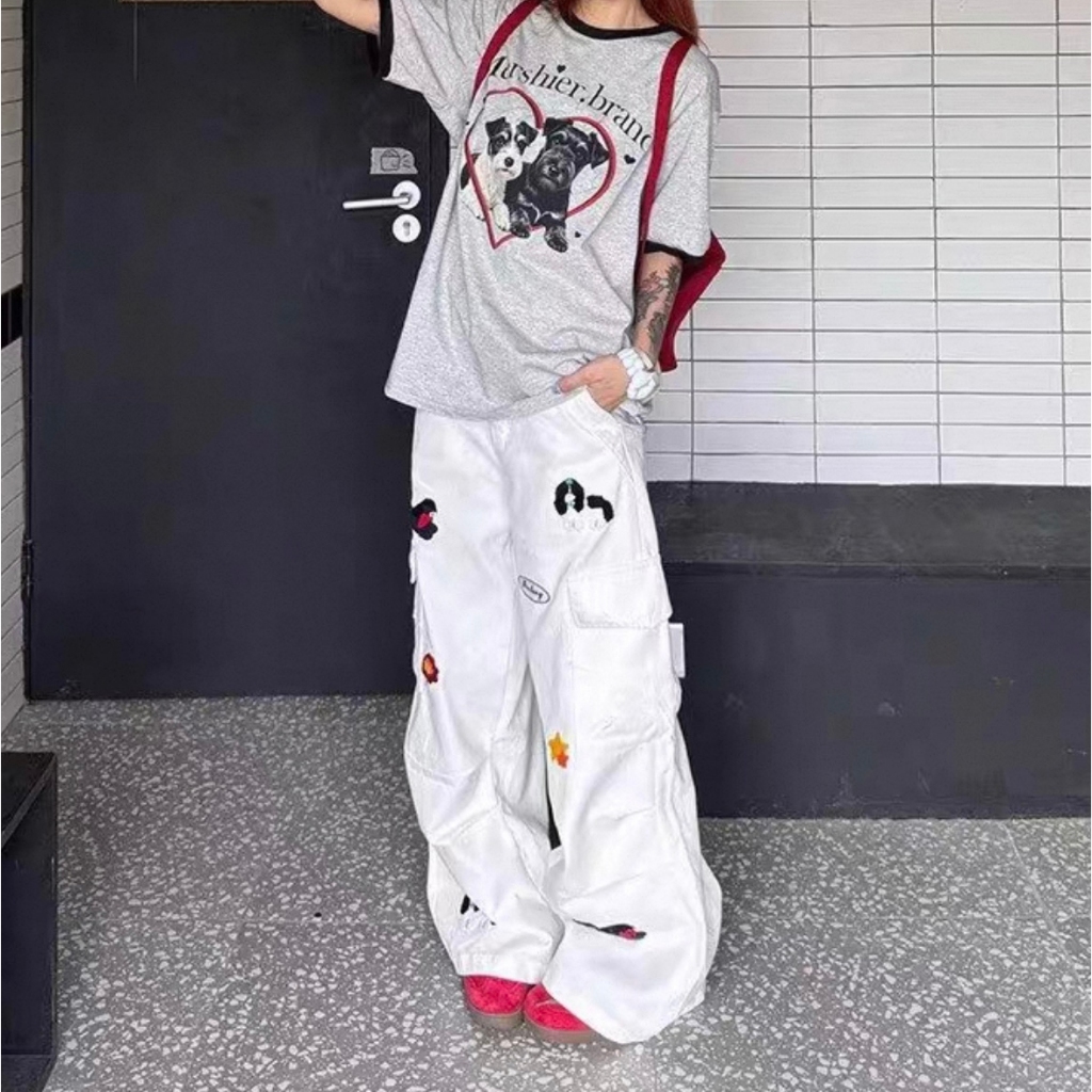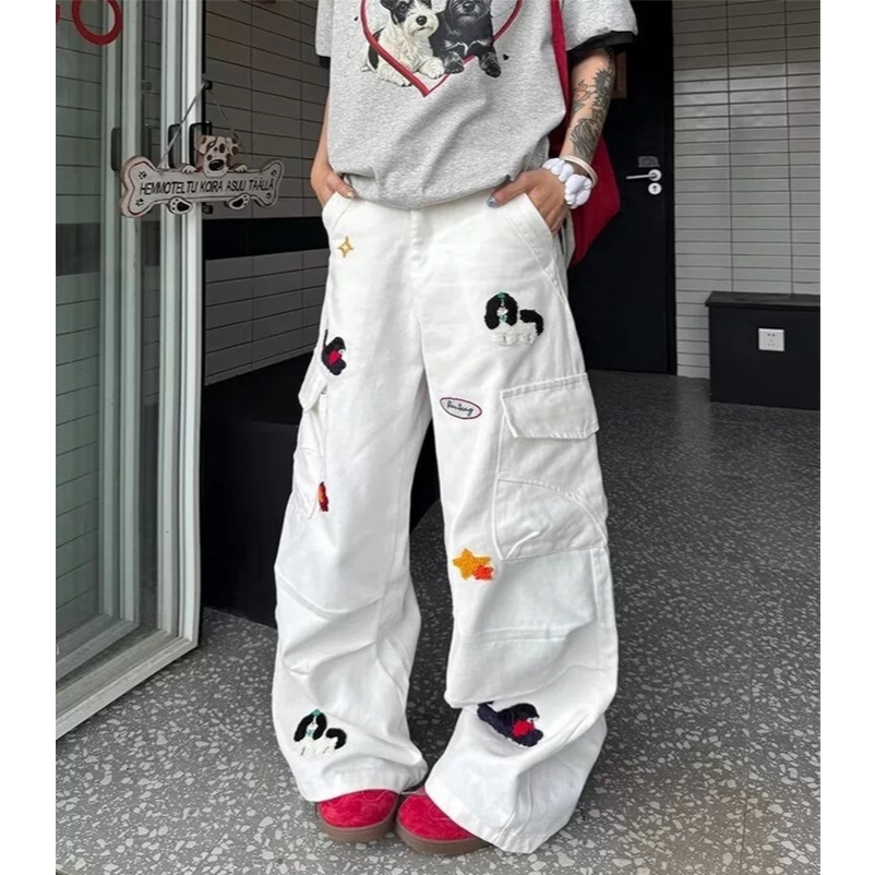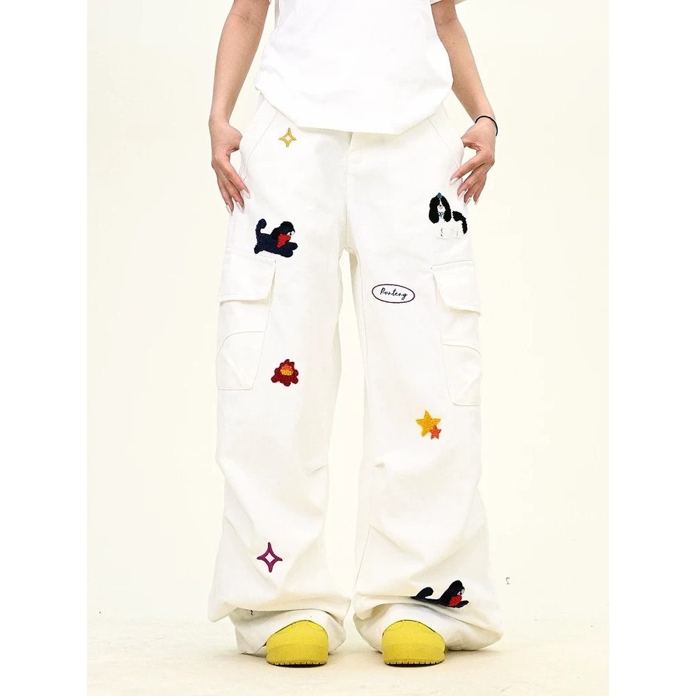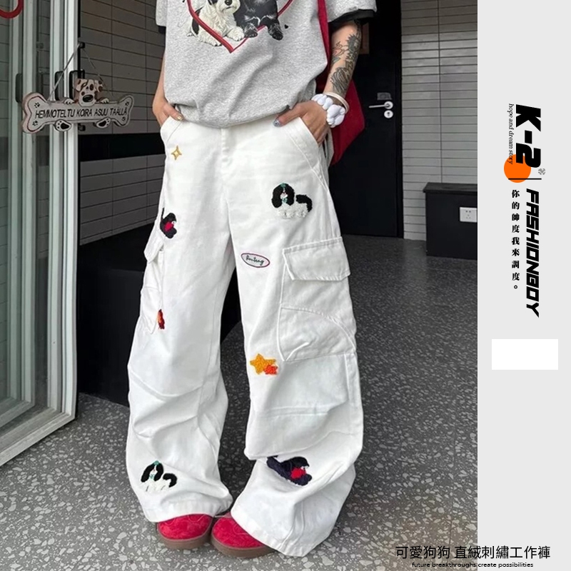 【K-2】可愛小狗 植絨 刺繡 工裝長褲 闊腿褲 工作褲 寬褲 直筒寬褲 星星 小狗 白色長褲 褲子【JN6083】M|L|XL|XXLCargoK-2 Fashionboy