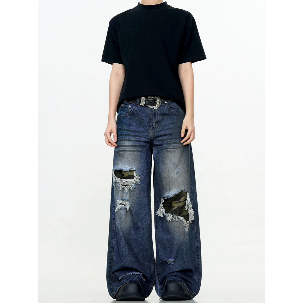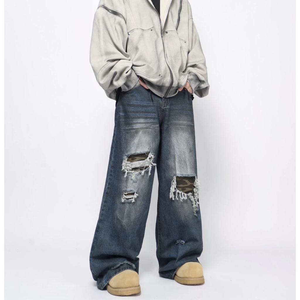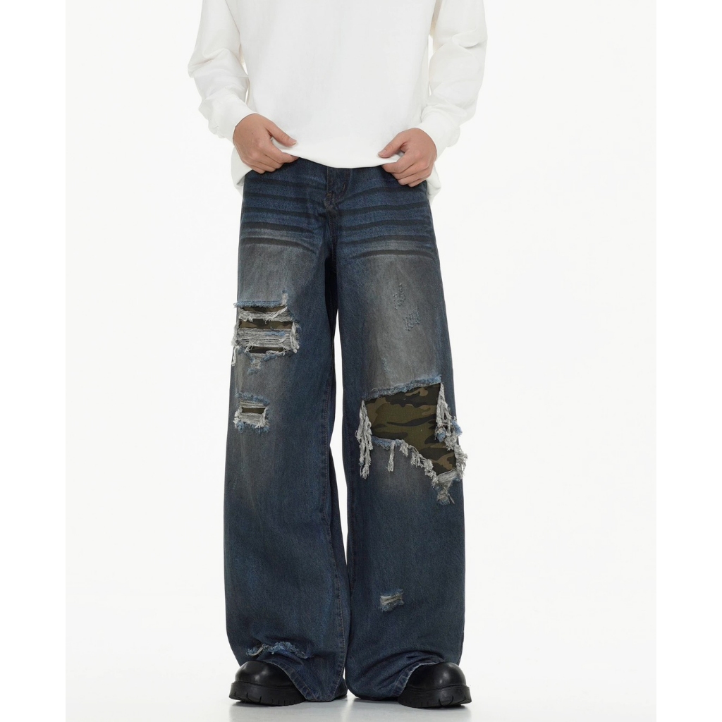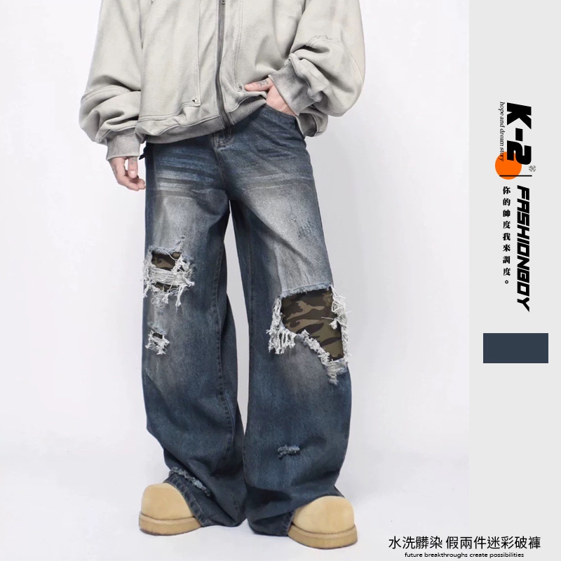 【K-2】美式水洗髒染 迷彩貼布 假兩件 破褲 直筒寬褲 闊腿褲 長褲 牛仔褲 小破壞 復古長褲 Y2K【JN950】M|L|XL|XXLK-2 Fashionboy