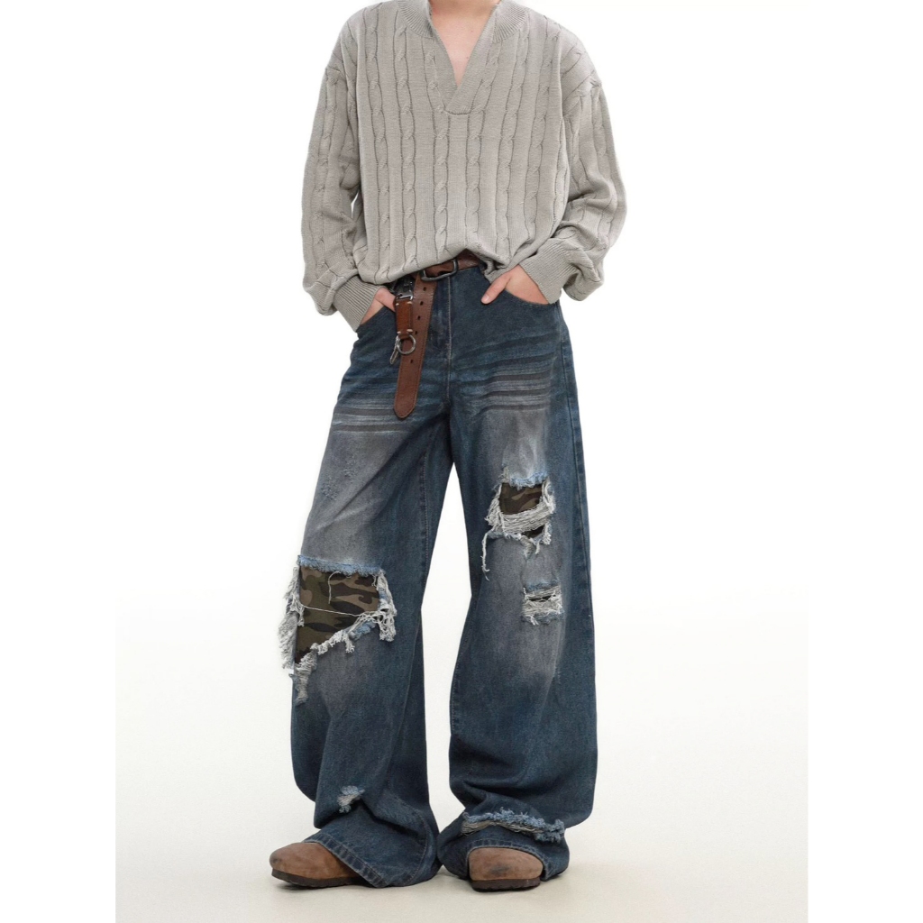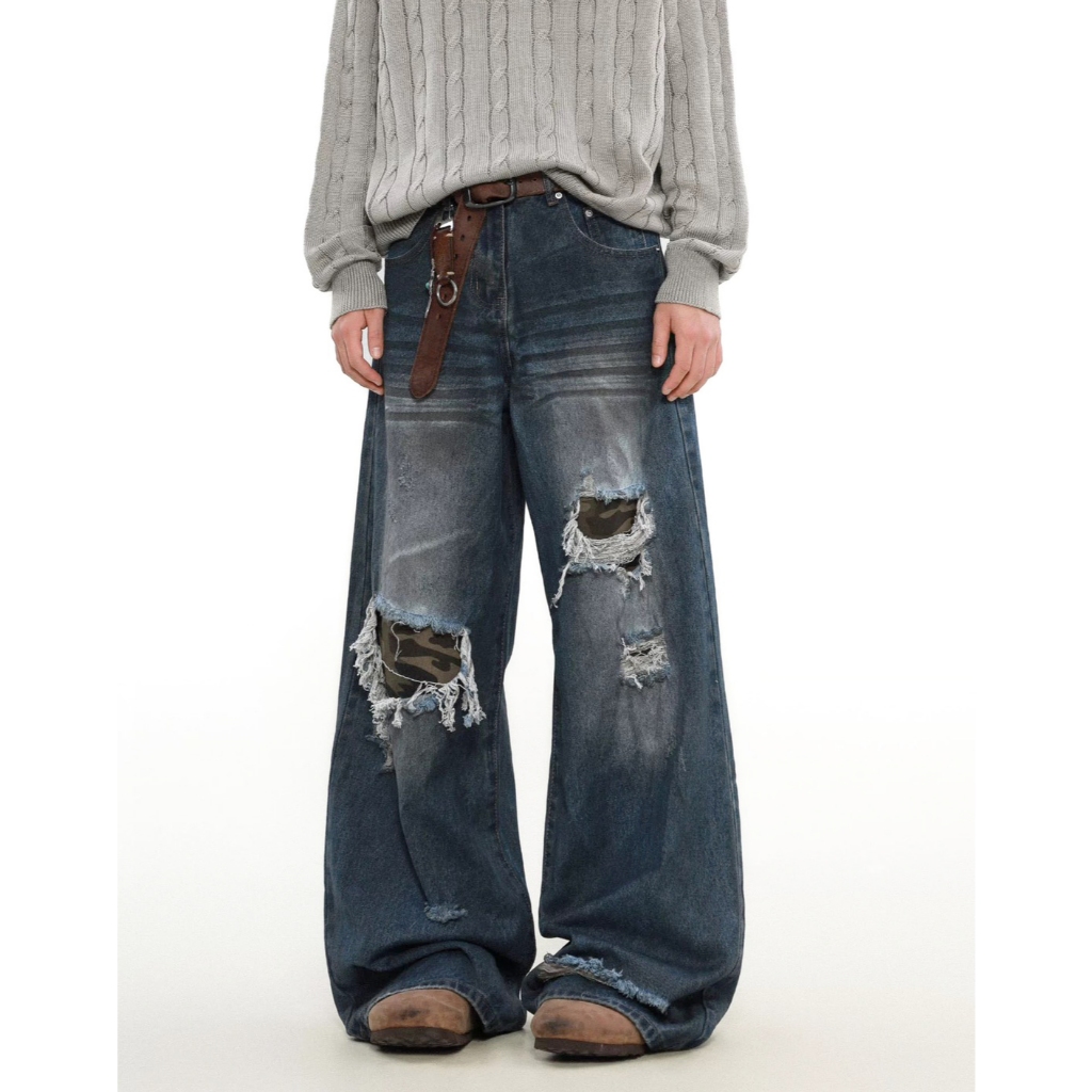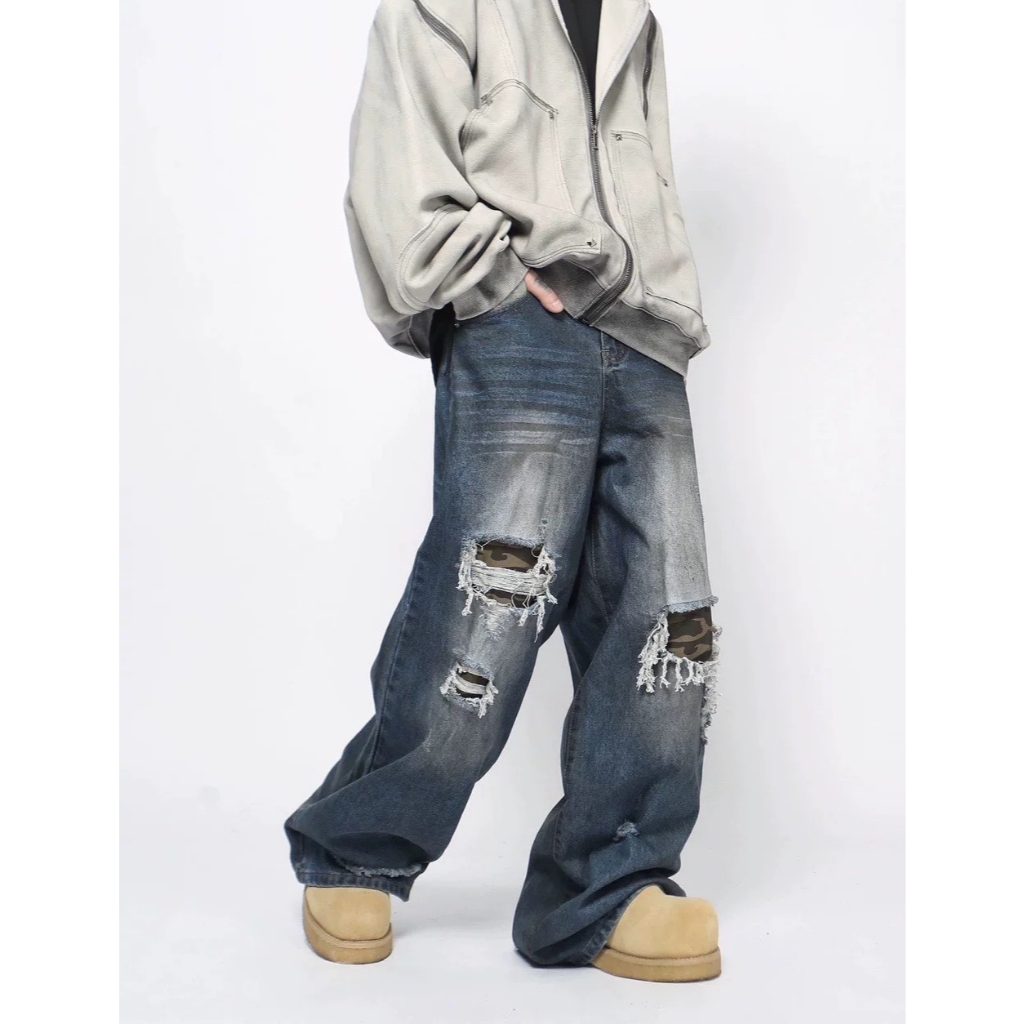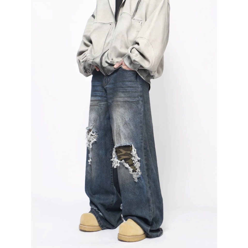 【K-2】美式水洗髒染 迷彩貼布 假兩件 破褲 直筒寬褲 闊腿褲 長褲 牛仔褲 小破壞 復古長褲 Y2K【JN950】M|L|XL|XXLK-2 Fashionboy