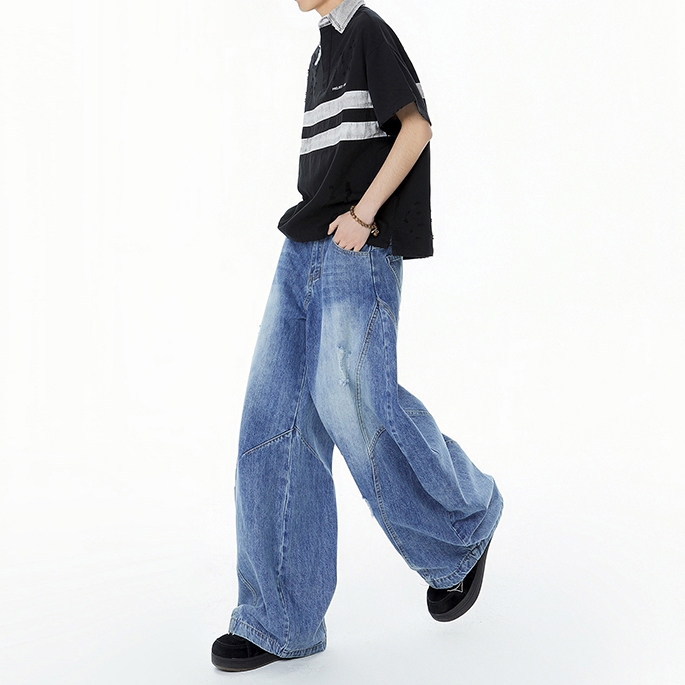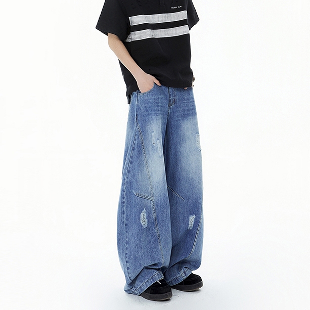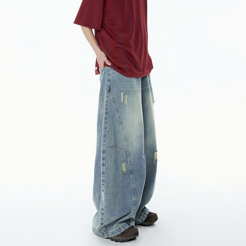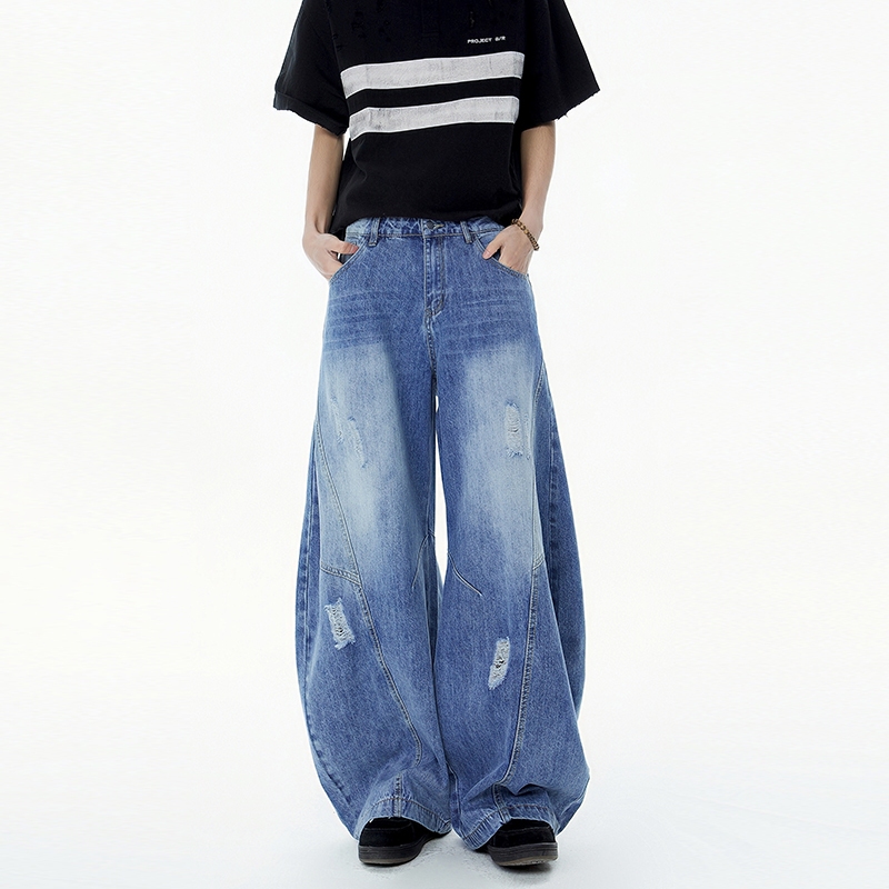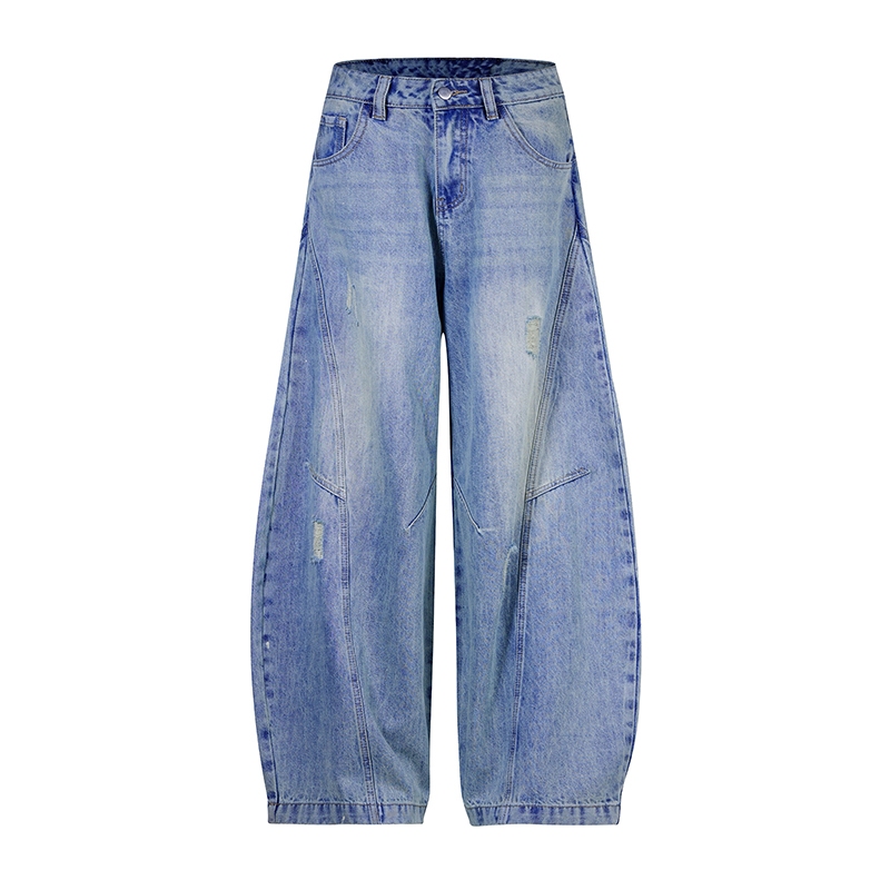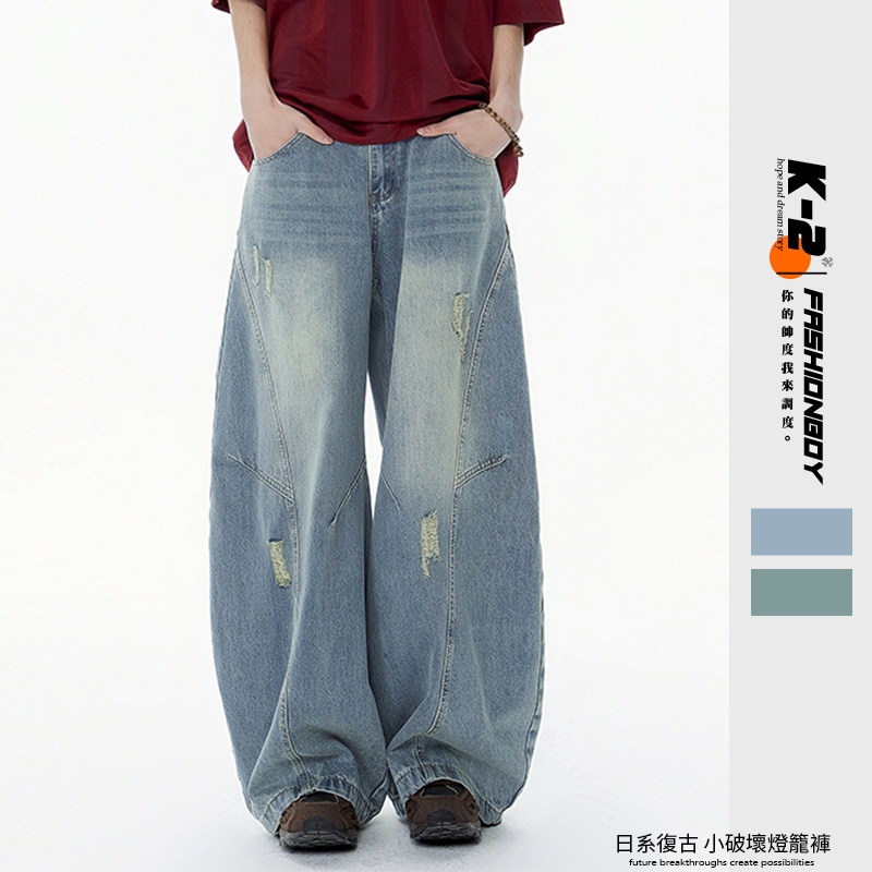 【K-2】日系復古 小破壞 立體車線 簡約百搭 街頭 寬褲 燈籠褲 牛仔長褲 牛仔褲 穿搭 情侶【JL9007】