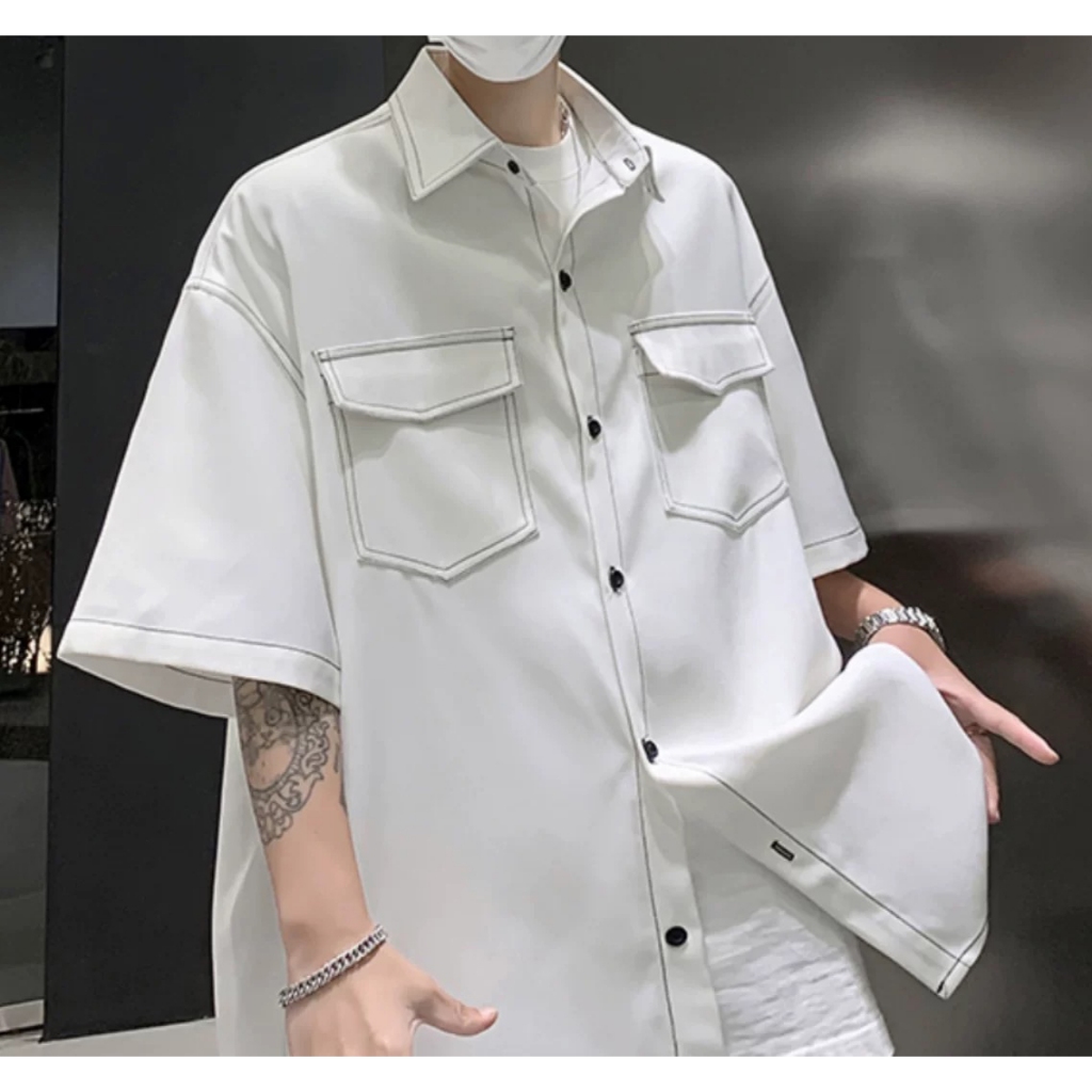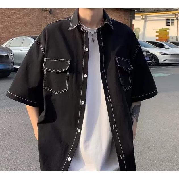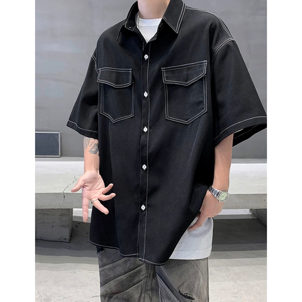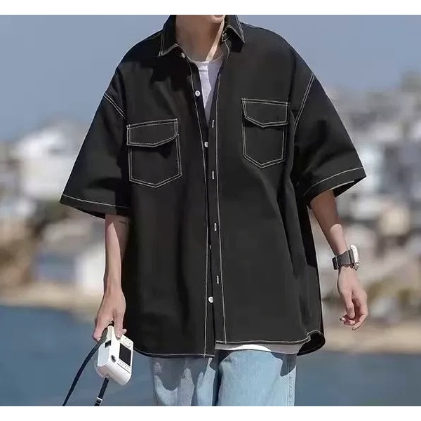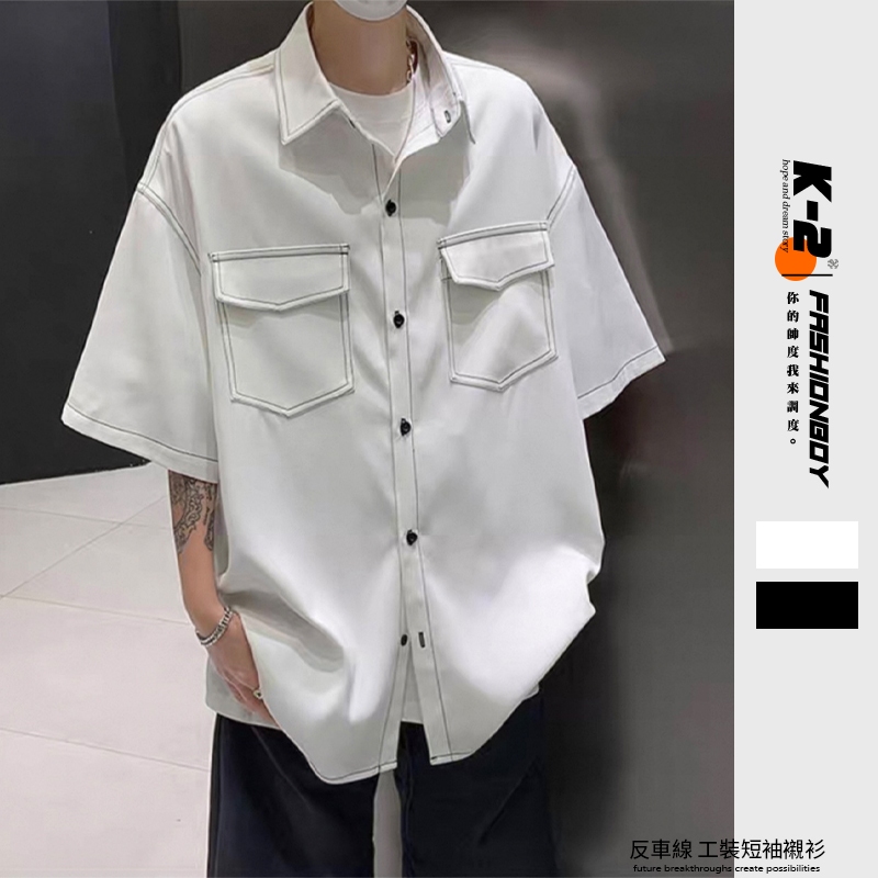 【K-2】日系復古 反車線 明線 工裝襯衫 短袖襯衫 口袋襯衫 復古襯衫 VINTAGE 襯衫 Y2K K2【J563】白色,M|白色,L|黑色,M|黑色,LShirtsK-2 Fashionboy