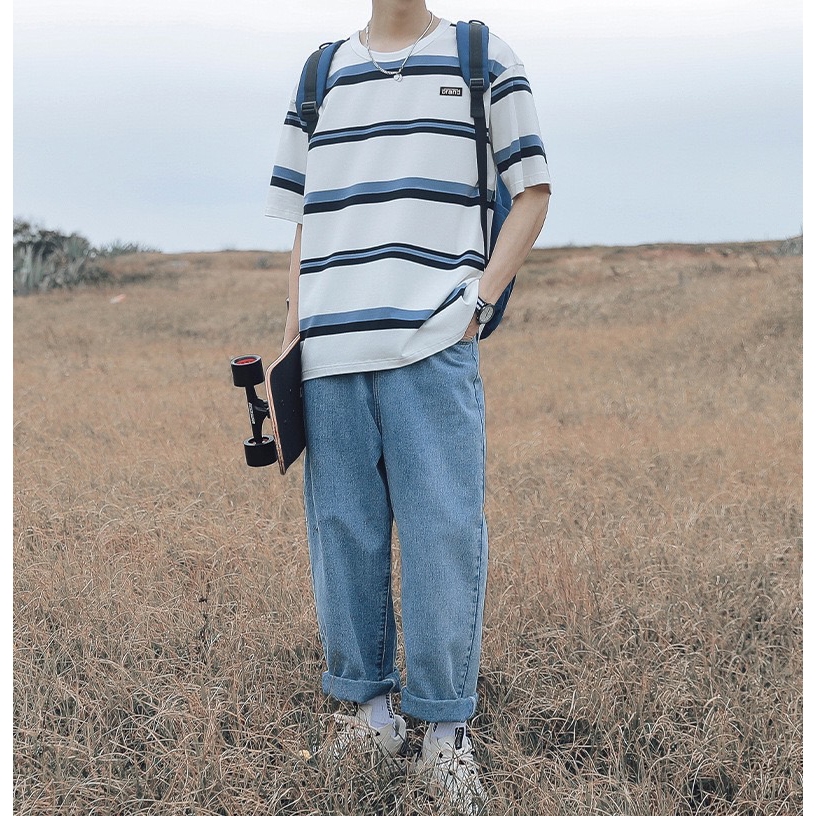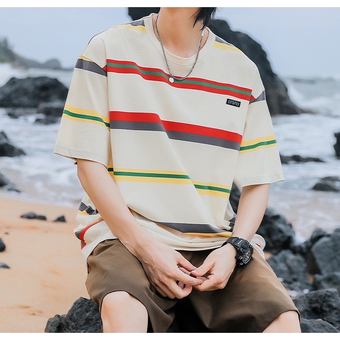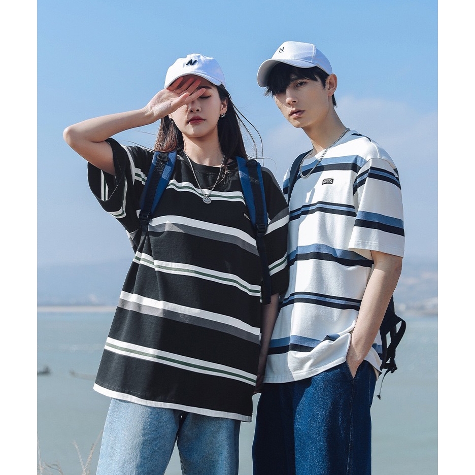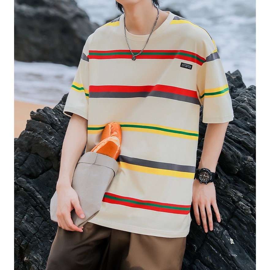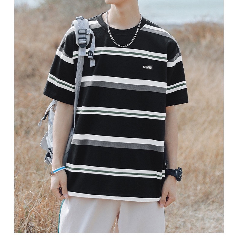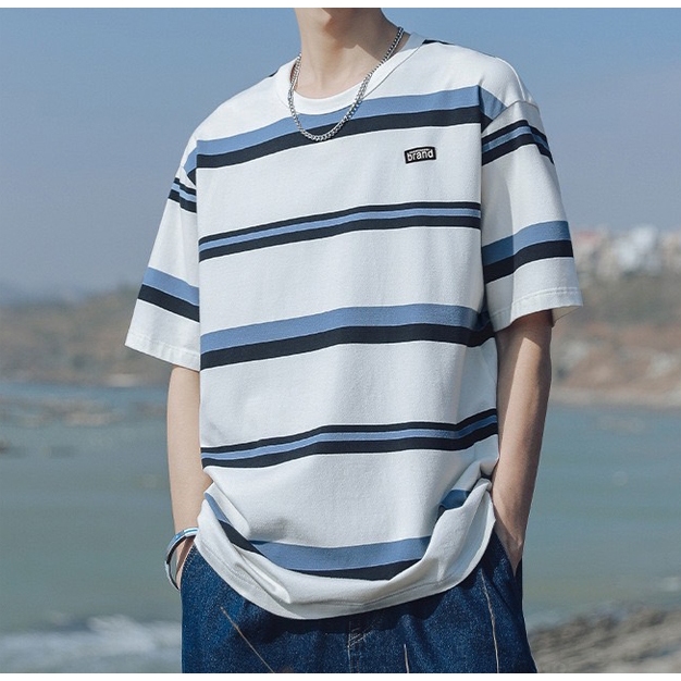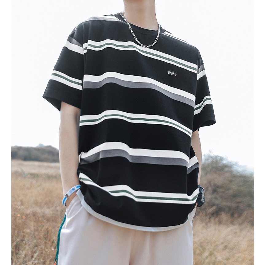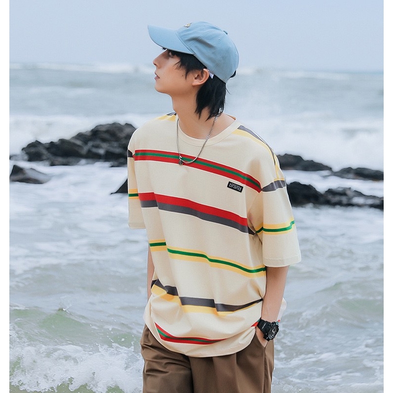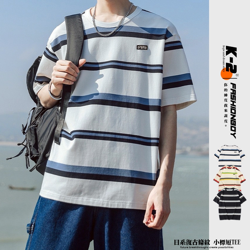 【K-2】日系復古條紋短T brand 橡膠小標 復古 條紋短t 短袖 上衣 條紋 落肩 寬鬆 Y2K【WH1008】白藍色,L|白藍色,XL|白藍色,XXL|黑白色,L|黑白色,XL|黑白色,XXL|米彩色,L|米彩色,XL|米彩色,XXLT-ShirtsK-2 Fashionboy