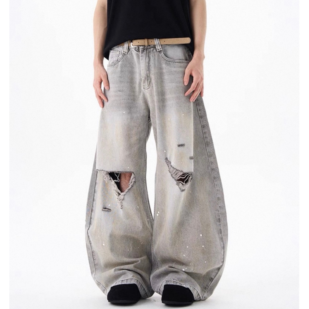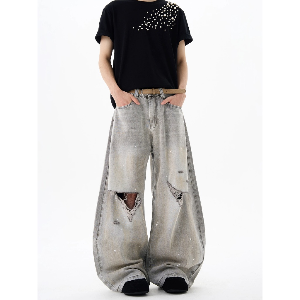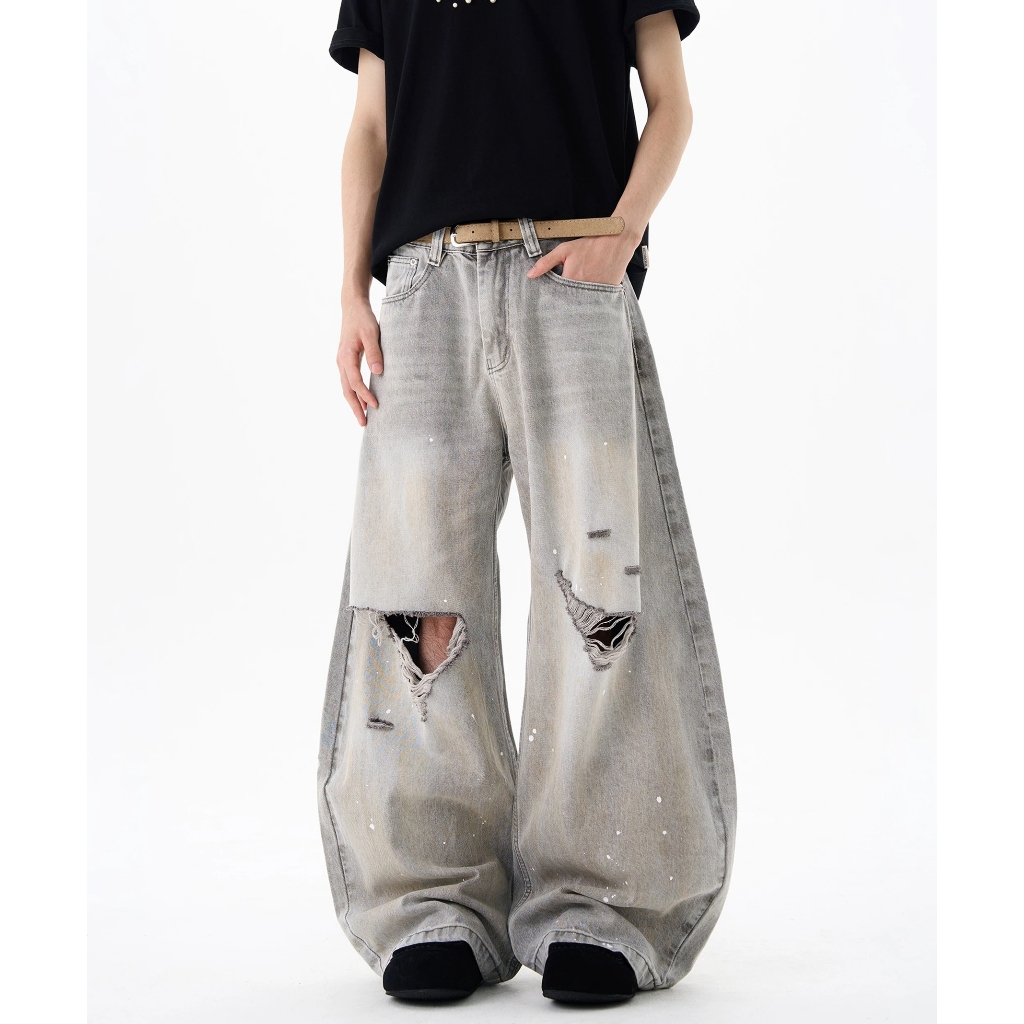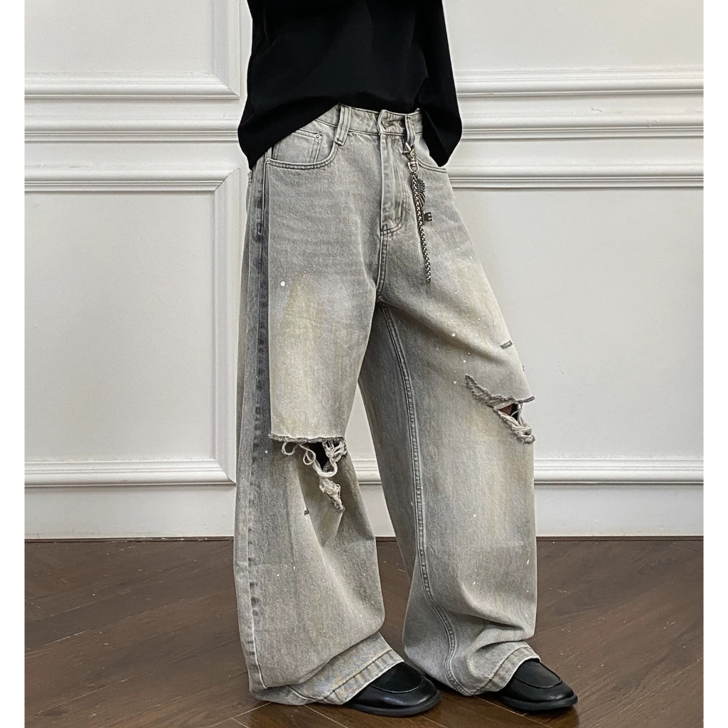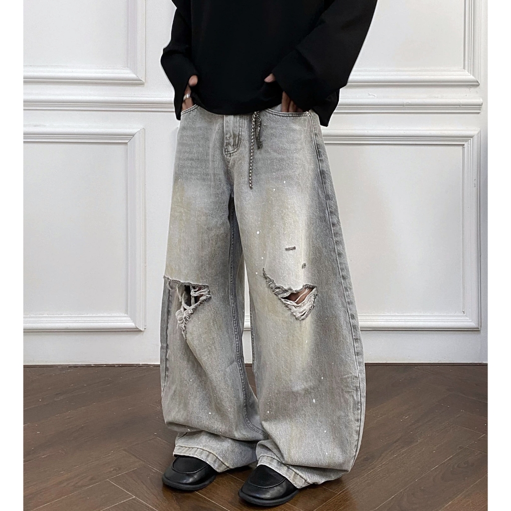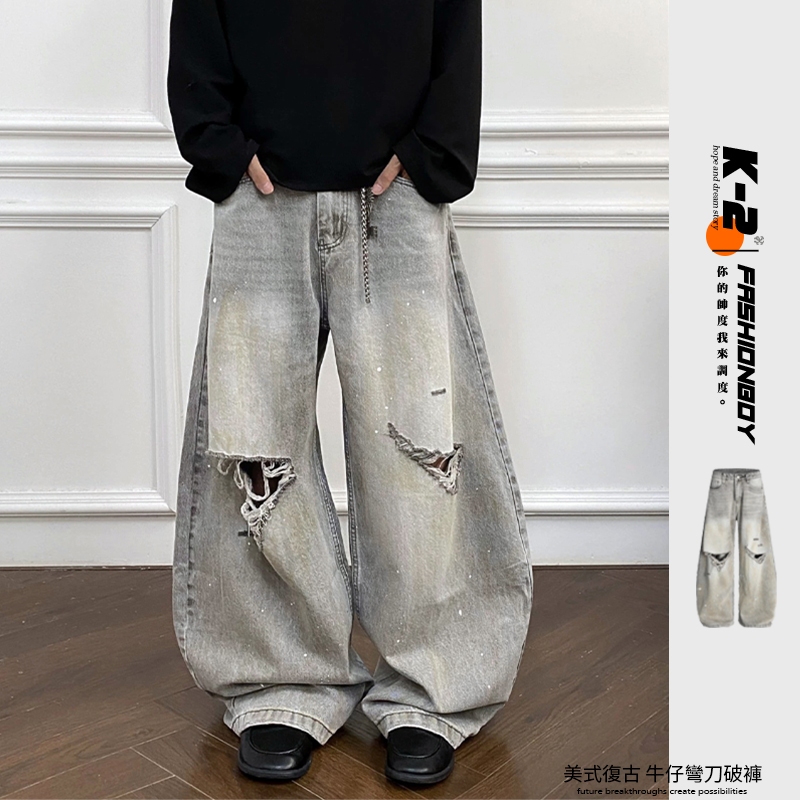 【K-2】美式復古 淺色 贓染潑漆 牛仔彎刀褲 闊腿褲 破膝褲 彎刀褲 牛仔褲 長褲 寬褲 Y2K K2【JN24】M|L|XL|XXLK-2 Fashionboy