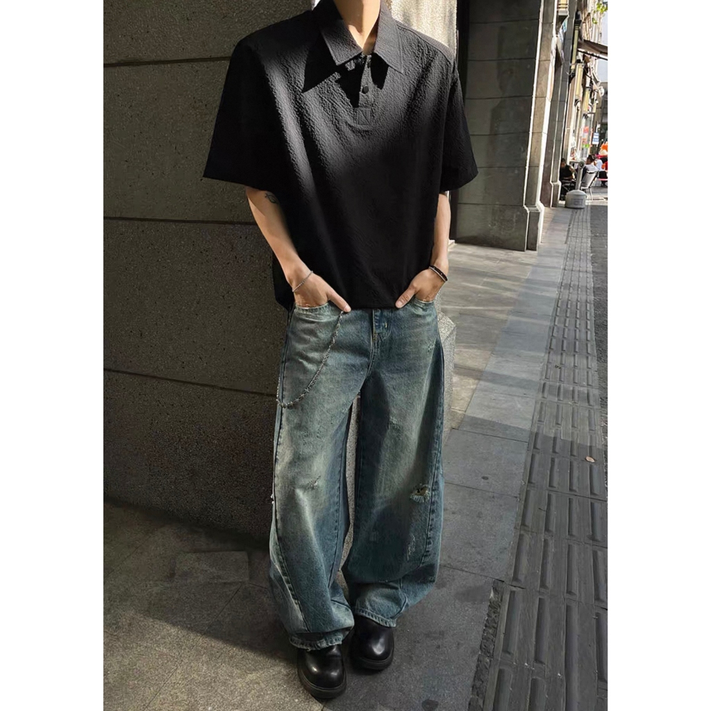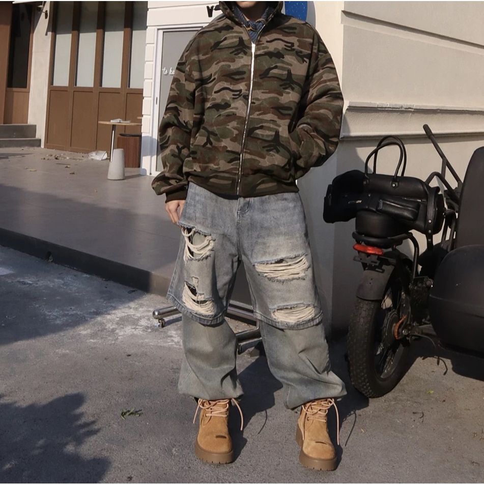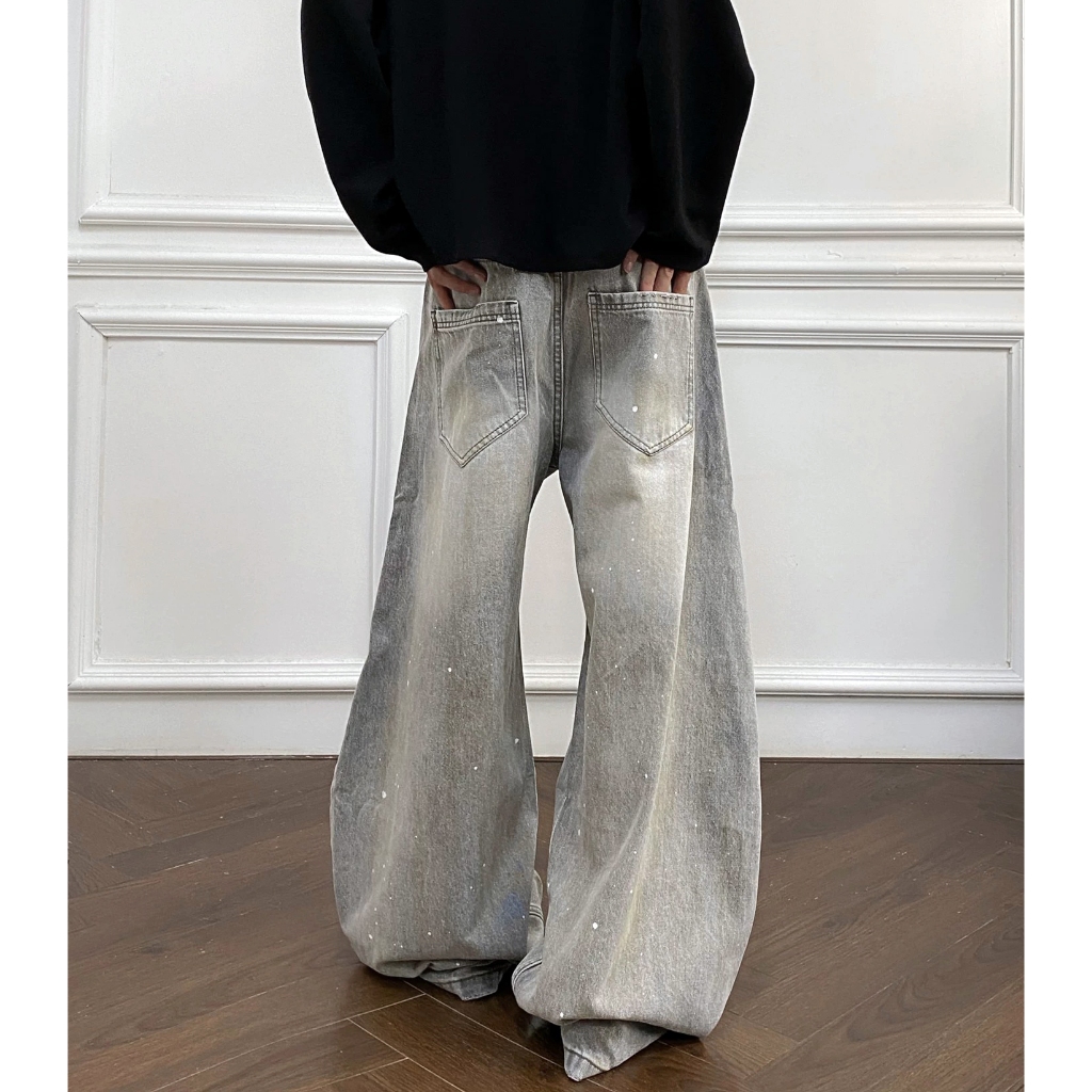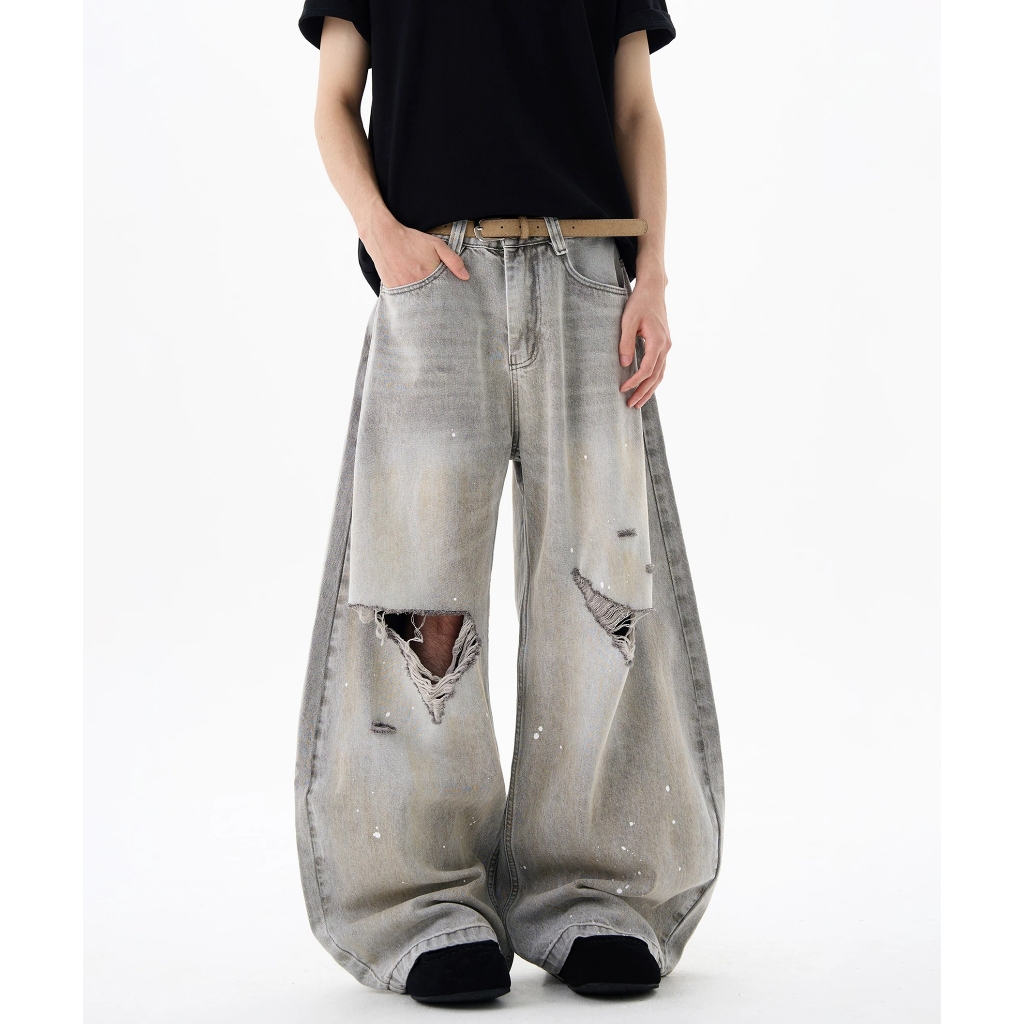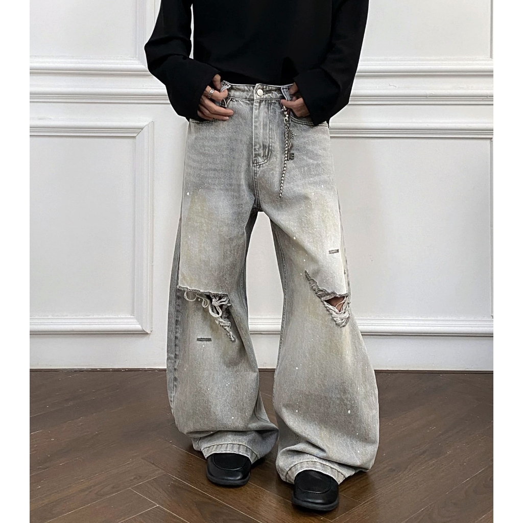【K-2】美式復古 淺色 贓染潑漆 牛仔彎刀褲 闊腿褲 破膝褲 彎刀褲 牛仔褲 長褲 寬褲 Y2K K2【JN24】M|L|XL|XXLK-2 Fashionboy