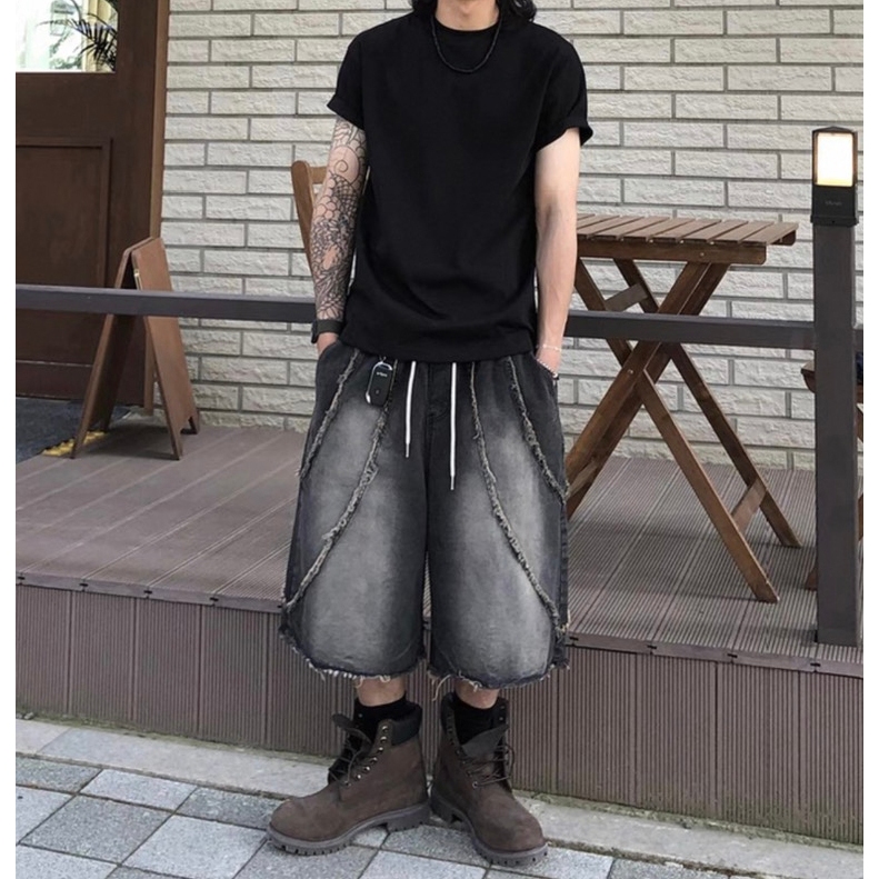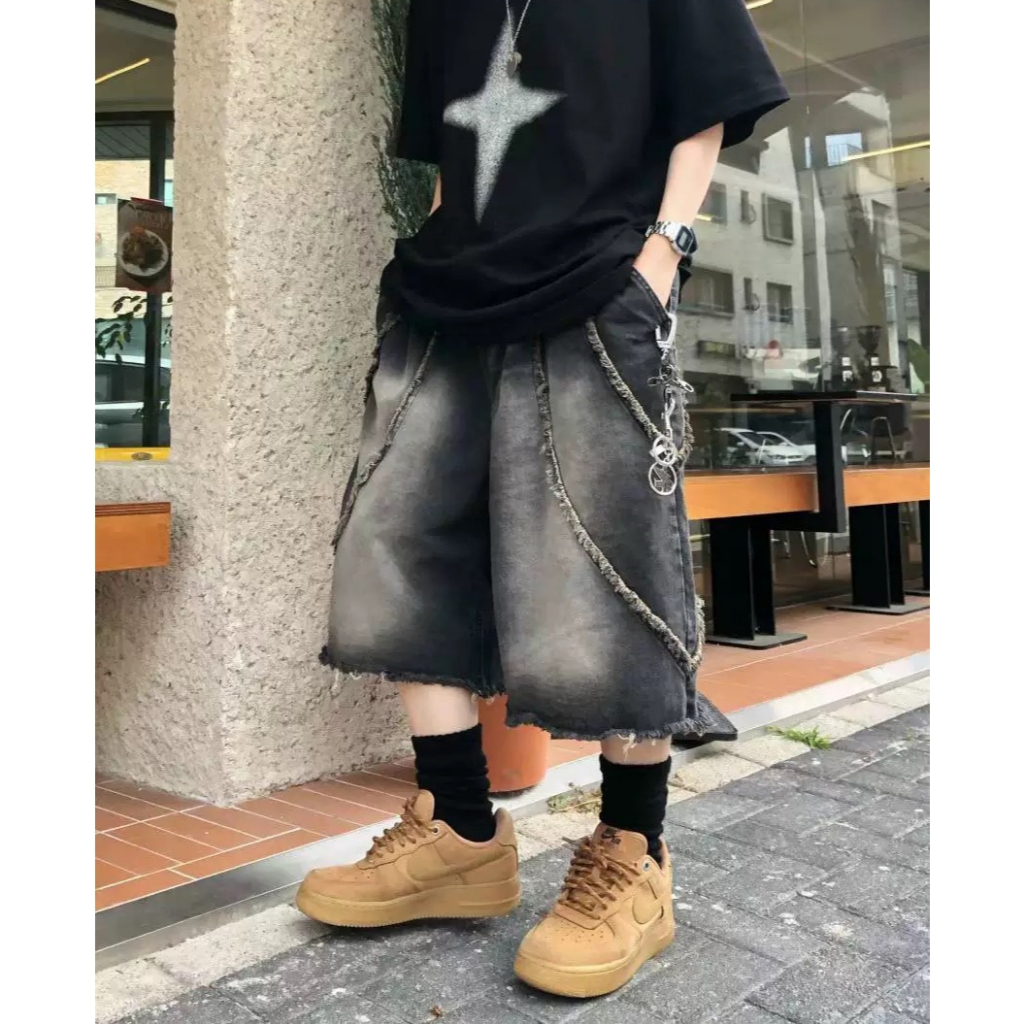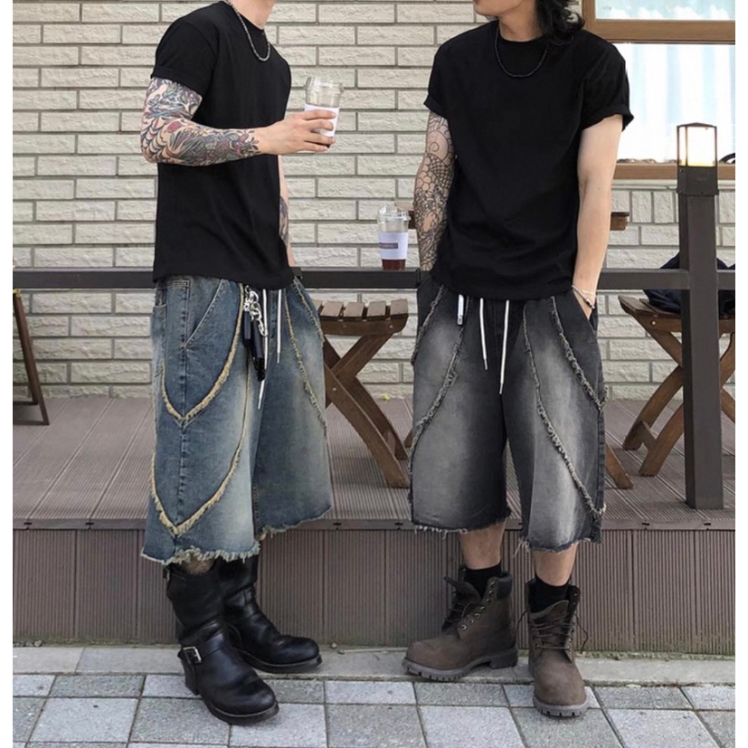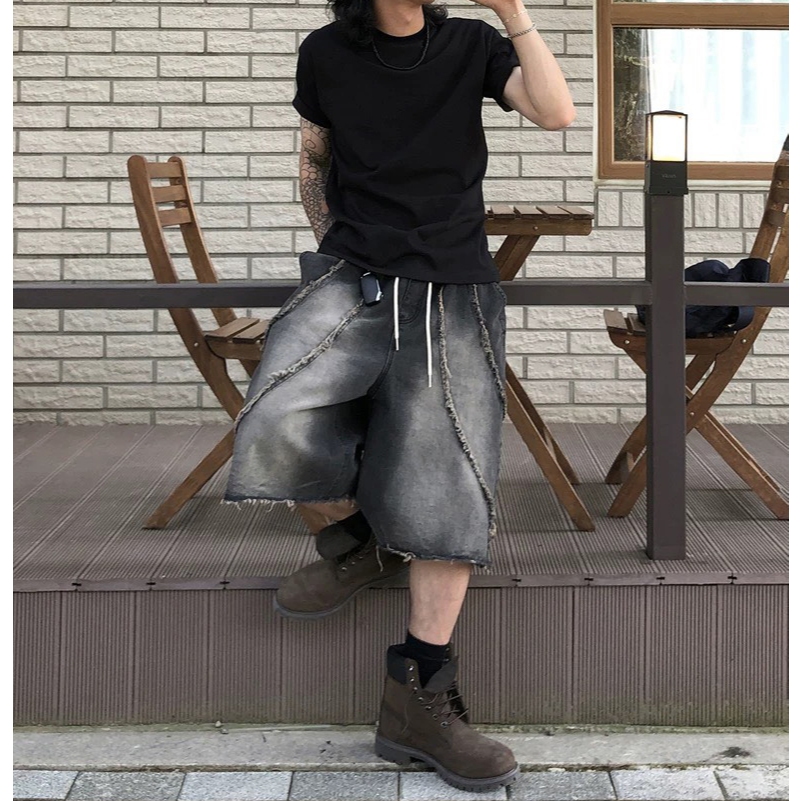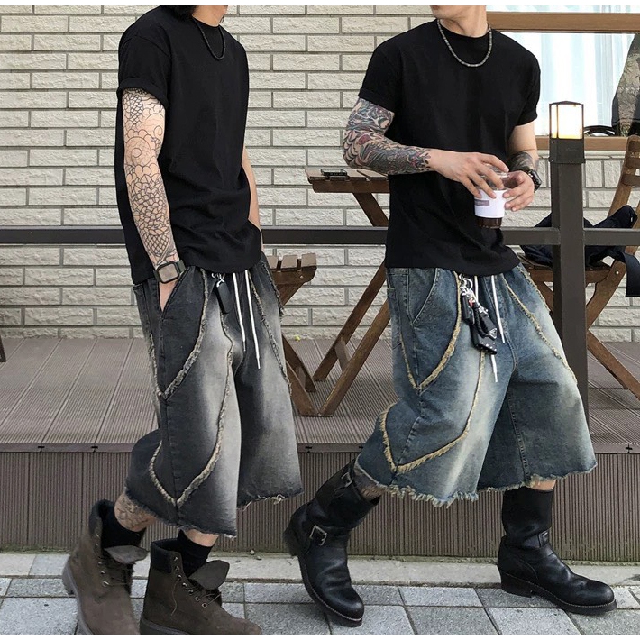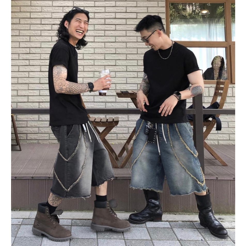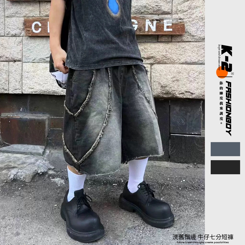 【K-2】美式復古 洗舊鬚邊 毛邊 水洗 刷色 七分牛仔褲 牛仔寬褲 七分褲 闊腿褲 寬褲 牛仔短褲 K【K2WP02】藍色,M|藍色,L|黑色,M|黑色,LK-2 Fashionboy