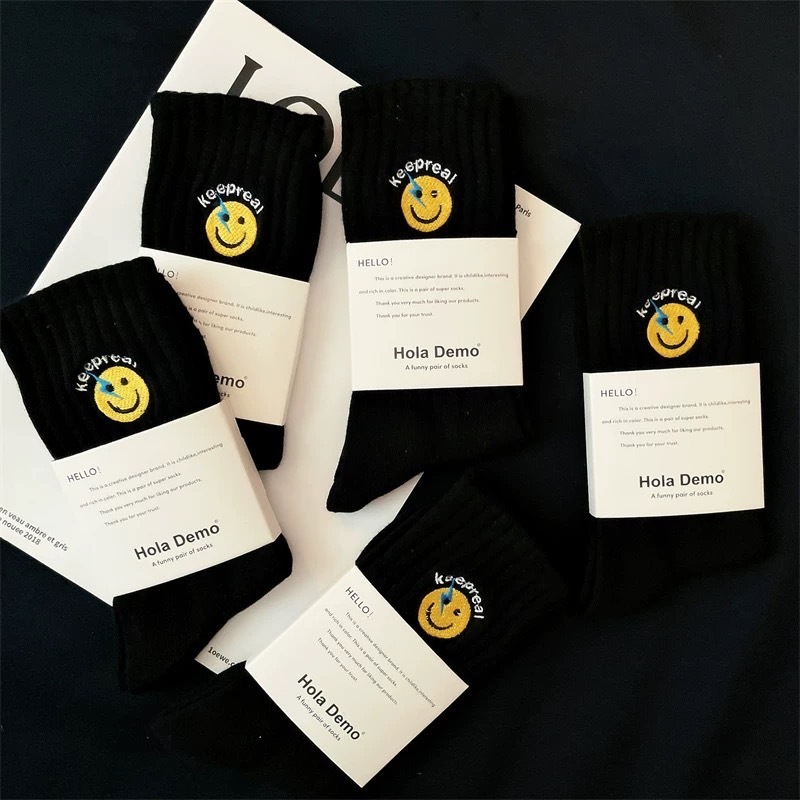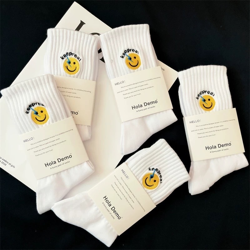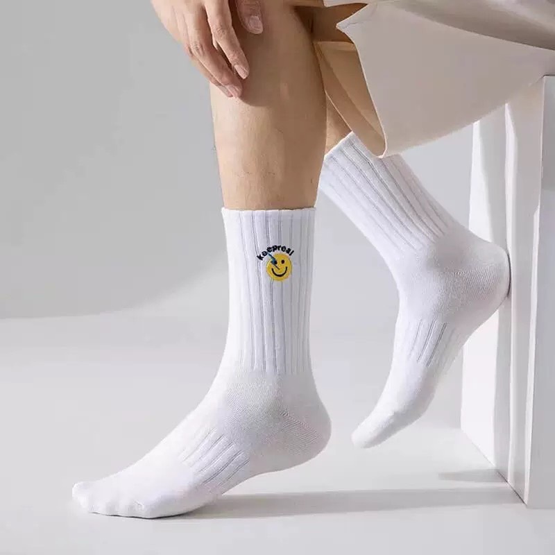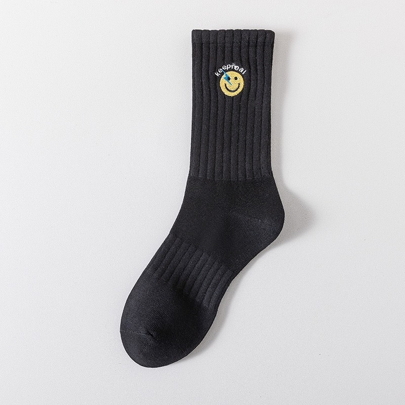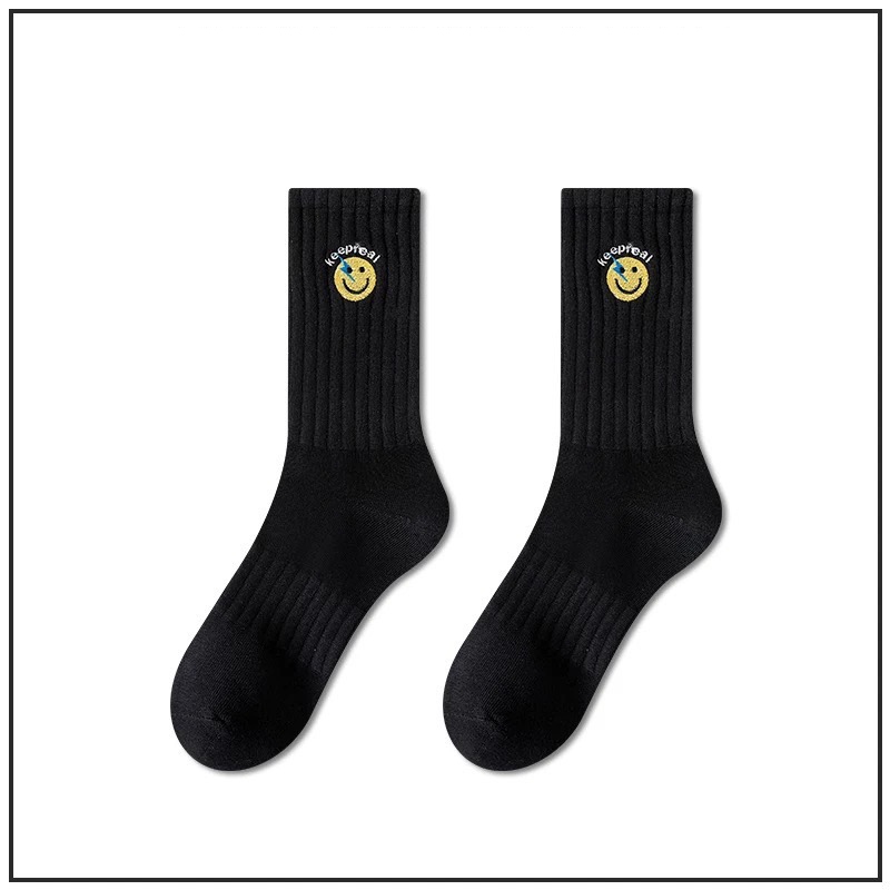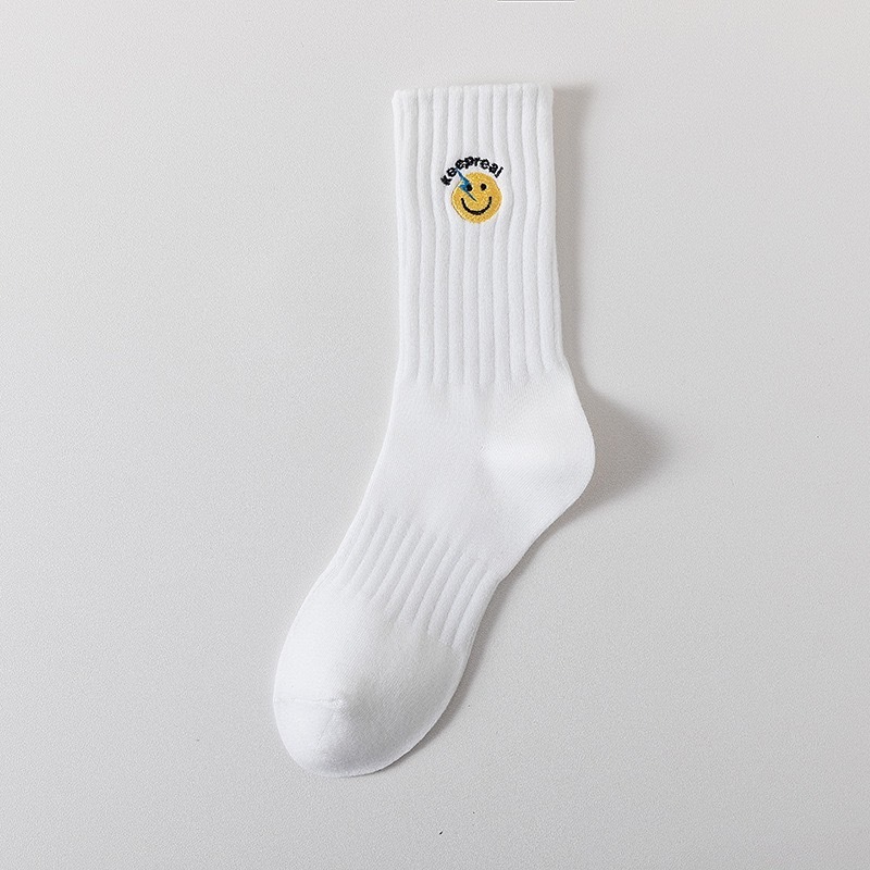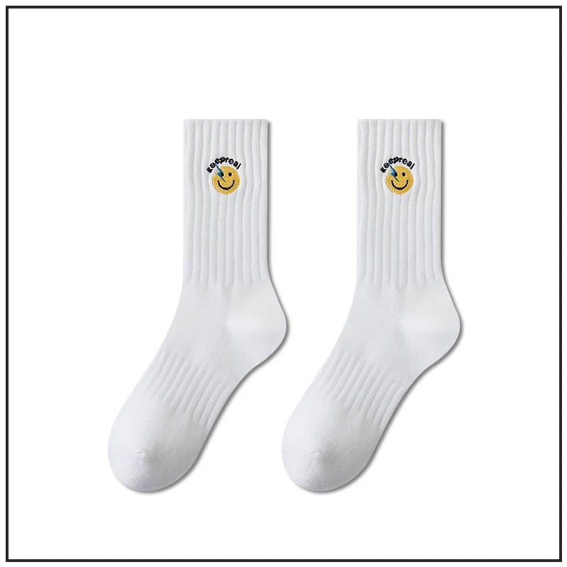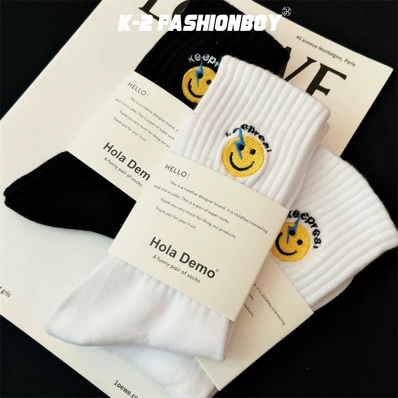 【K-2】刺繡笑臉 閃電 棉襪 長襪 高筒襪 刺繡襪 襪子 男襪 女襪 穿搭 襪 純棉 微笑 smile【KM148】白色|黑色K-2 Fashionboy