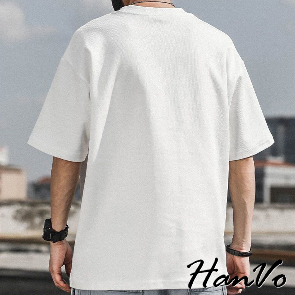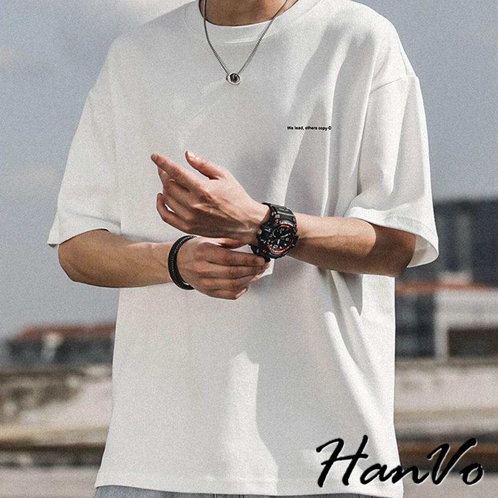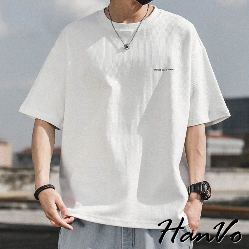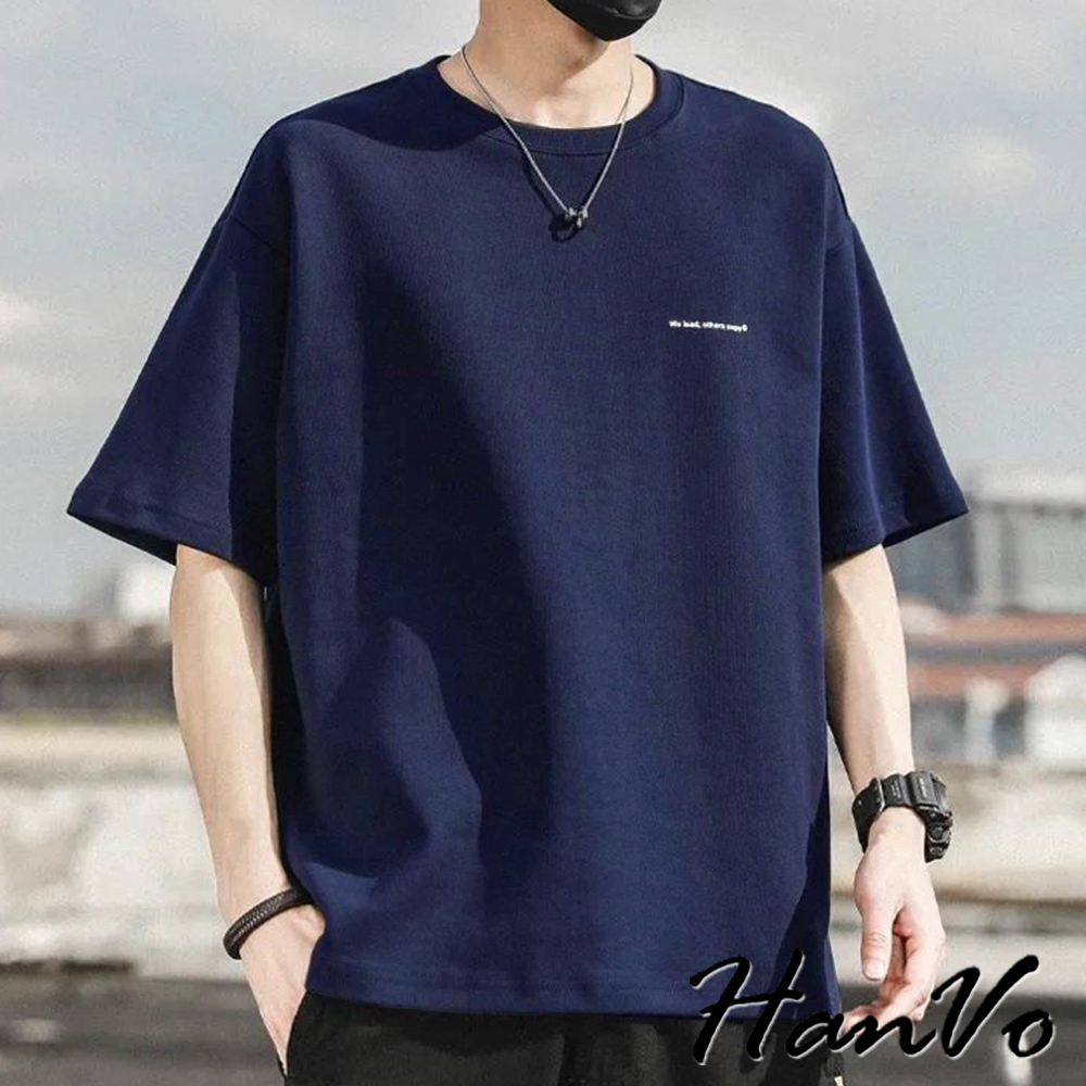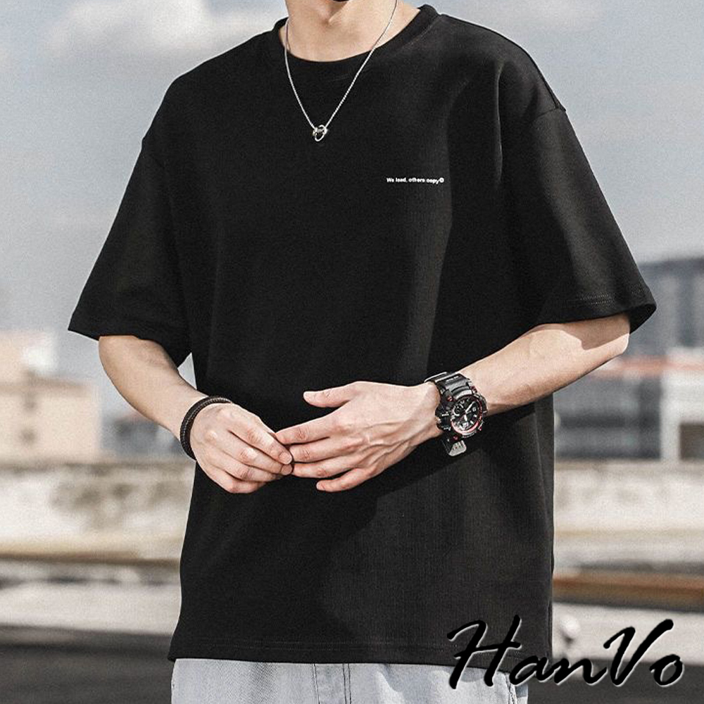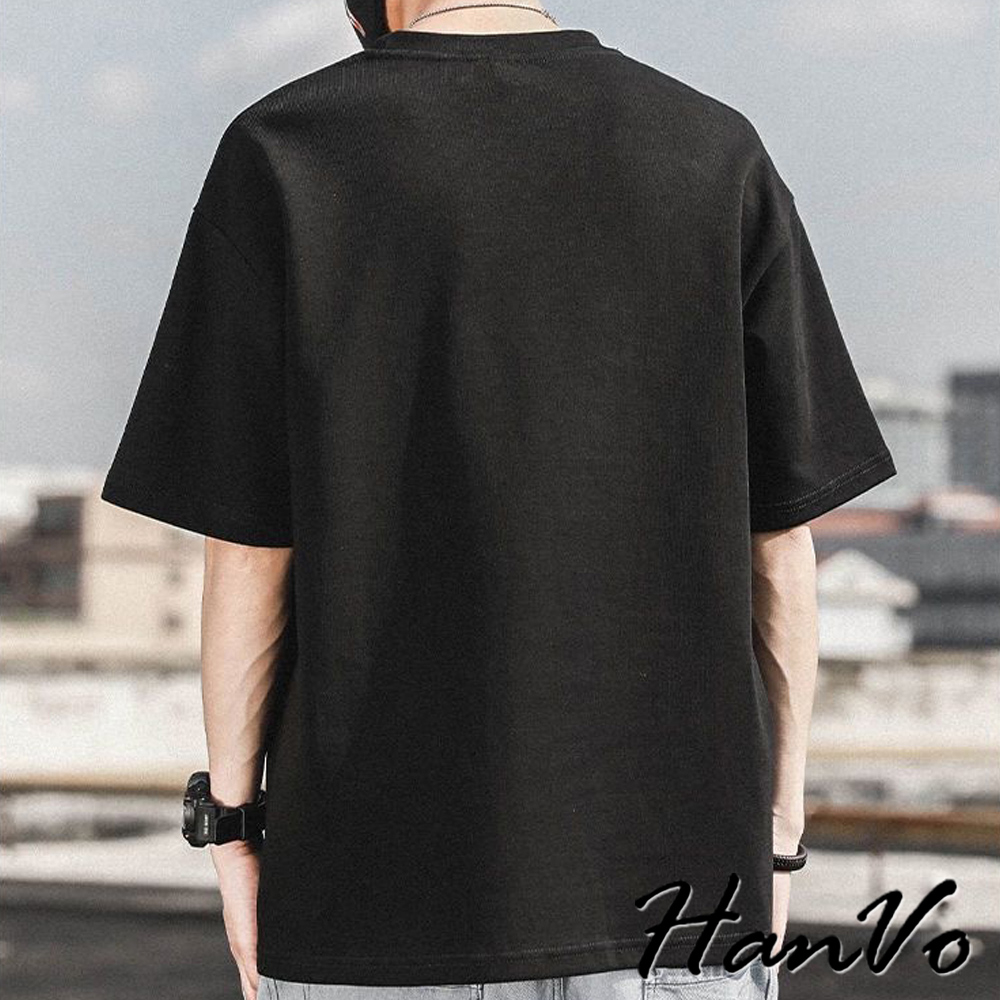 【HanVo】男款簡約英文字純棉上衣 舒適透氣潮流美式短袖上衣 夏季潮流T恤 男生衣著 B01-1032淺藍|白色|黑色|深藍T-ShirtsHanVo Wear Collection
