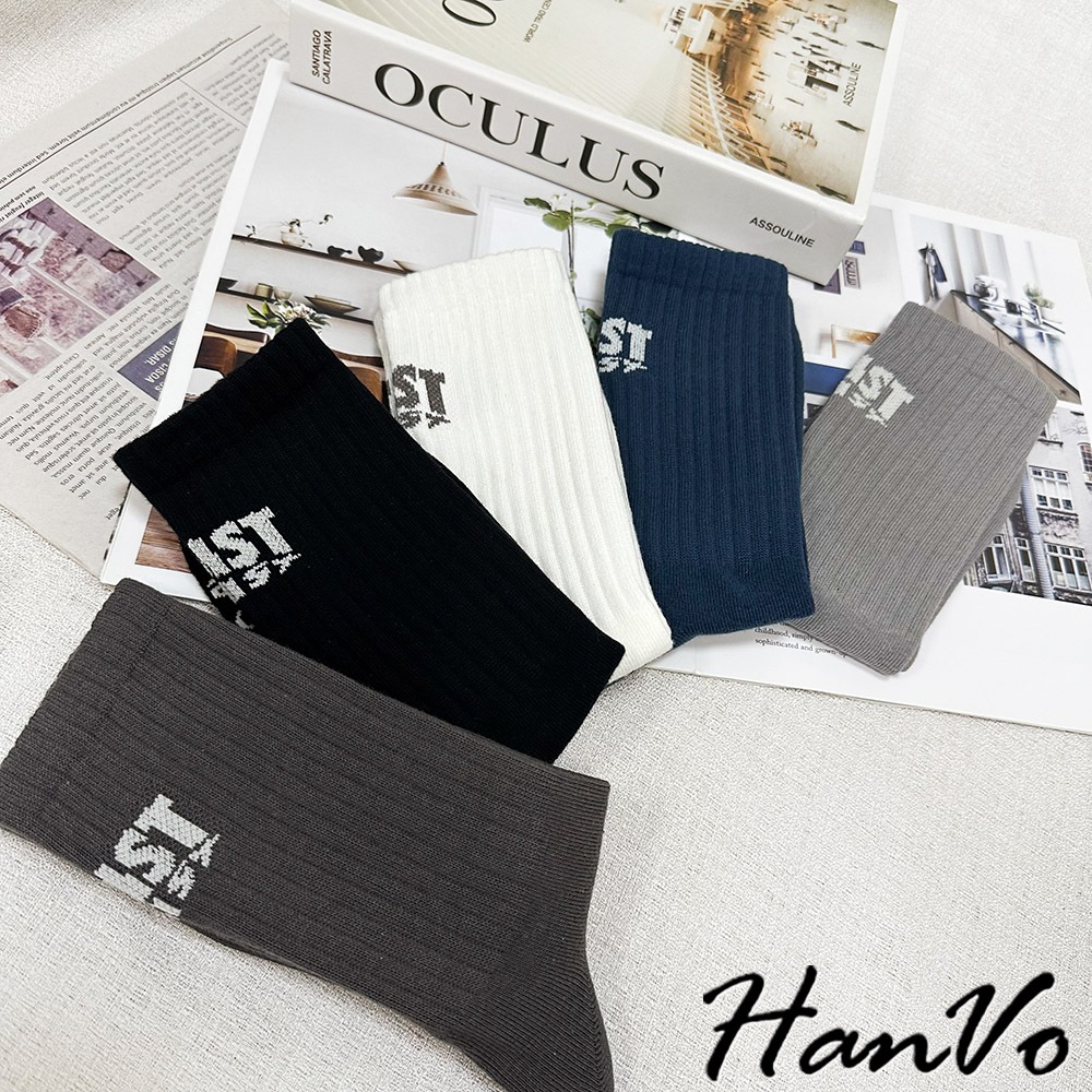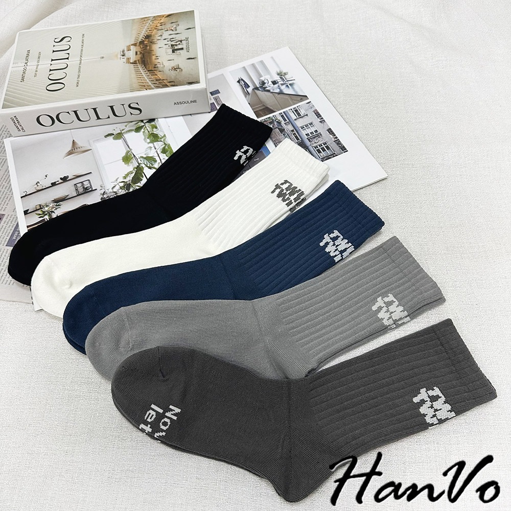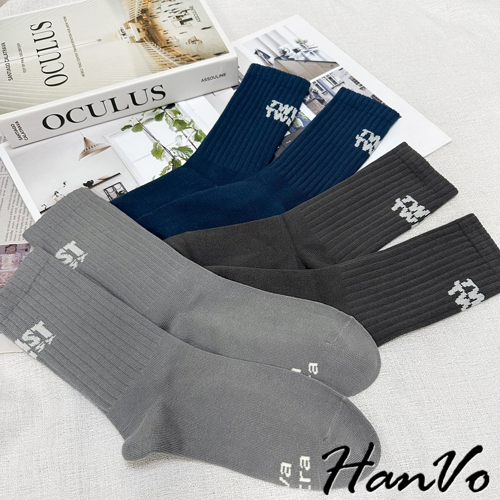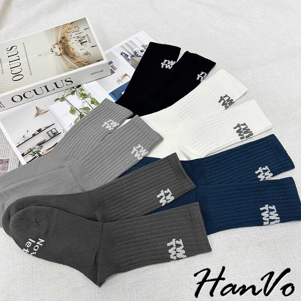 【HanVo】男款腳後跟字母中筒襪 棉質潮流時尚純色百搭 韓系簡約舒適 男生配件 B07-7033摩登黑|煙幕灰|孔雀藍|淺霧灰HanVo Wear Collection
