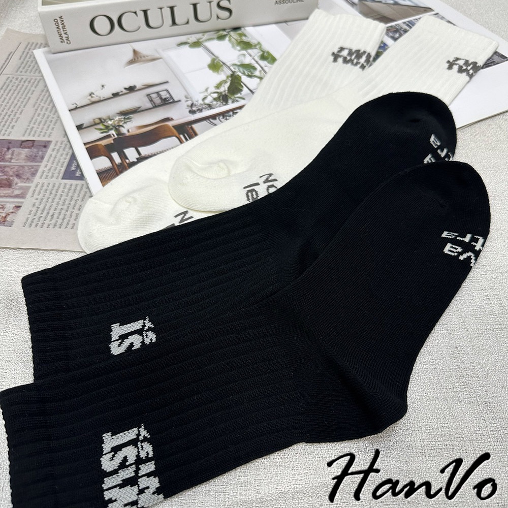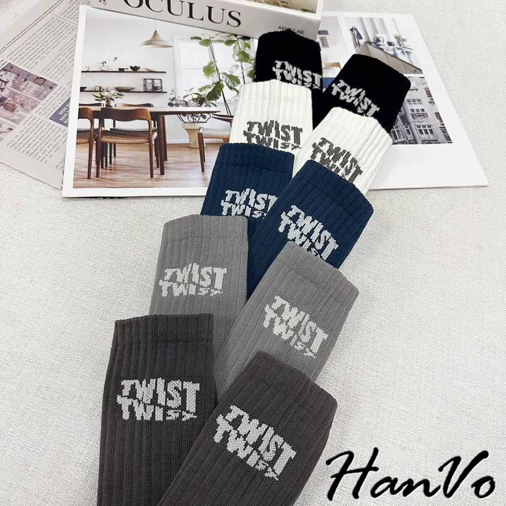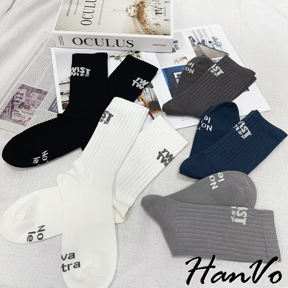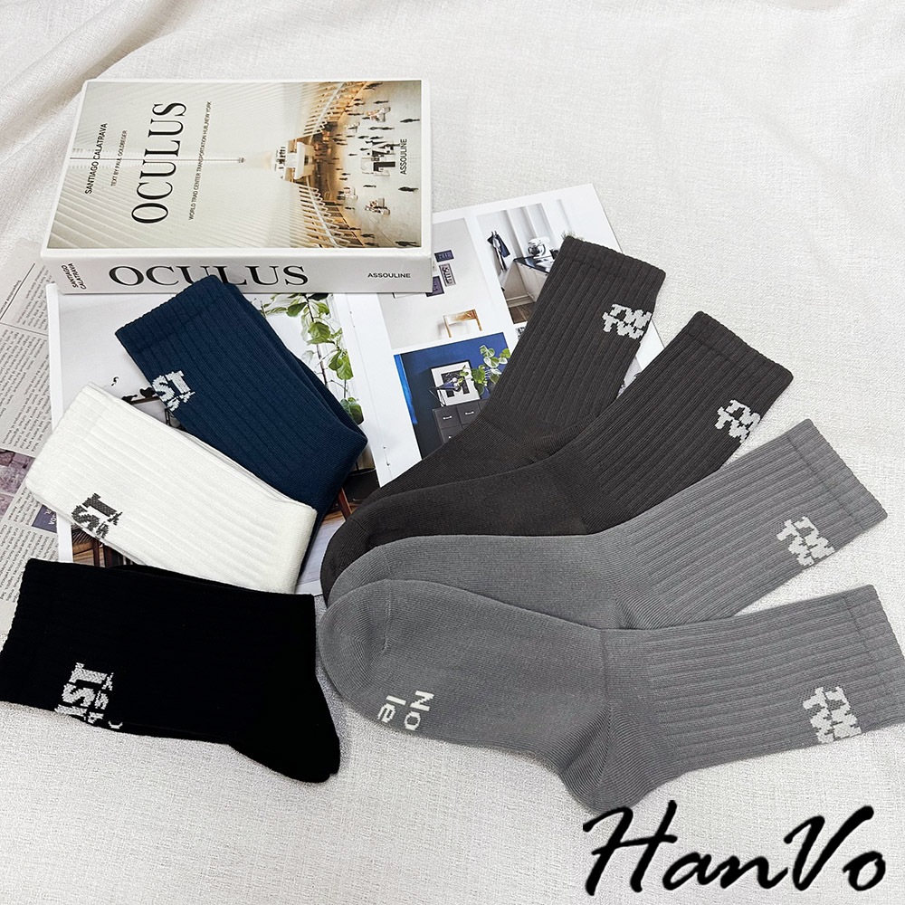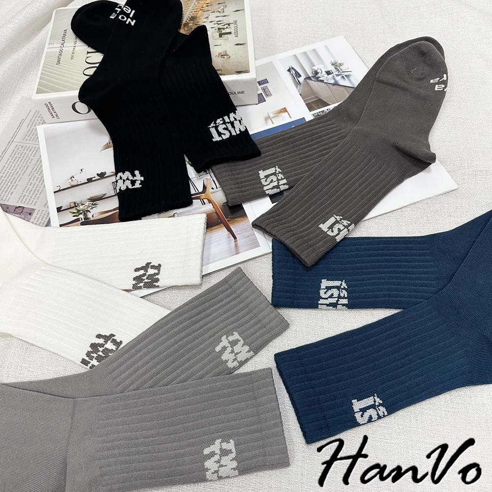【HanVo】男款腳後跟字母中筒襪 棉質潮流時尚純色百搭 韓系簡約舒適 男生配件 B07-7033摩登黑|煙幕灰|孔雀藍|淺霧灰HanVo Wear Collection