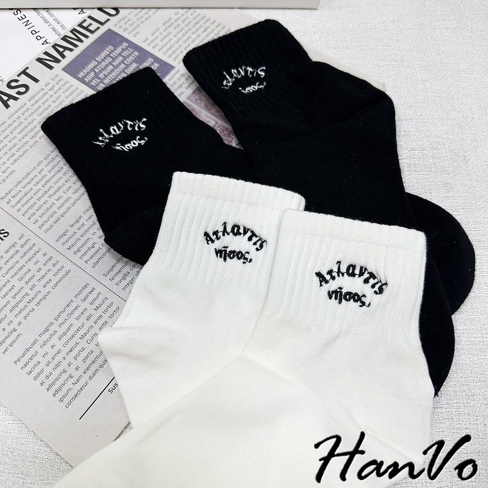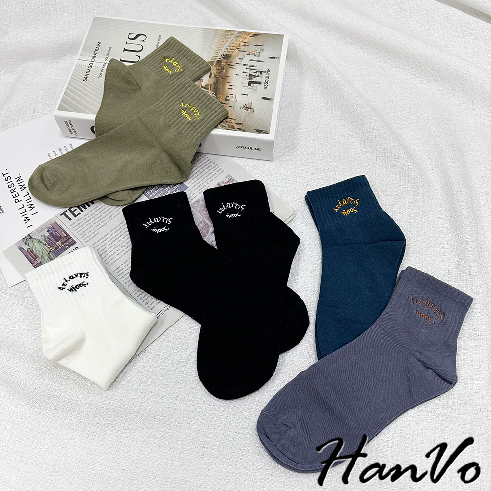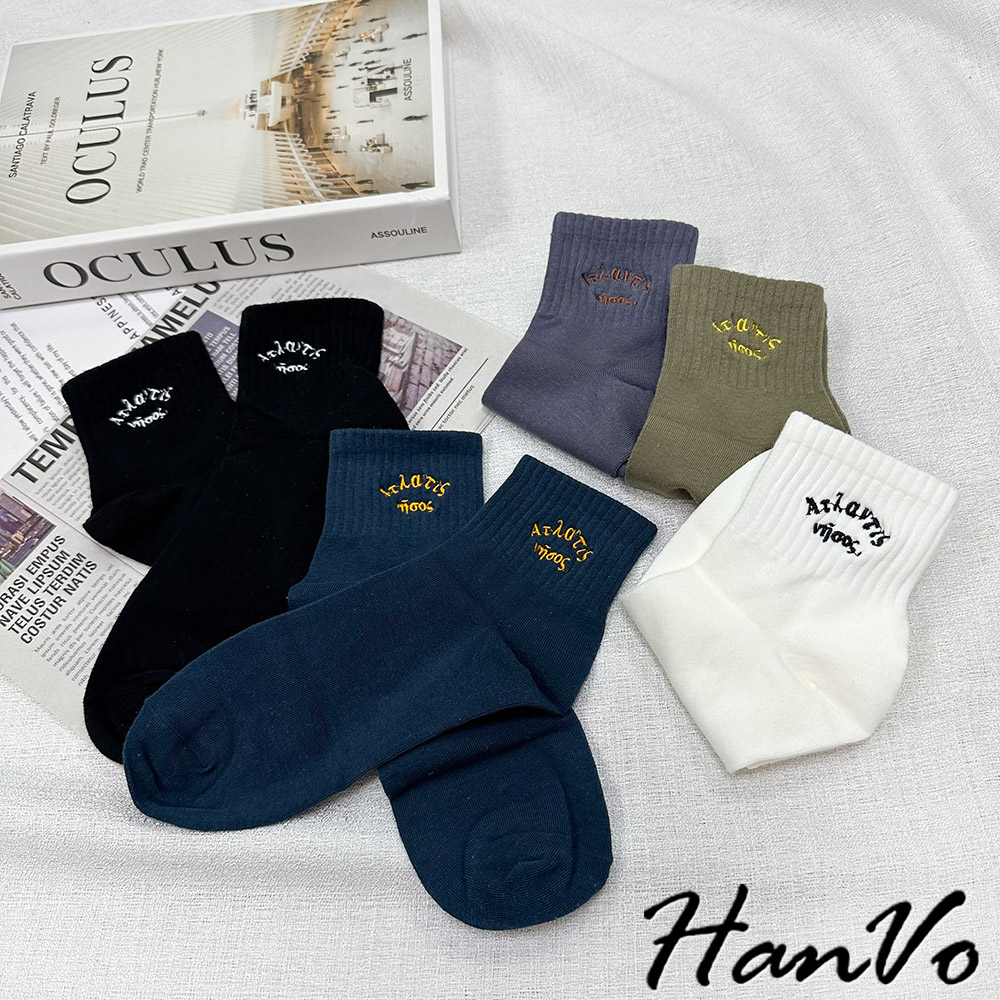 • 【HanVo】男款草寫字母刺繡中筒襪 百搭潮流舒適透氣棉質襪 韓系時尚休閒親膚棉襪 男生配件 B07-7015