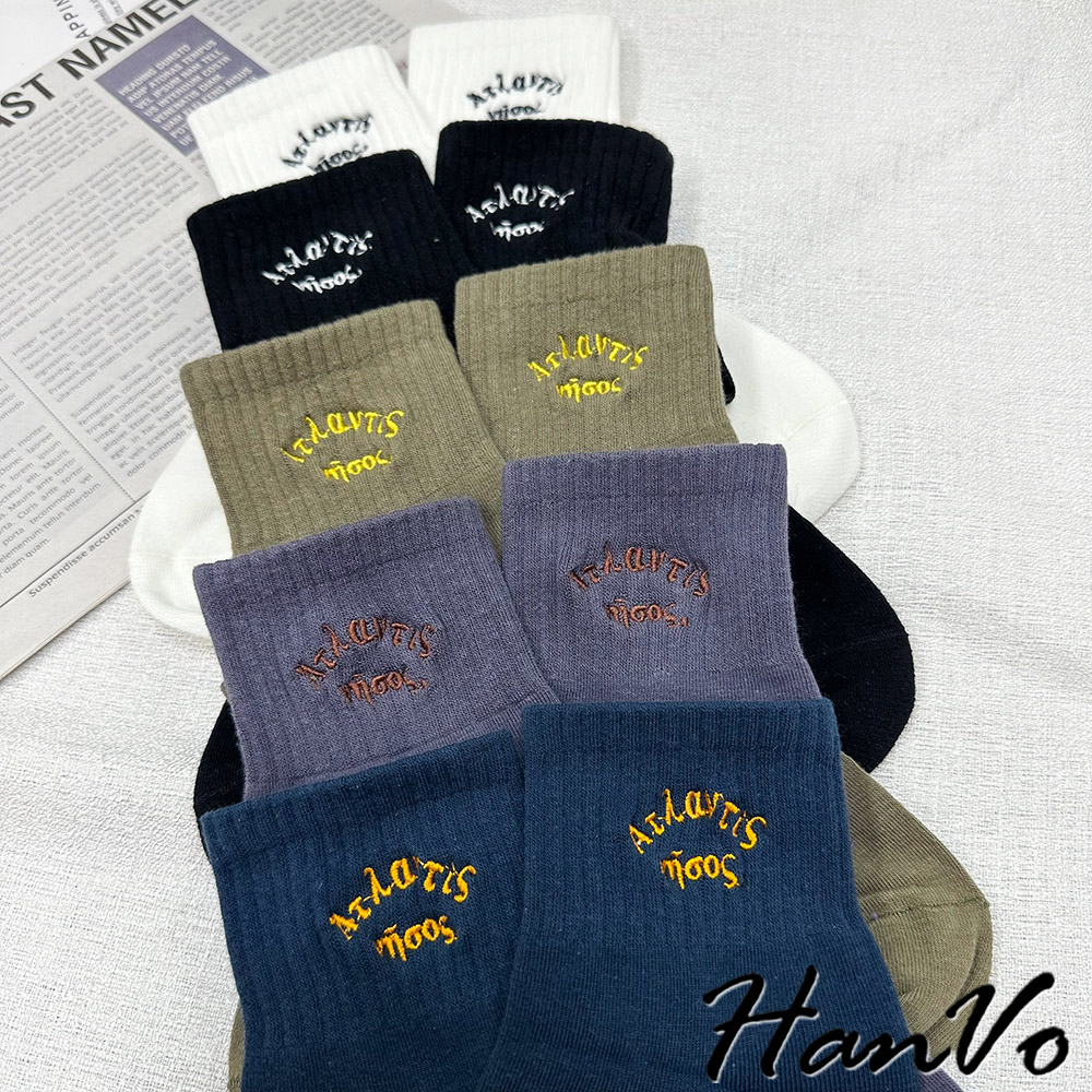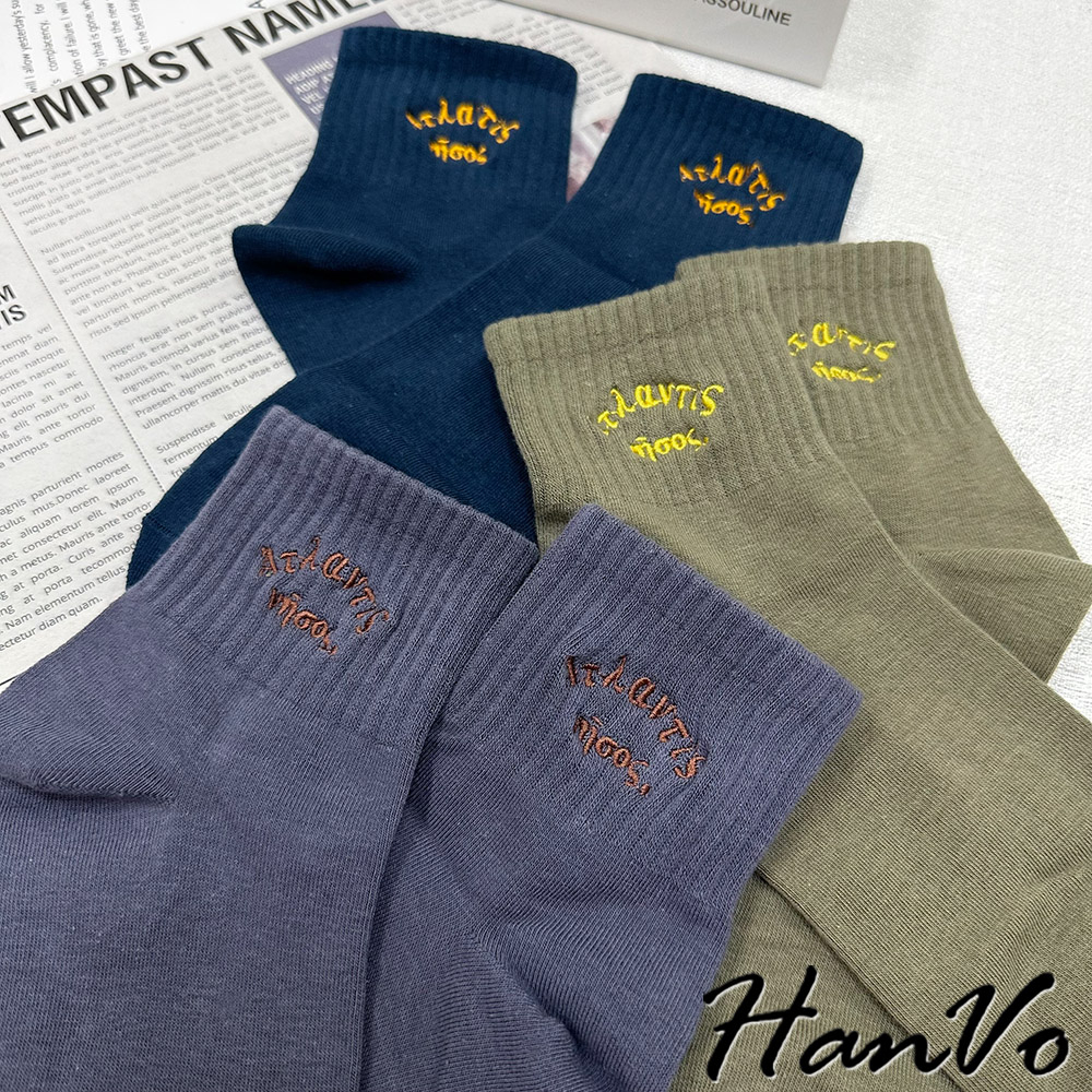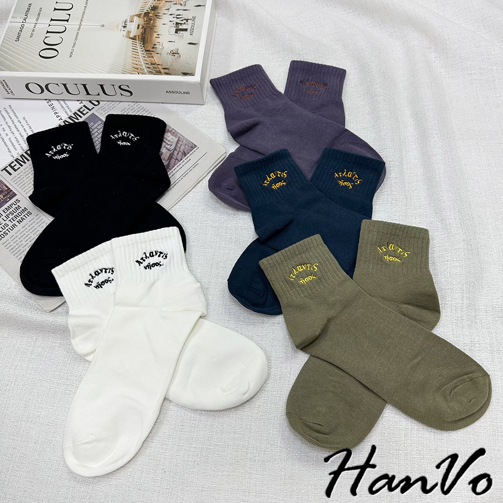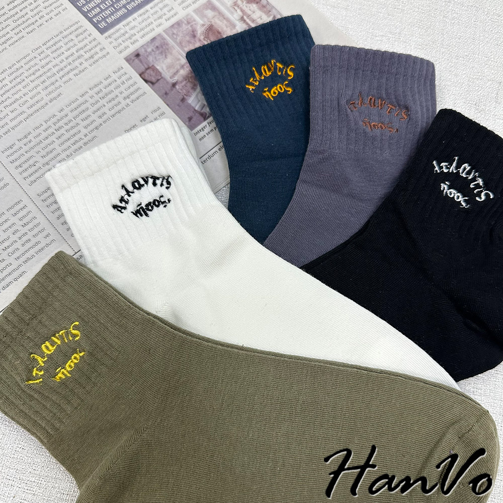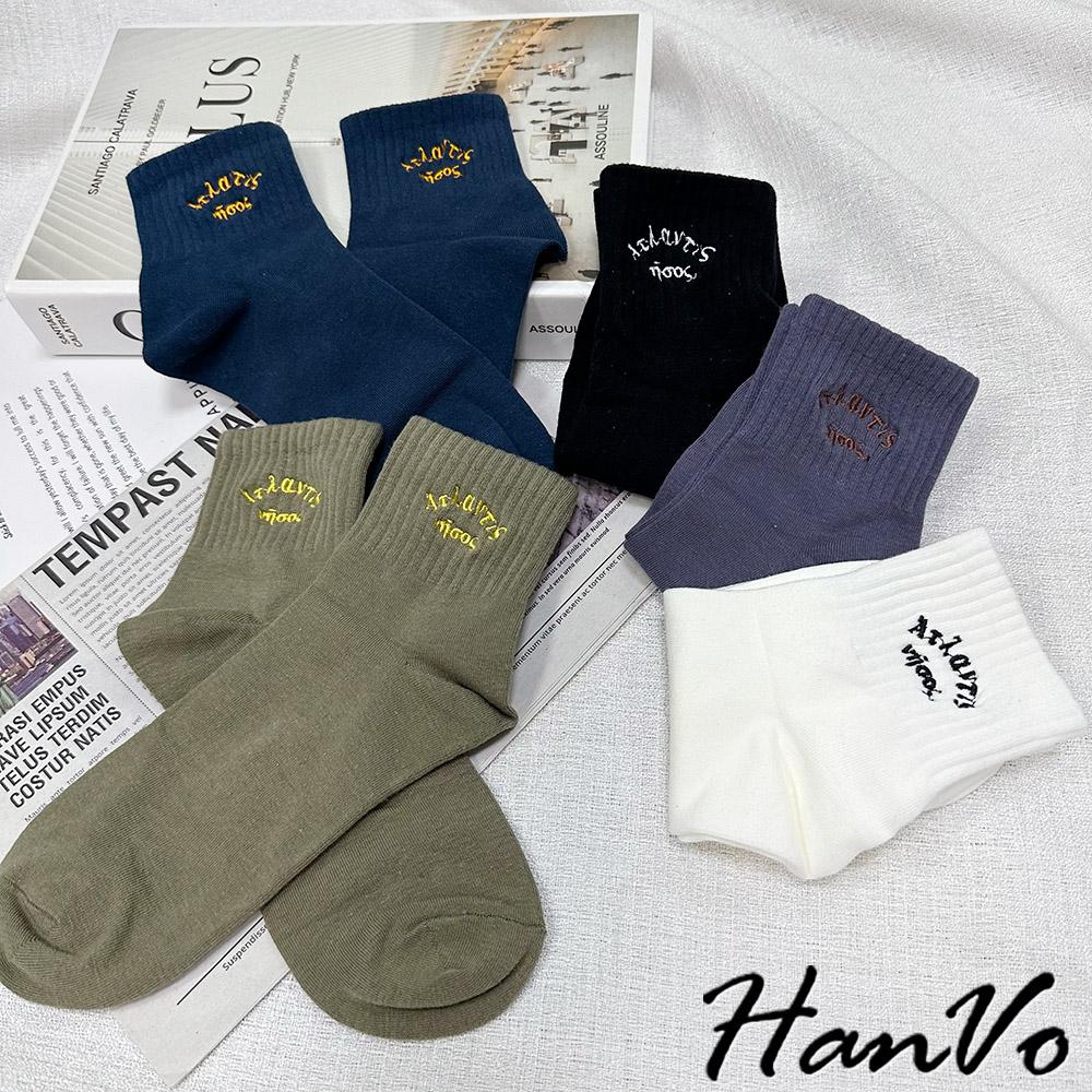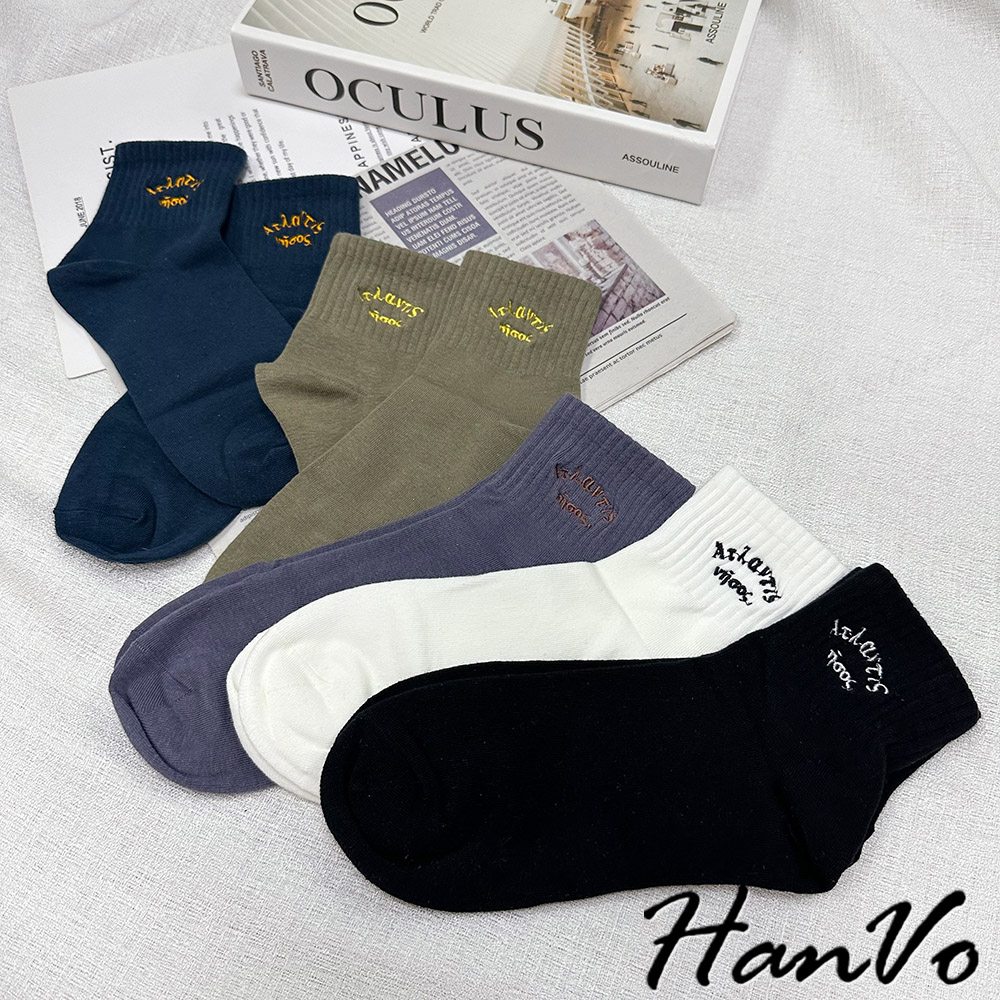 【HanVo】男款草寫字母刺繡中筒襪 百搭潮流舒適透氣棉質襪 韓系時尚休閒親膚棉襪 男生配件 B07-7015卡其綠|灰紫色|黑色|白色|孔雀藍HanVo Wear Collection