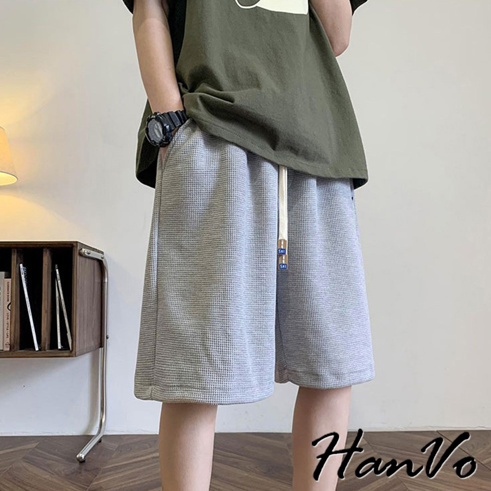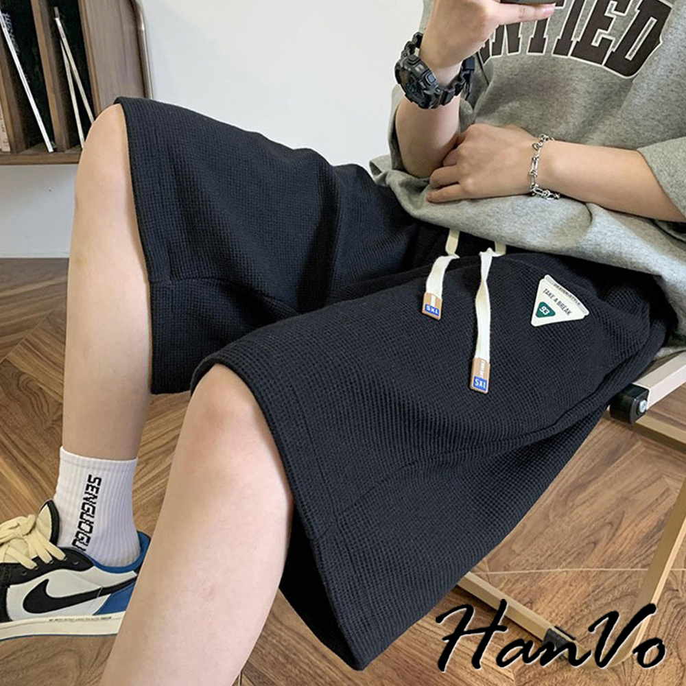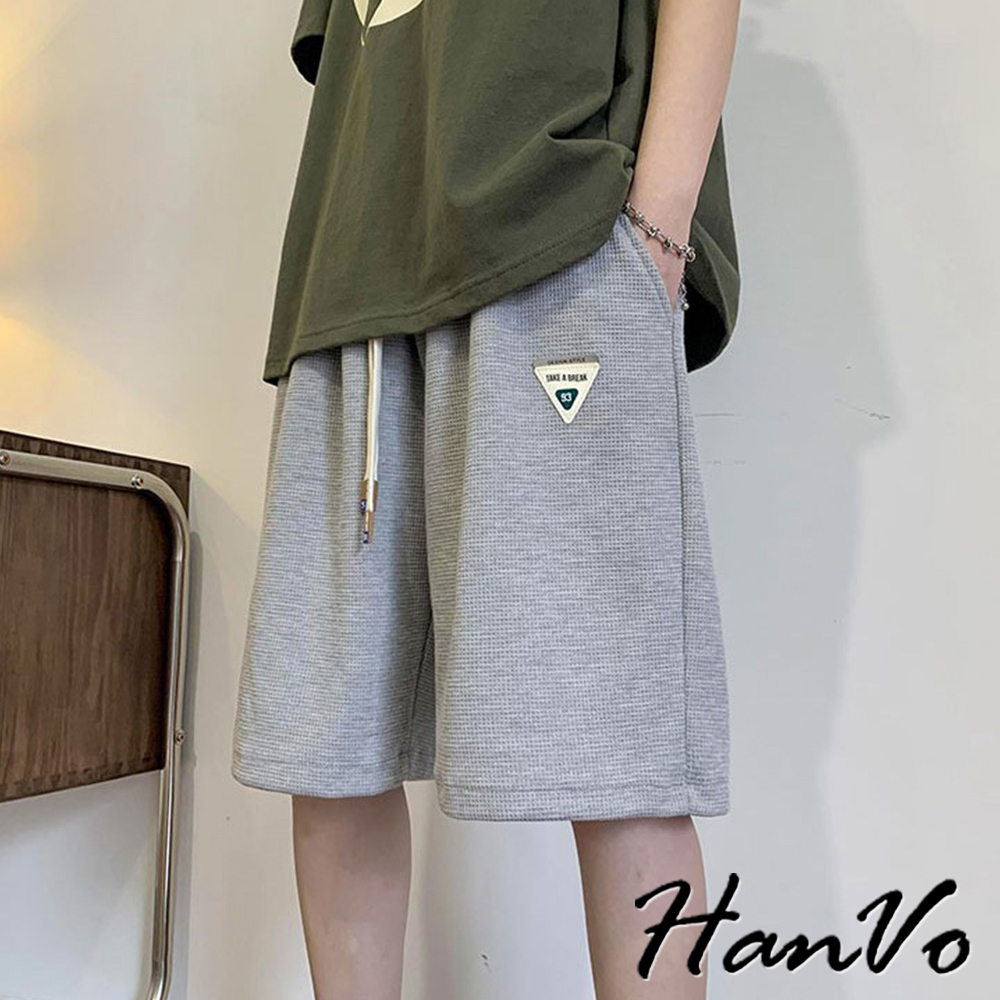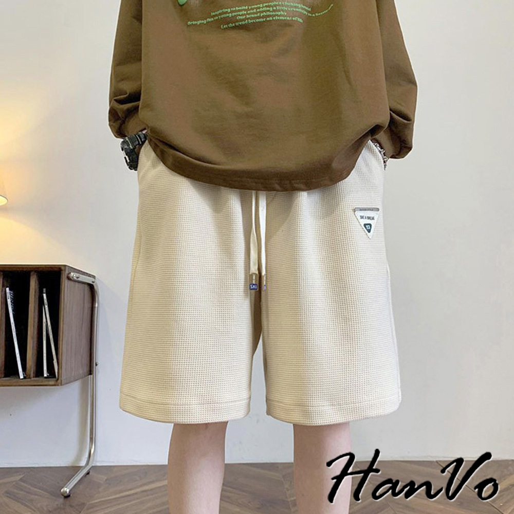 【HanVo】男款三角標籤華夫格抽繩短褲 舒適透氣休閒設計五分褲 夏季潮流褲 男生下著 B03-3012黑色|灰色|杏色HanVo Wear Collection
