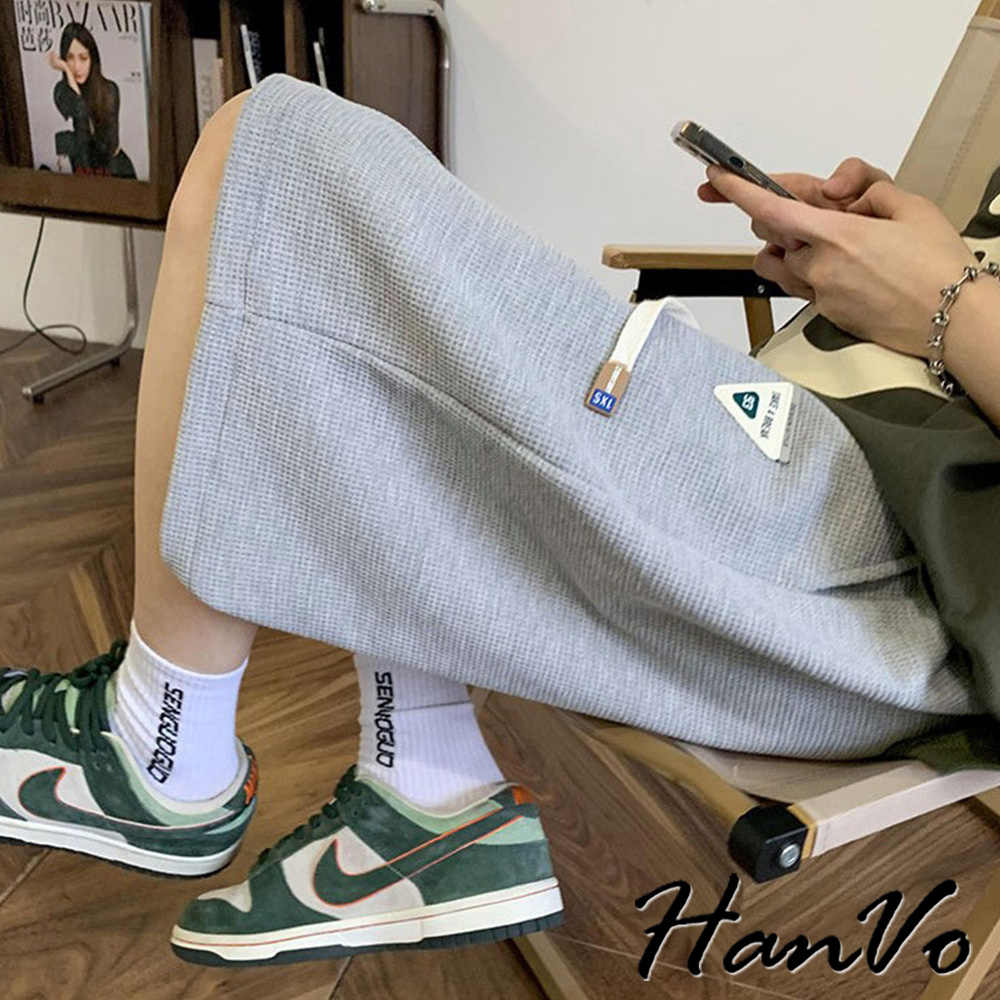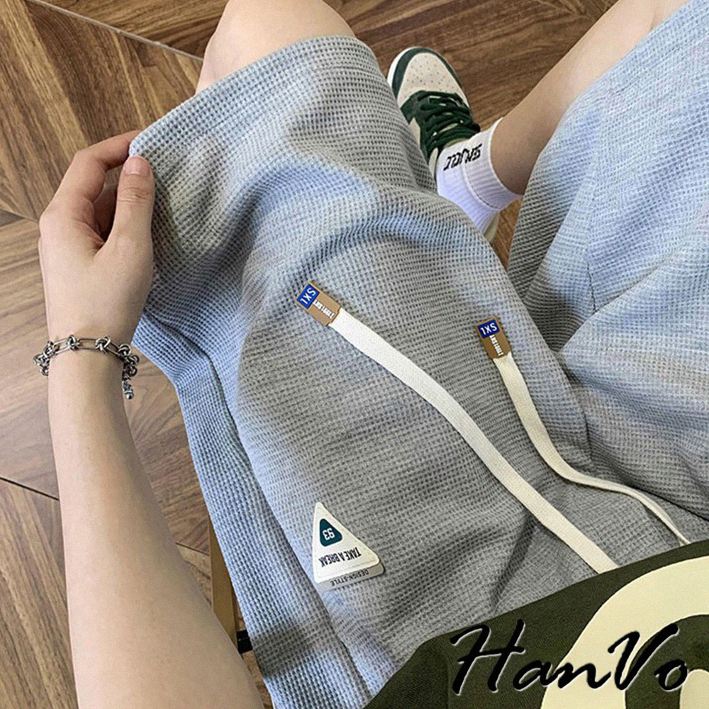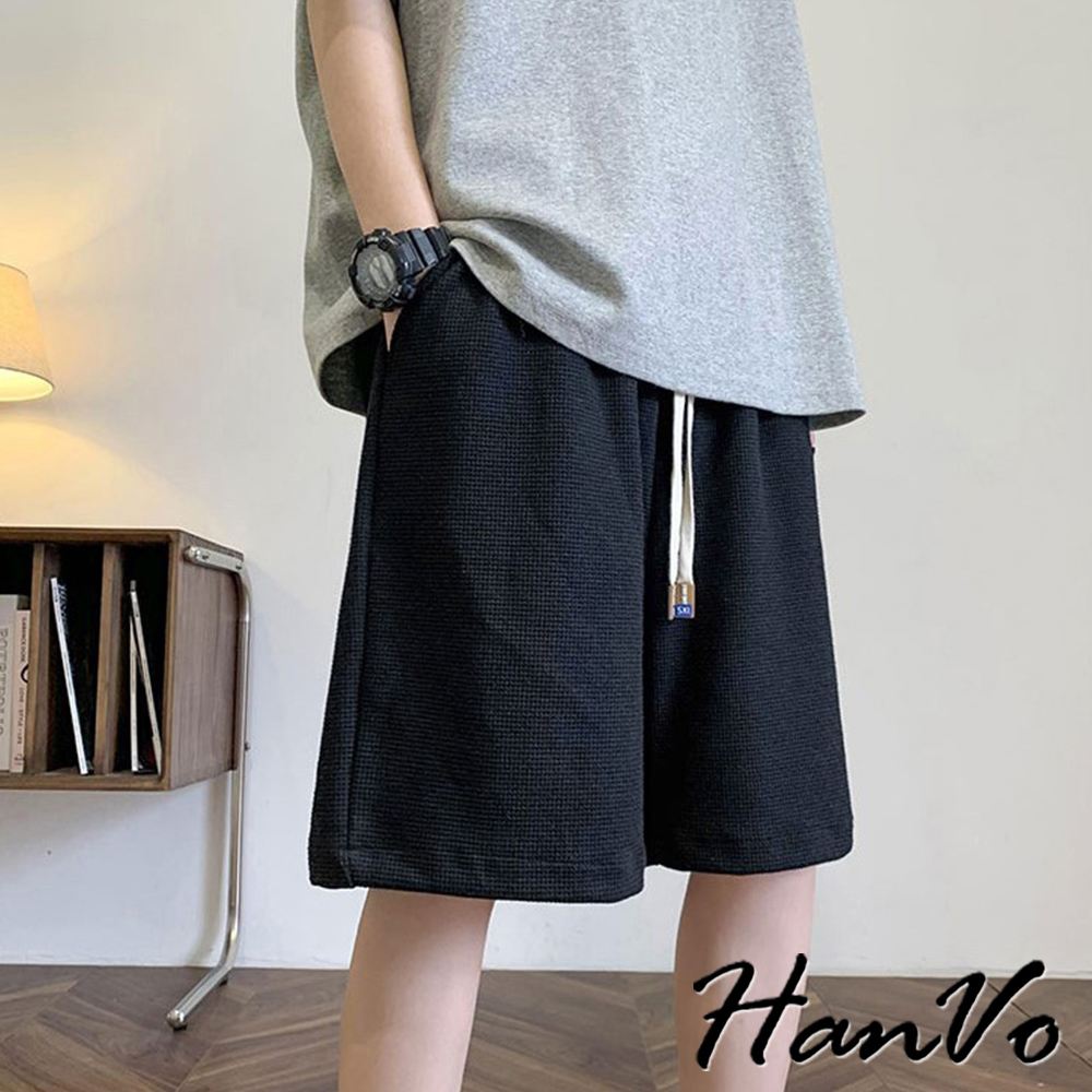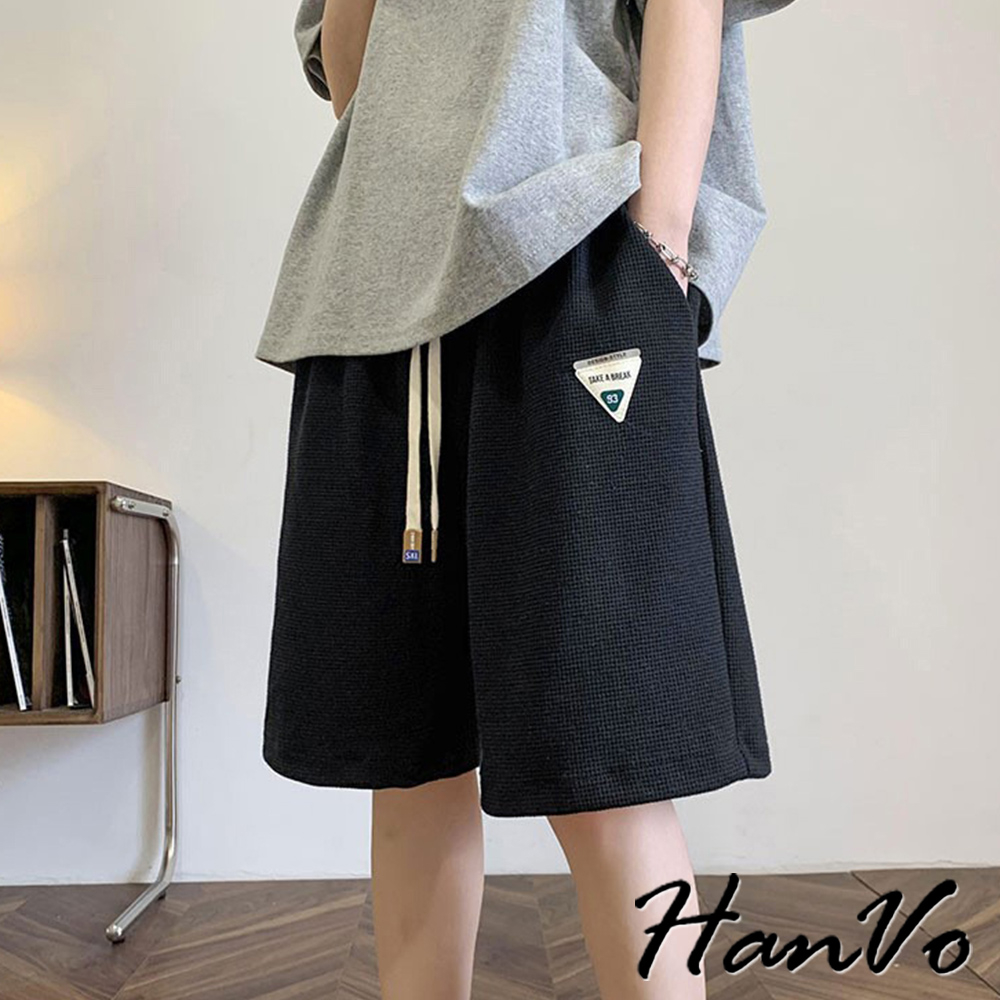 【HanVo】男款三角標籤華夫格抽繩短褲 舒適透氣休閒設計五分褲 夏季潮流褲 男生下著 B03-3012黑色|灰色|杏色HanVo Wear Collection