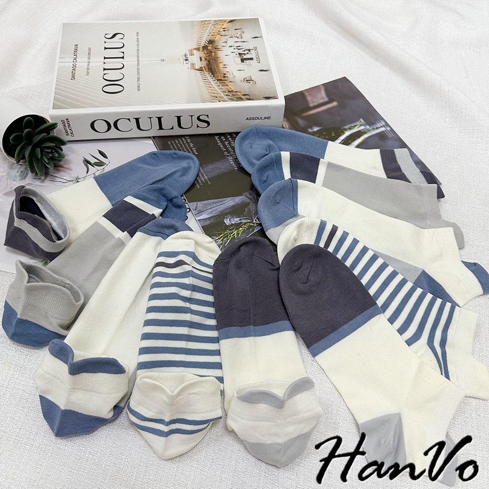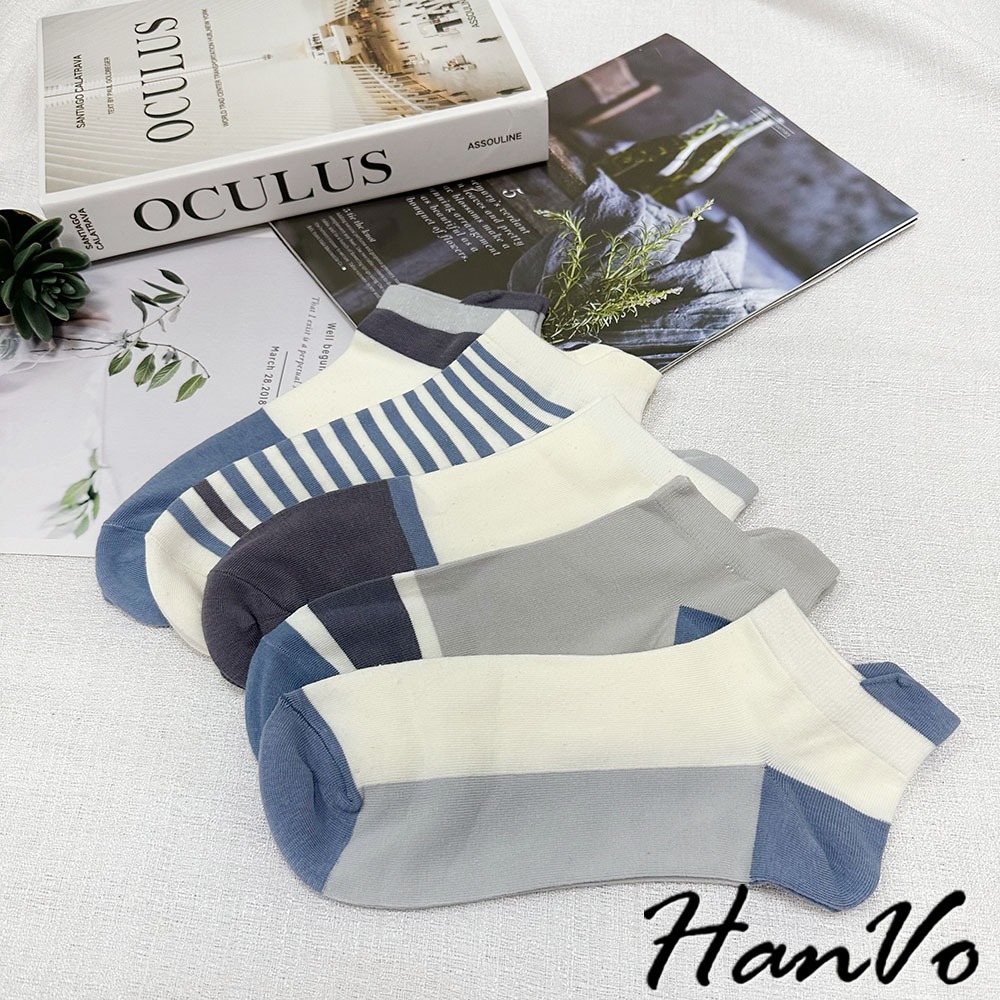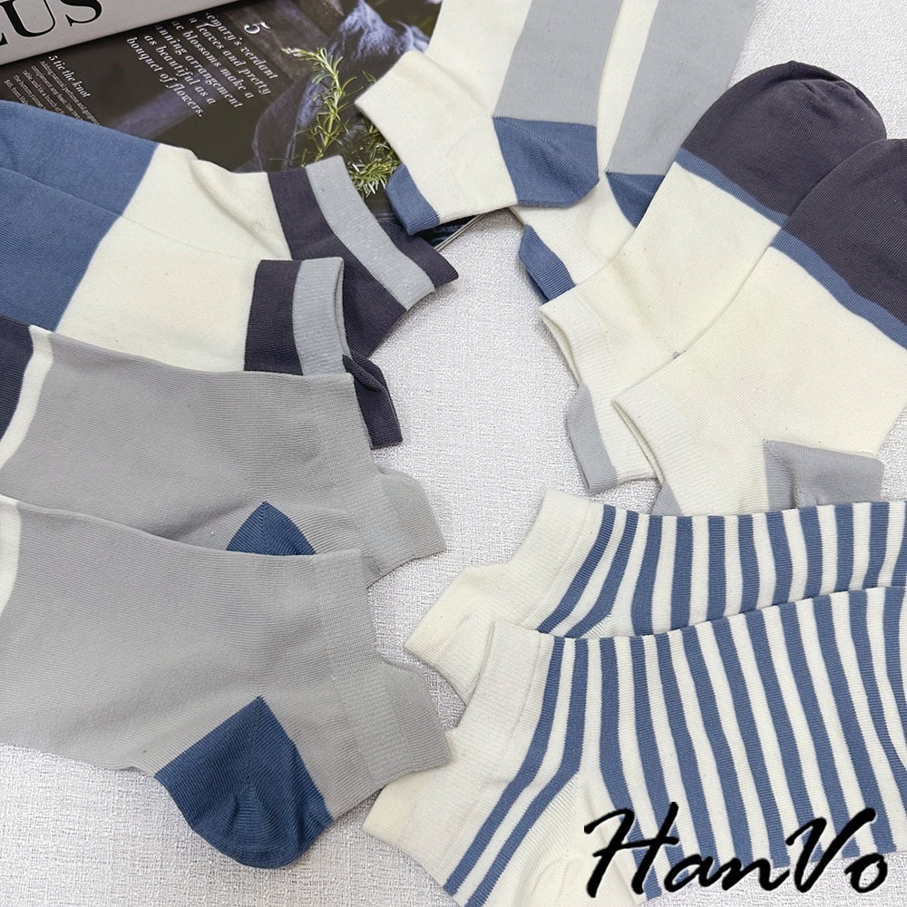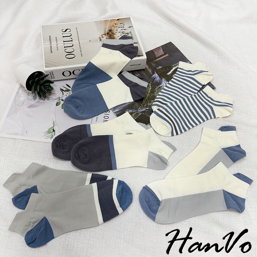 【HanVo】男款條紋拼接棉質短襪 韓系潮流時尚休閒襪 簡約百搭舒適棉質襪 男生配件 B07-7037藍白條紋|簡約灰|藍白灰|上白灰底|前灰後白HanVo Wear Collection