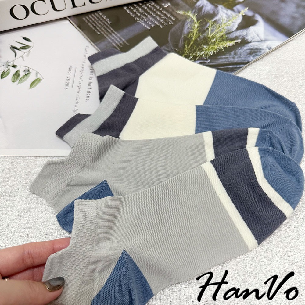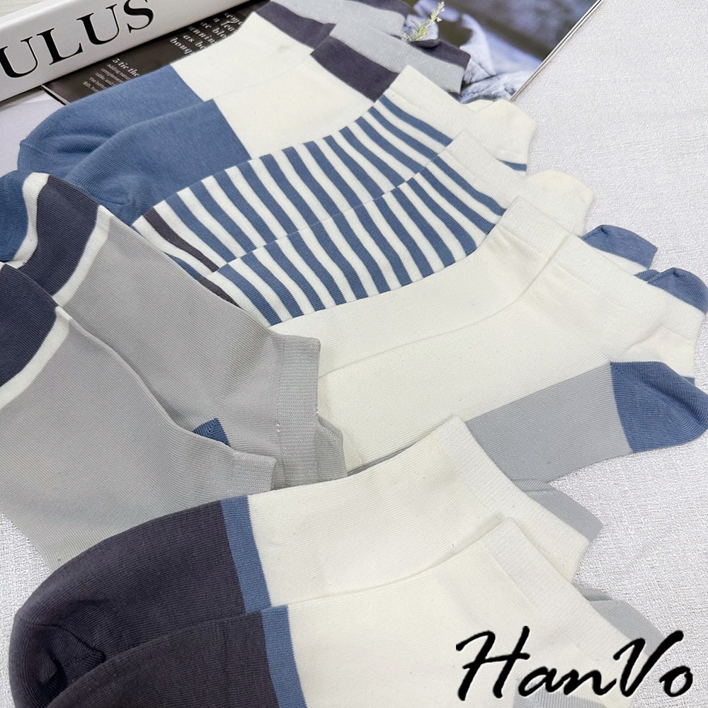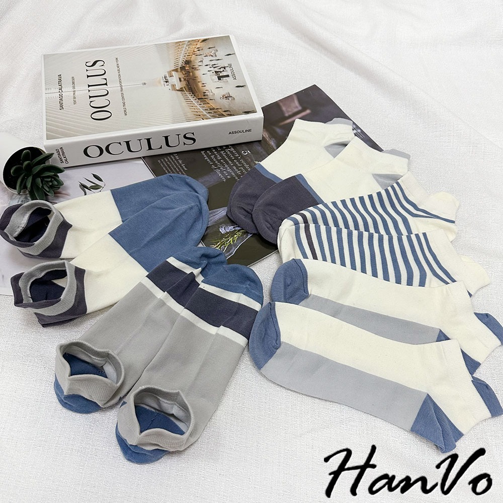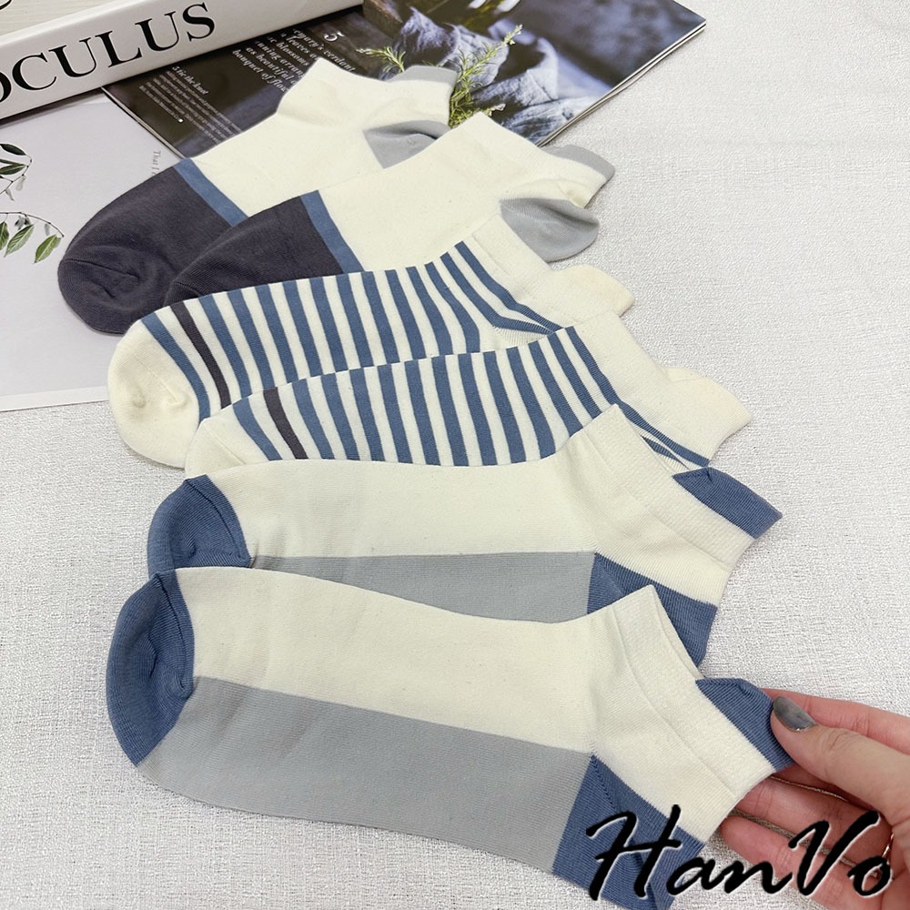 【HanVo】男款條紋拼接棉質短襪 韓系潮流時尚休閒襪 簡約百搭舒適棉質襪 男生配件 B07-7037藍白條紋|簡約灰|藍白灰|上白灰底|前灰後白HanVo Wear Collection