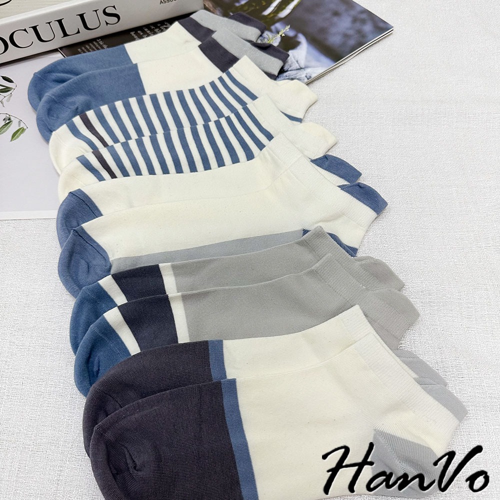 • 【HanVo】男款條紋拼接棉質短襪 韓系潮流時尚休閒襪 簡約百搭舒適棉質襪 男生配件 B07-7037