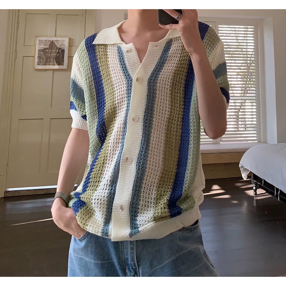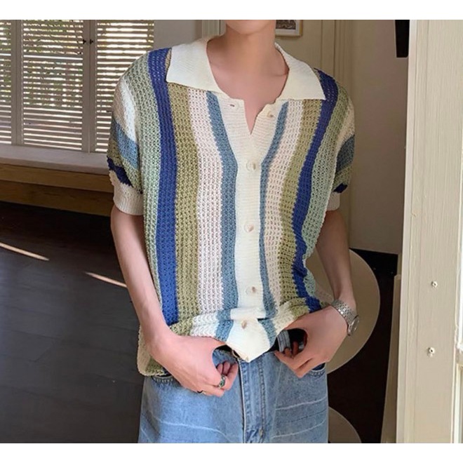 【K-2】日系休閒 針織條紋襯衫 簍空 開襟 洞洞 透視感 復古 條紋襯衫 POLO襯衫 小眾設計 Y2K【JJ919】藍色,M|藍色,L|黃色,M|黃色,LShirtsK-2 Fashionboy