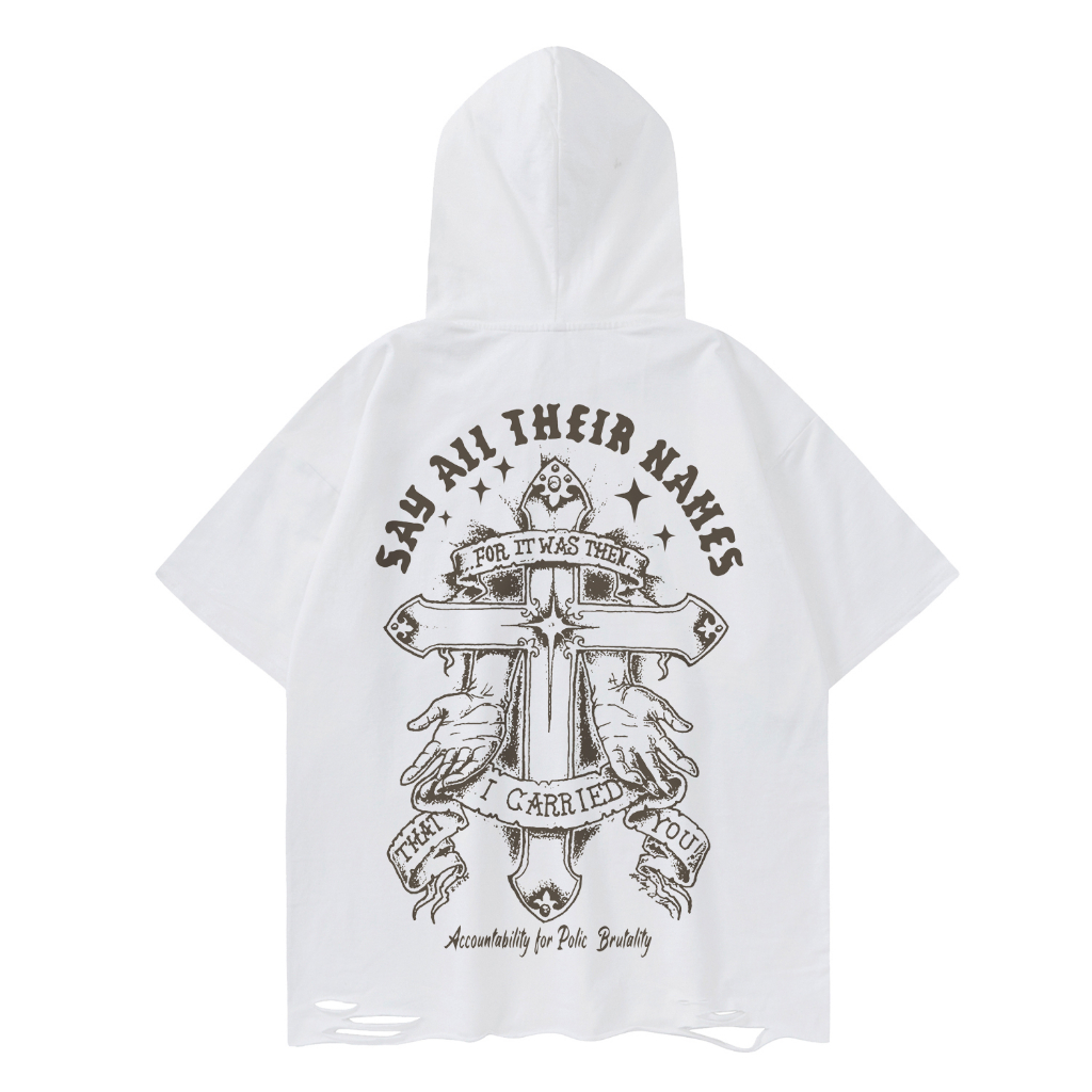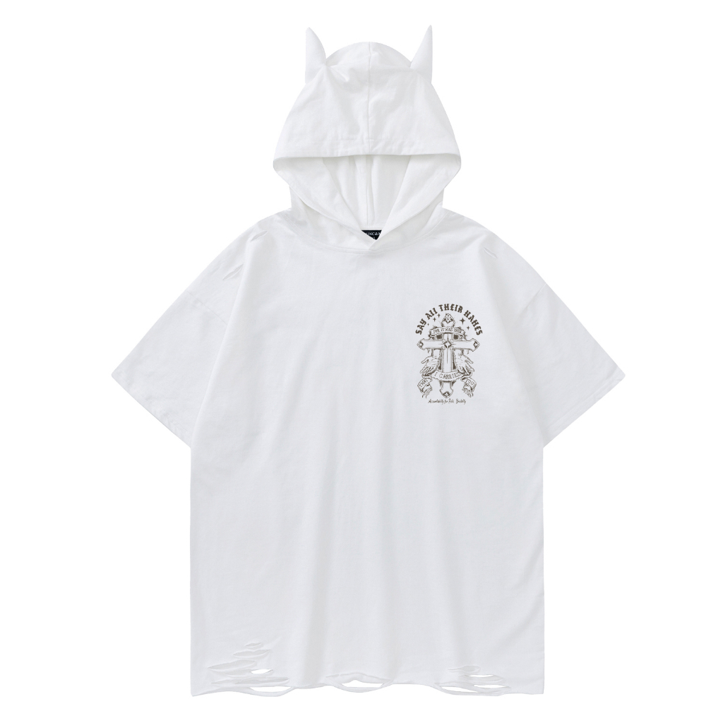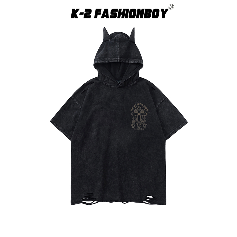 【K-2】小惡魔 帽子 破壞衣襬 十字架 水洗 短袖上衣 連帽短袖 暗黑TRAP風 穿搭客 男女不拘【AMT2301】黑色,M|黑色,L|黑色,XL|白色,M|白色,L|白色,XLHoodiesK-2 Fashionboy