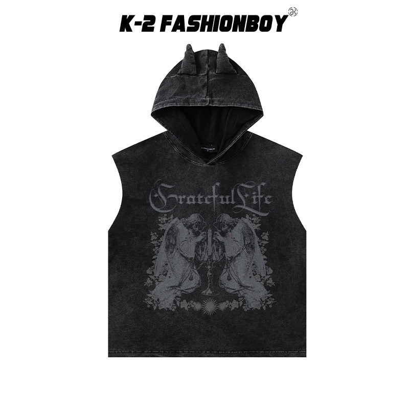 【K-2】歌德字 雙天使 蠟燭 小惡魔角 連帽背心 水洗背心 穿搭 男女不拘 寬鬆落肩 潮流【JLMBX2334】黑,L|黑,XL|白,M|白,L|白,XL|黑,MTanksK-2 Fashionboy
