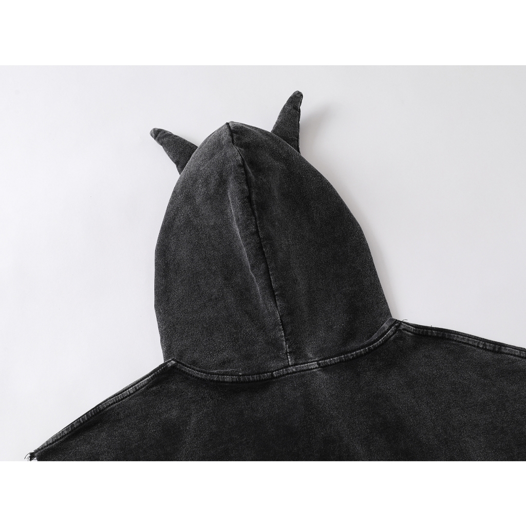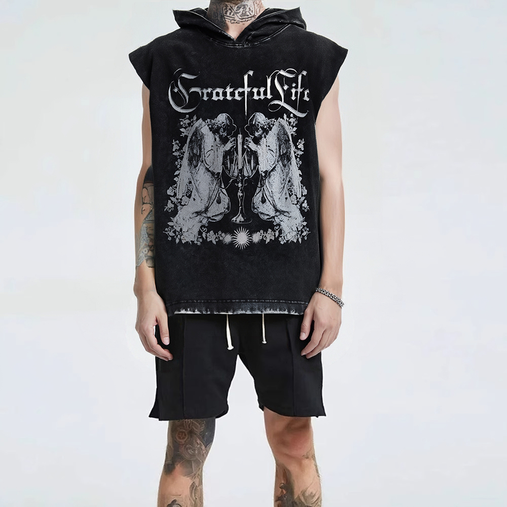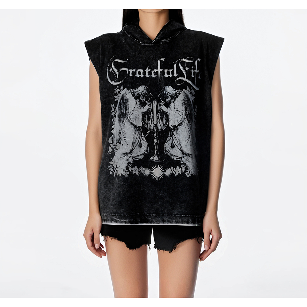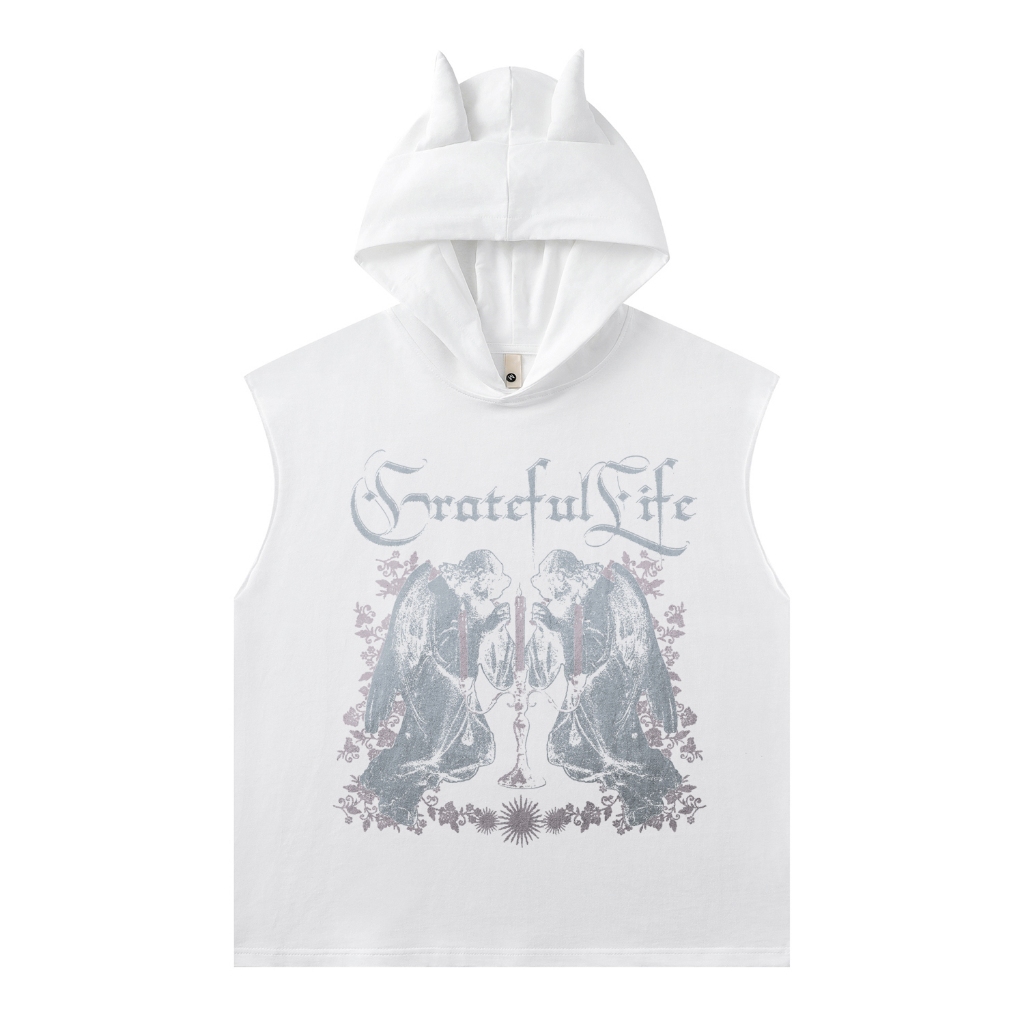 【K-2】歌德字 雙天使 蠟燭 小惡魔角 連帽背心 水洗背心 穿搭 男女不拘 寬鬆落肩 潮流【JLMBX2334】