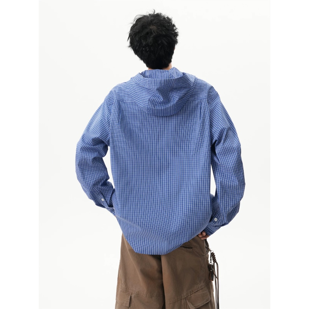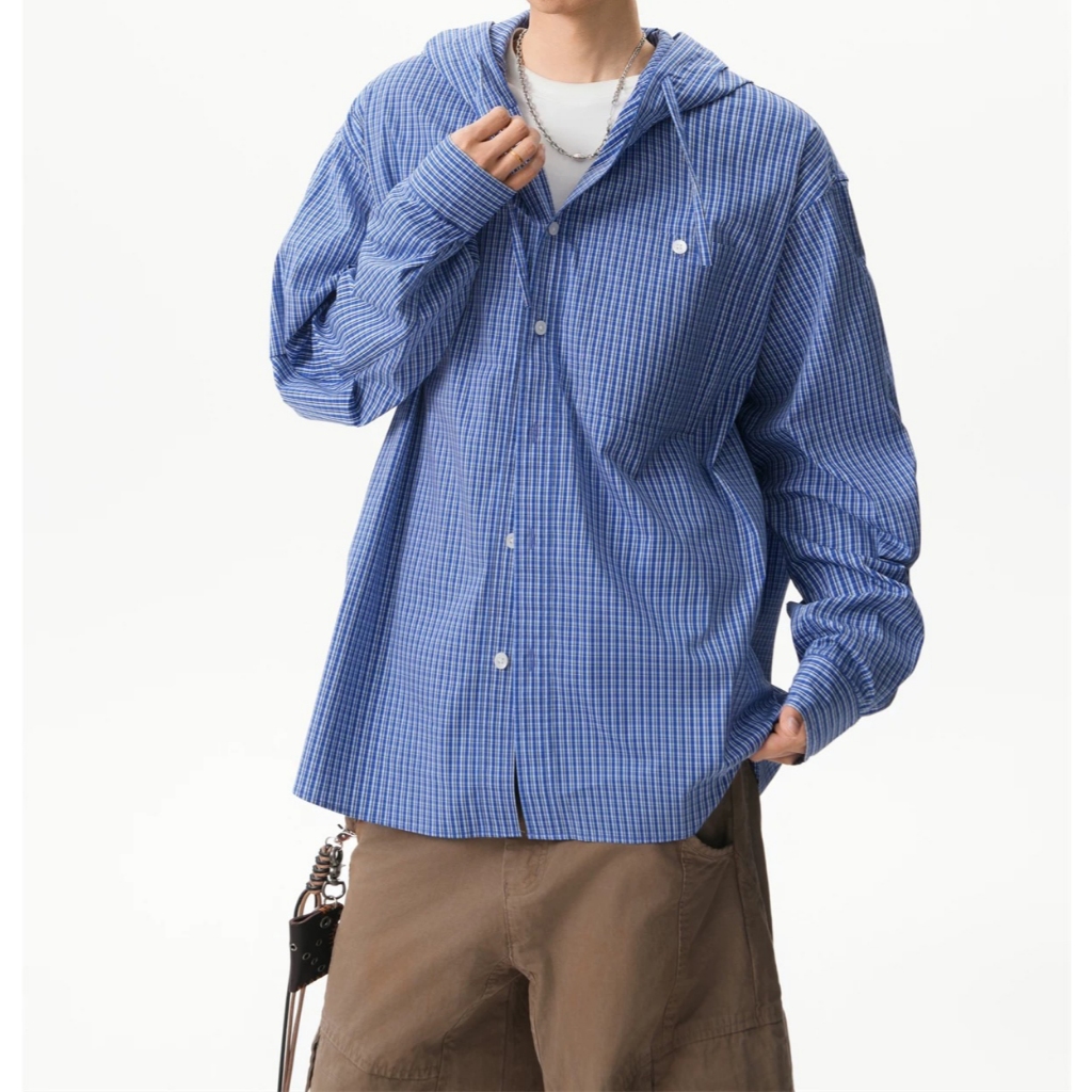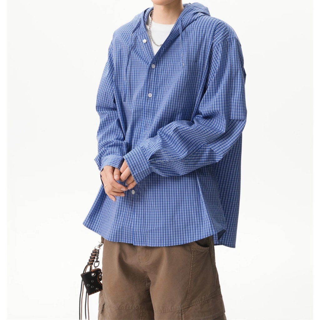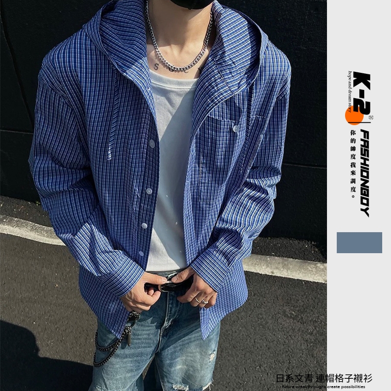 【K-2】日系復古 格子襯衫 連帽襯衫 藍色襯衫 格紋襯衫 小格子 長袖襯衫 Y2K襯衫 日系 復古 K2【J7011】M|L|XLShirtsK-2 Fashionboy