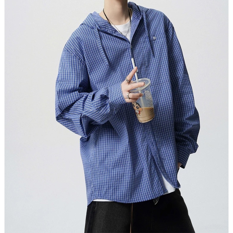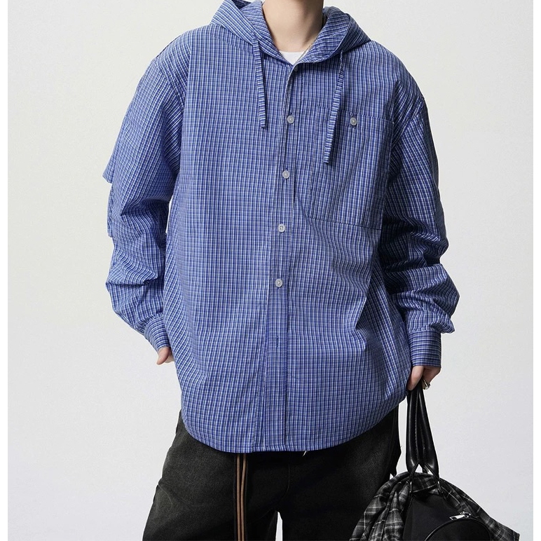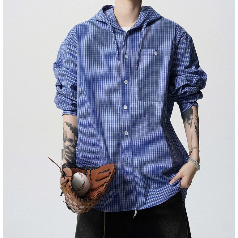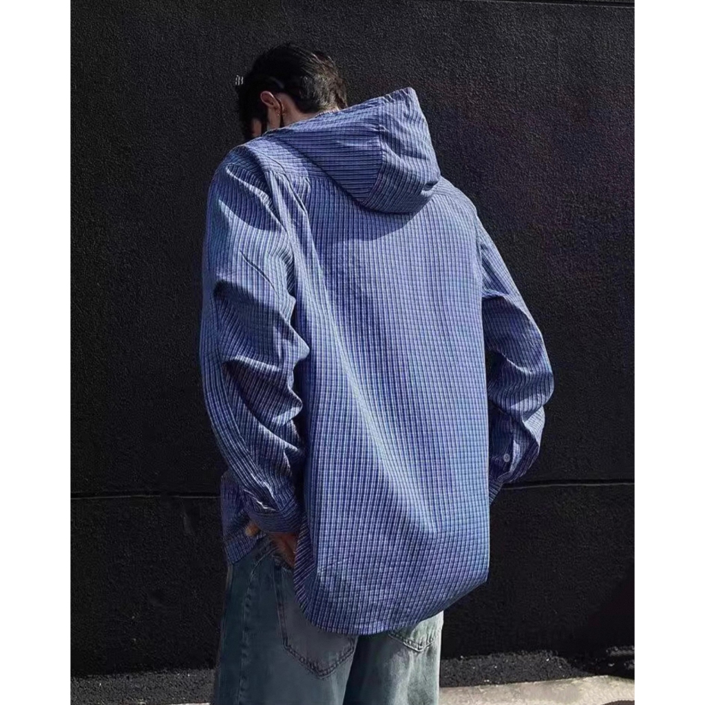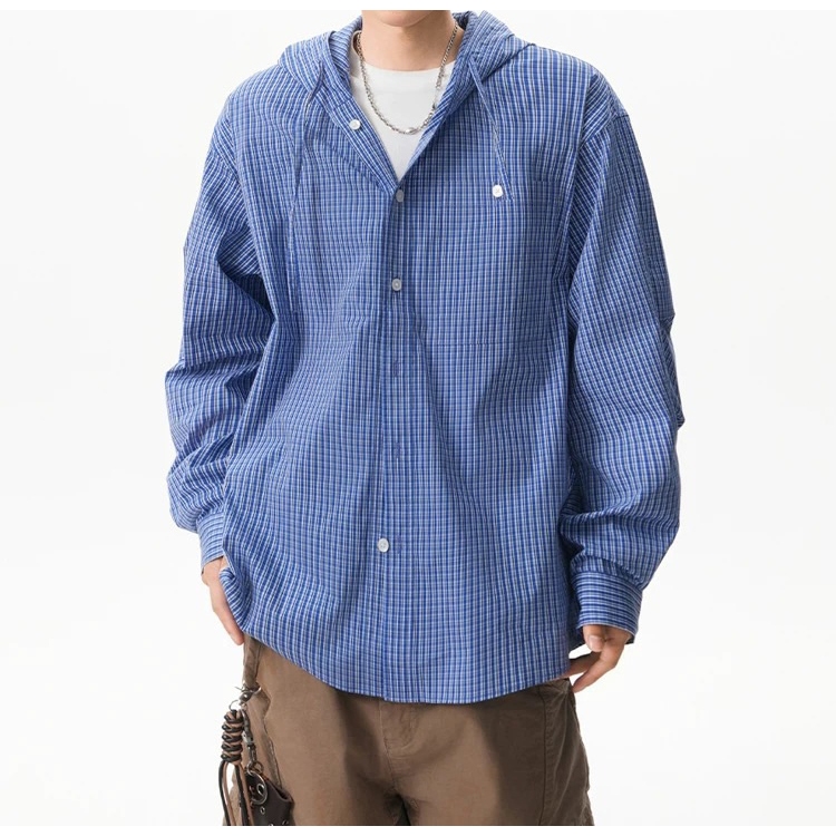【K-2】日系復古 格子襯衫 連帽襯衫 藍色襯衫 格紋襯衫 小格子 長袖襯衫 Y2K襯衫 日系 復古 K2【J7011】M|L|XLShirtsK-2 Fashionboy