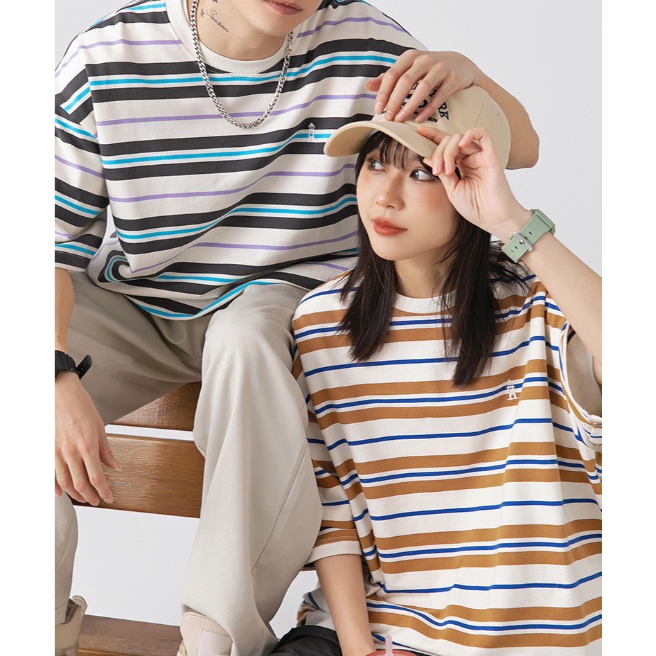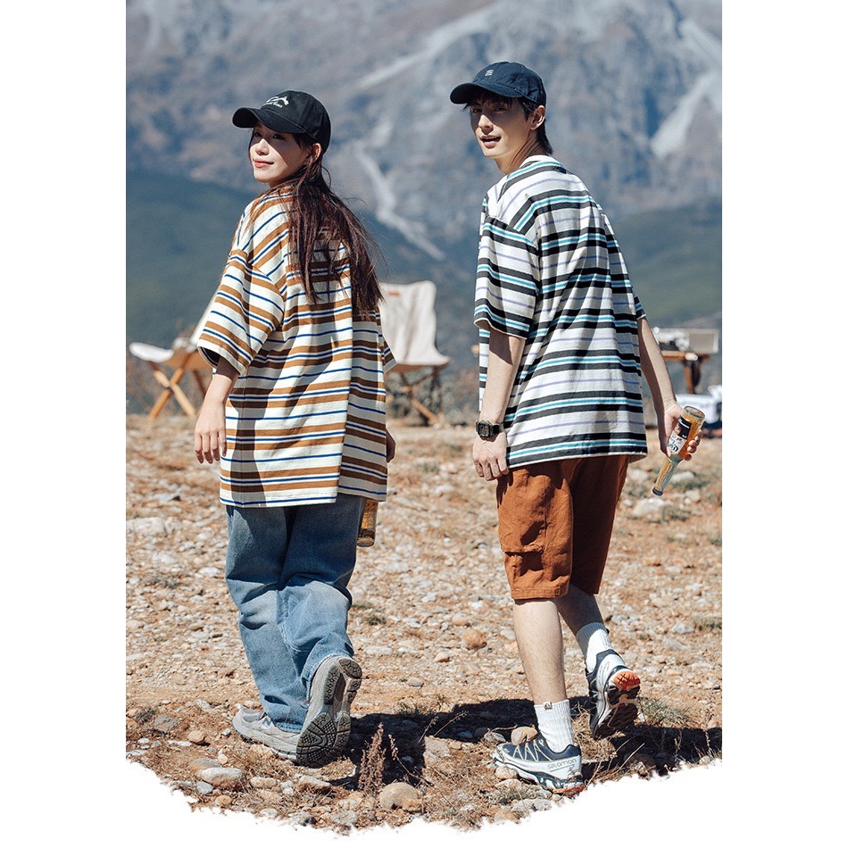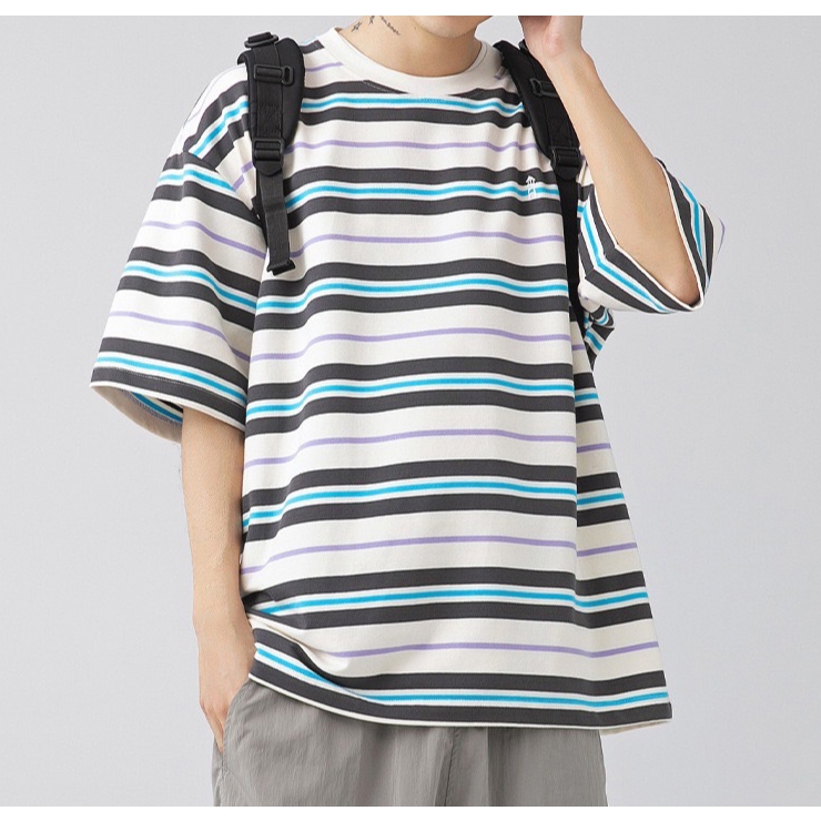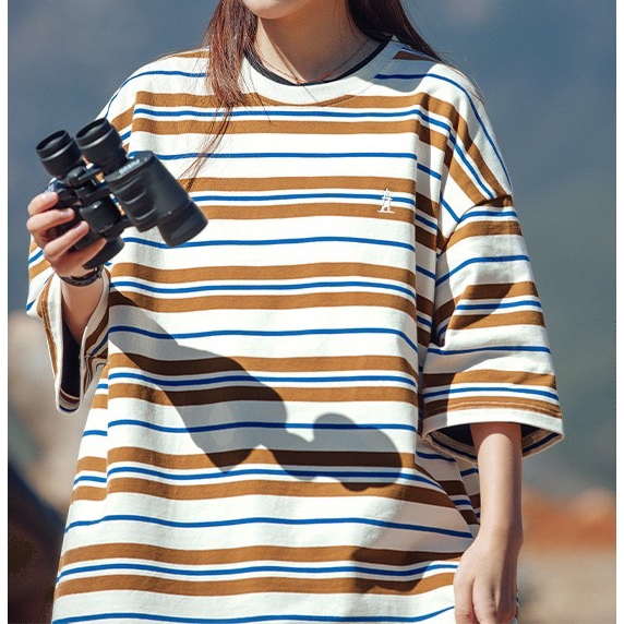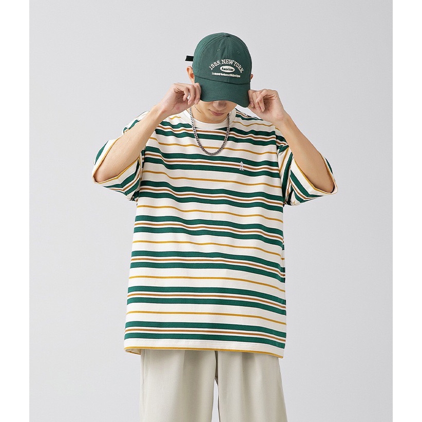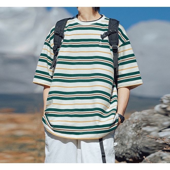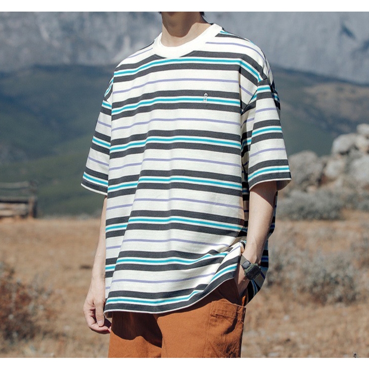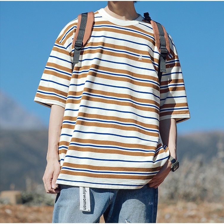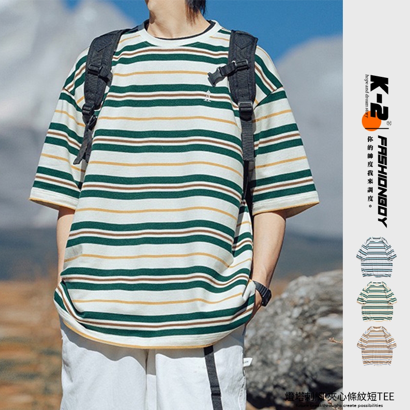 【K-2】日系條紋短T 燈塔刺繡 小LOGO 夾心條紋 落肩 寬鬆 短T 條紋T 短袖 上衣 復古 Y2K【W1724】咖色,L|咖色,XL|咖色,XXL|綠色,L|綠色,XL|綠色,XXL|藍色,L|藍色,XL|藍色,XXLT-ShirtsK-2 Fashionboy