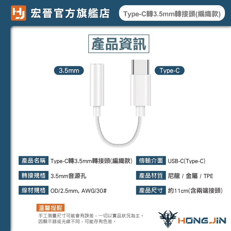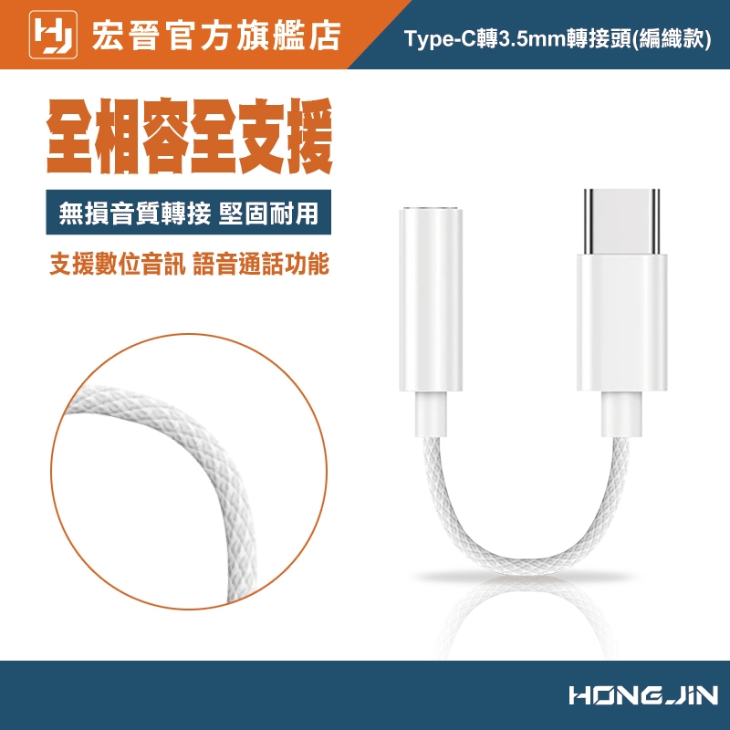 宏晉 Type-C轉3.5mm 編織款 轉接頭 音頻轉接 hifi耳機線 聽歌 全相容 可語音 TYPE-C轉AUXType-C轉3.5mm編織款(全支援)|📌Cables, Chargers & ConvertersHONG JIN 宏晉 |3C資訊廣場